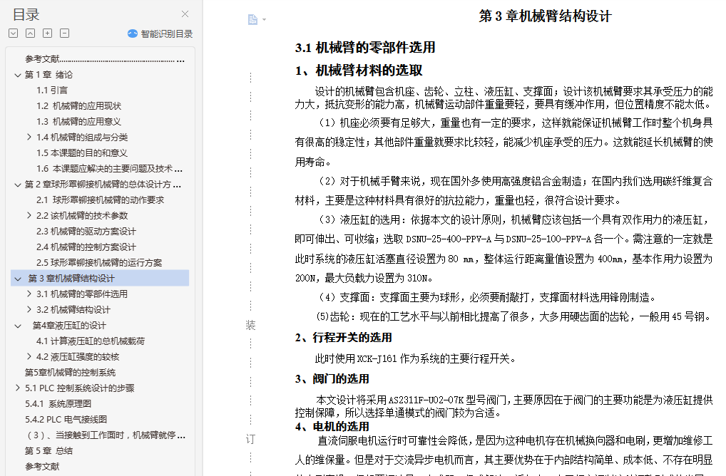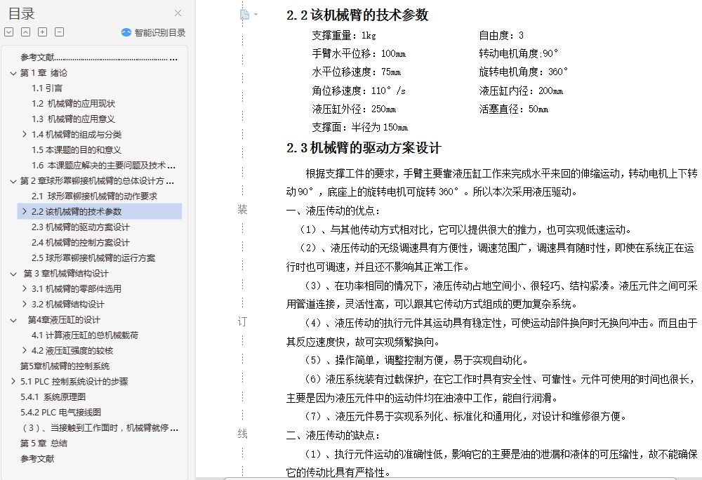 对于整个机械臂的总体方案设计,主要是基于腰座模式的构造、臂结构、执行器、传动系统等进行详细设计,且在设计过程中深入分析系统的执行能力,并说明其具体执行步骤。与此同时,依据相关参考资料内容,从理论分析方面对气压系统和控制系统进行论证。在对机械手的PLC控制进行设计时,预先设置好需要的相应参数。最终通过对控制系统内部电路的详细分析和设计,编制出相应的系统控制程序。