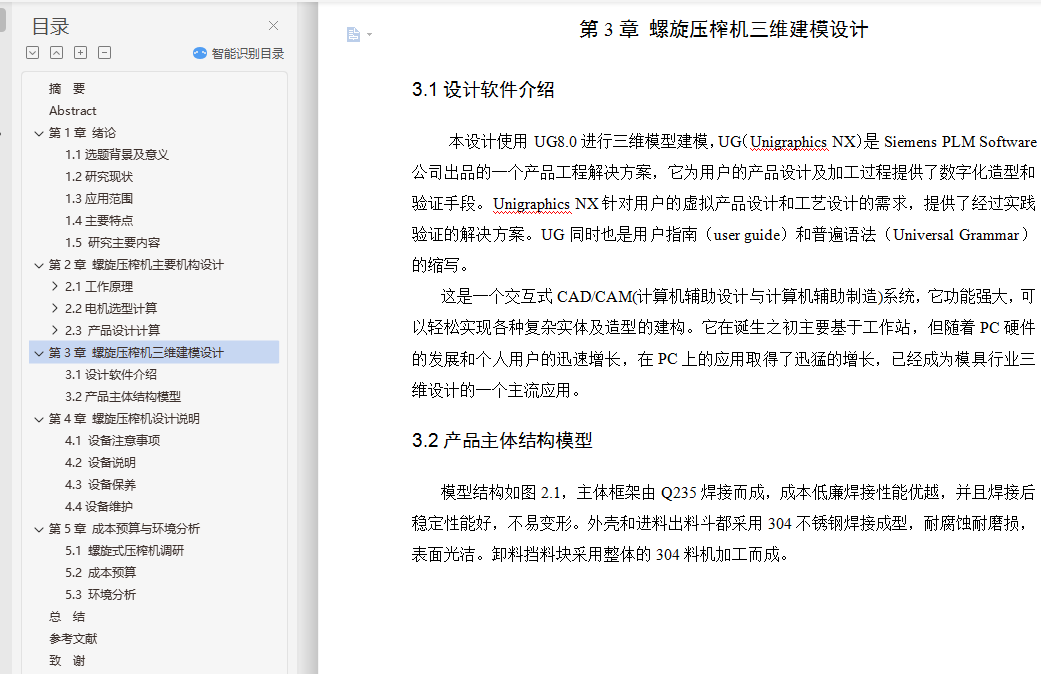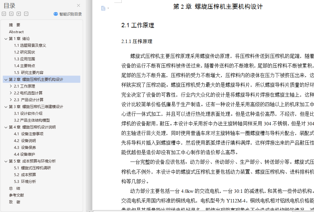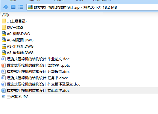 本设计主要是对螺旋压榨机的总体结构设计。其中包括压榨部分,传动部分,机架部分,出油装置及进料等的结构设计。包括对输入端电动机功率/转速的选择。带及带轮的选择及设计。变速箱中齿轮的设计,轴的设计,轴承、键、联轴器的选择及相关的计算、校核。榨螺榨笼的设计等。其中榨螺和榨笼是压榨机的主要工作部件。