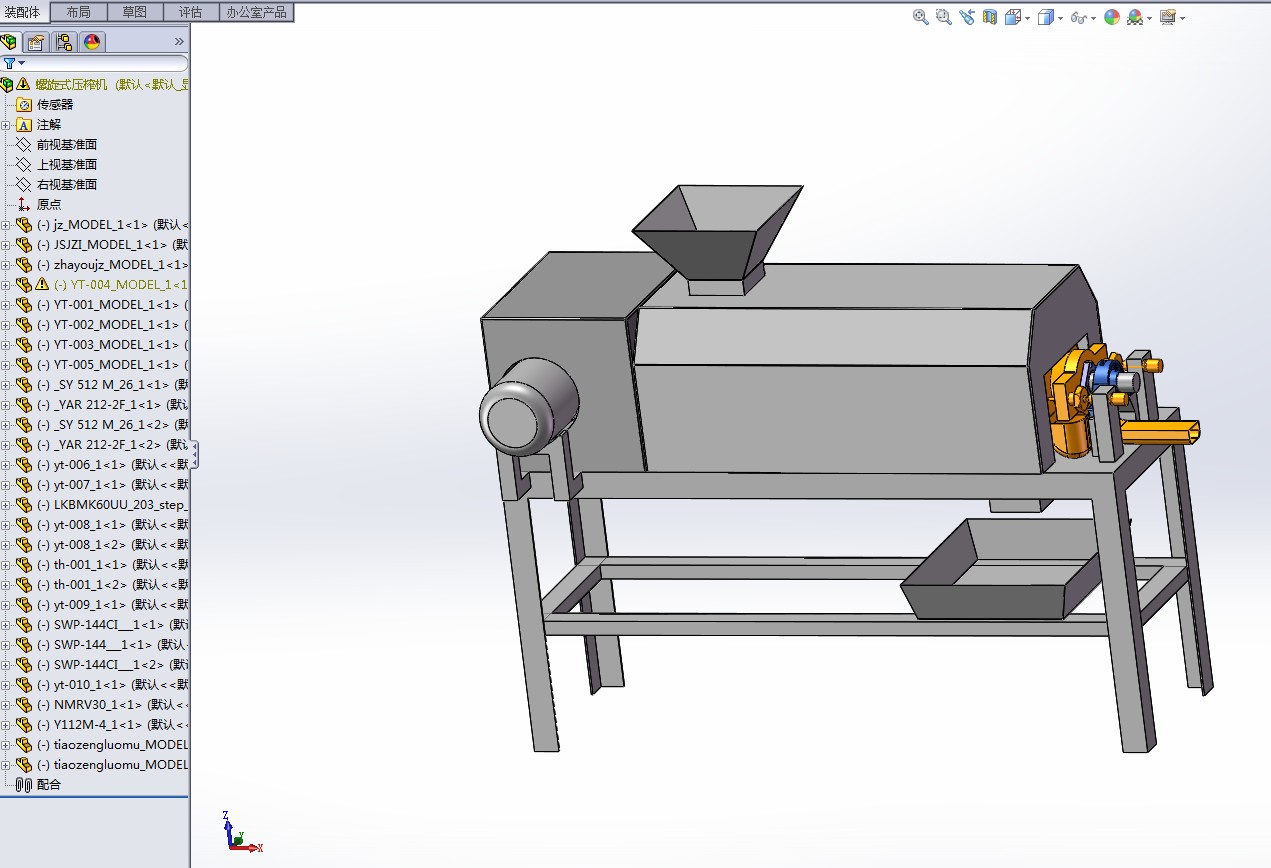 The screw press used to be a mainframe in oil production. Even in the modern leaching process,the oil with high oil content is mostly prepared by pre-pressing-leaching process,so the pre-press,the screw press,is still an important part in the production of oils and fats. The structure of screw press directly affects the quantity and quality of oil production. The working part of the press is composed of a screw shaft and a press cage,and the material embryo is squeezed through the space between the screw shaft and the press cage-the blast chamber. Therefore,they are the "heart" of the press,their structure directly affects the performance of the press. This article has passed De-press the material,then compare the structure of the press,design its structure,screw design is the main body of the whole design,through the selection of the pressing material and production,the design process of the screw rod is obtained. In this paper,two-stage deceleration drive is used to stabilize the operation of the machine. Through the whole machine power,torque,the final determination of the motor. It also checks the critical components of the entire design to allow the machine to function properly.