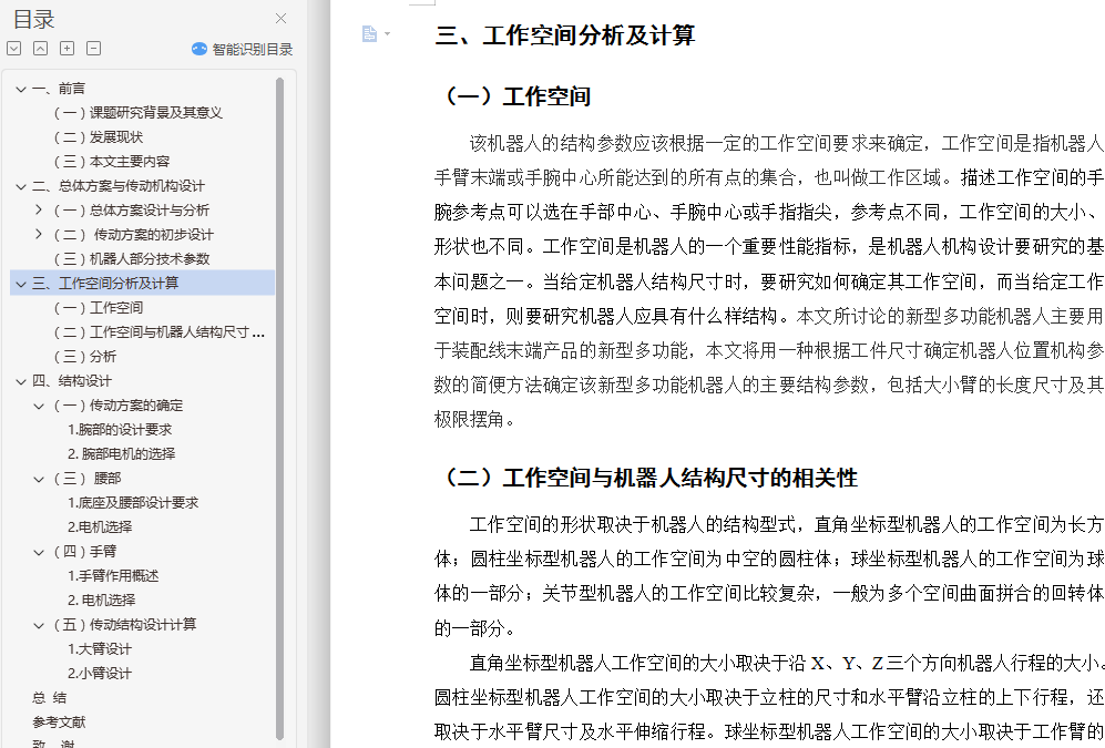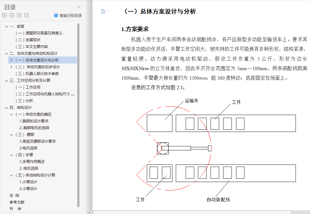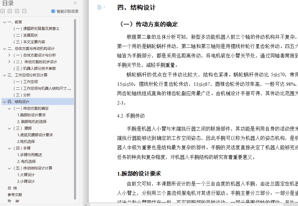随着工业机器人技术不断发展壮大及人们生活水平的不断提高,文化生活日益丰富多彩,未来各种专业服务机器人和家庭用消费机器人将不断贴近人们的生活,其市场将繁荣兴旺,为此我将设计一款6轴智能服务机器人。本次设计的机器人是一种高精度的自动化机械,具有高度的灵活性以及平稳性。所以在设计中我们应当注意其结构工艺的合理性,在材料选择上应当使其具有高强度和轻便的特性。本论文主要对新型多功能6轴小型机器人的驱动方式及各轴的传动方案进行了设计,并对驱动运动的电动机进行了选型;在对其工作空间分析的基础上,对关键的零部件进行了受力分析及强度校核。