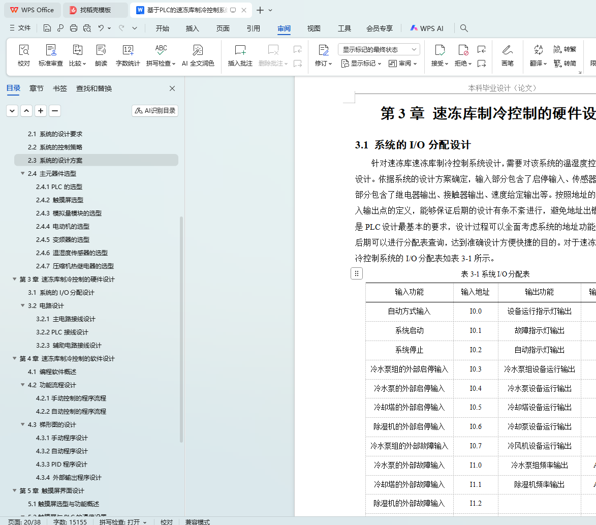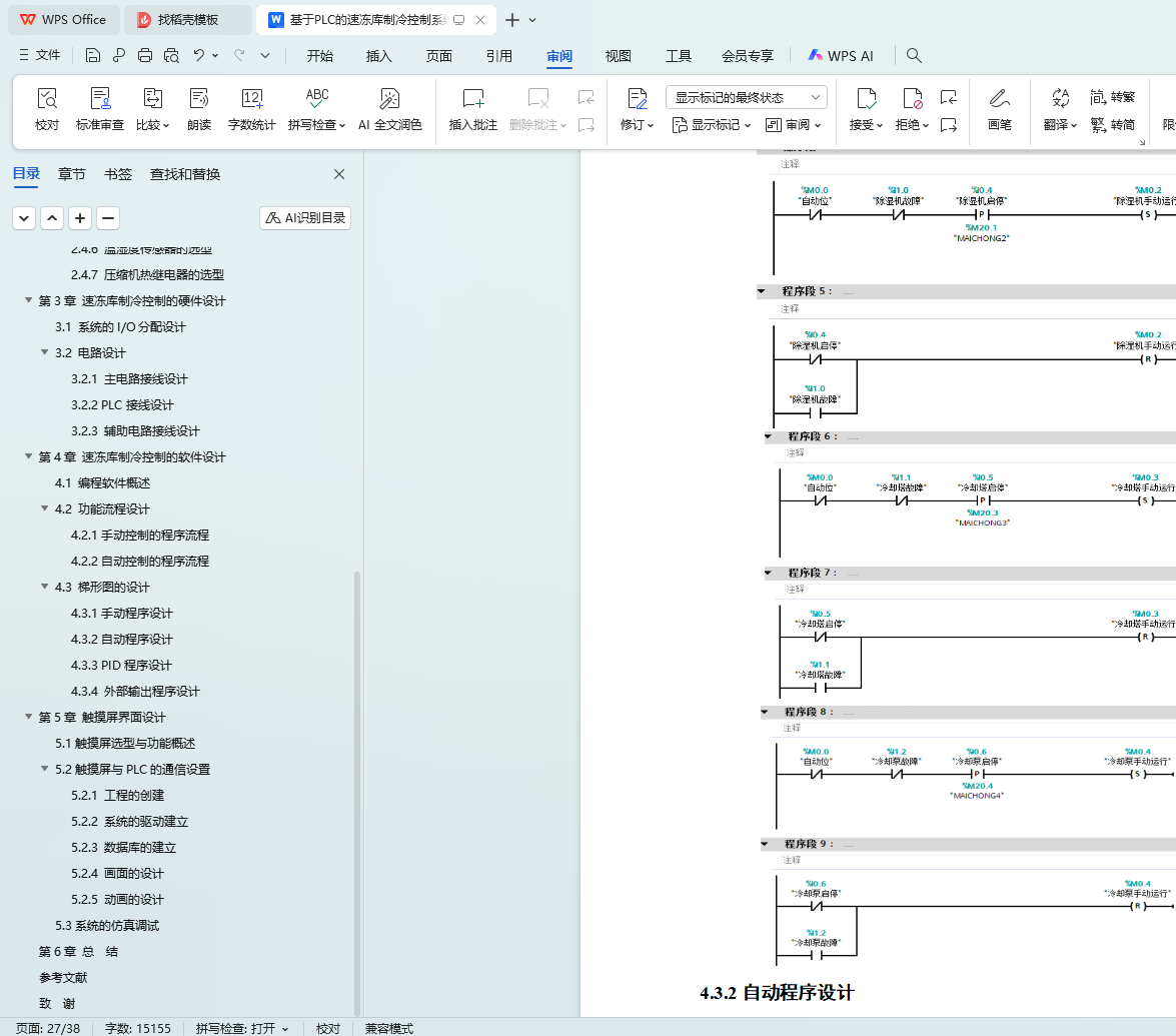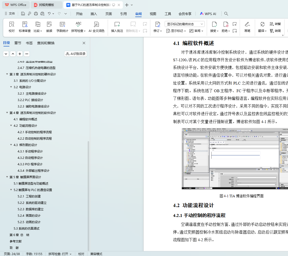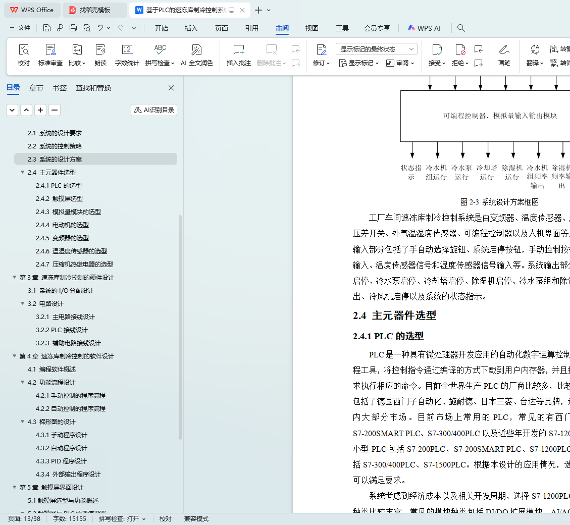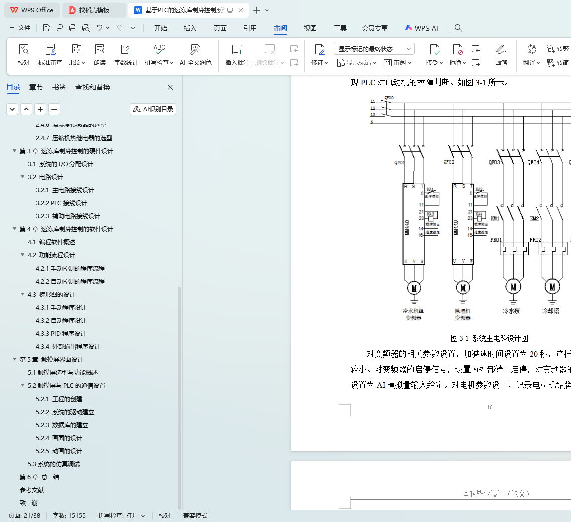 系统采用S7-1200 PLC为核心,结合MM440变频器调节除湿机、冷水泵组等设备,利用接触器控制冷水泵、冷却塔和冷风机。系统实时采集温湿度数据,通过PID算法自动调节控制。硬件方面,合理选型PLC、电动机、变频器及温湿度传感器,选用国产威纶通MT8106IQ触摸屏作为人机界面,详细设计系统电路接线。软件方面,设计手动和自动控制程序流程,完成梯形图设计。同时,设计上位机HMI监控系统,实现远程监控和故障报警功能。