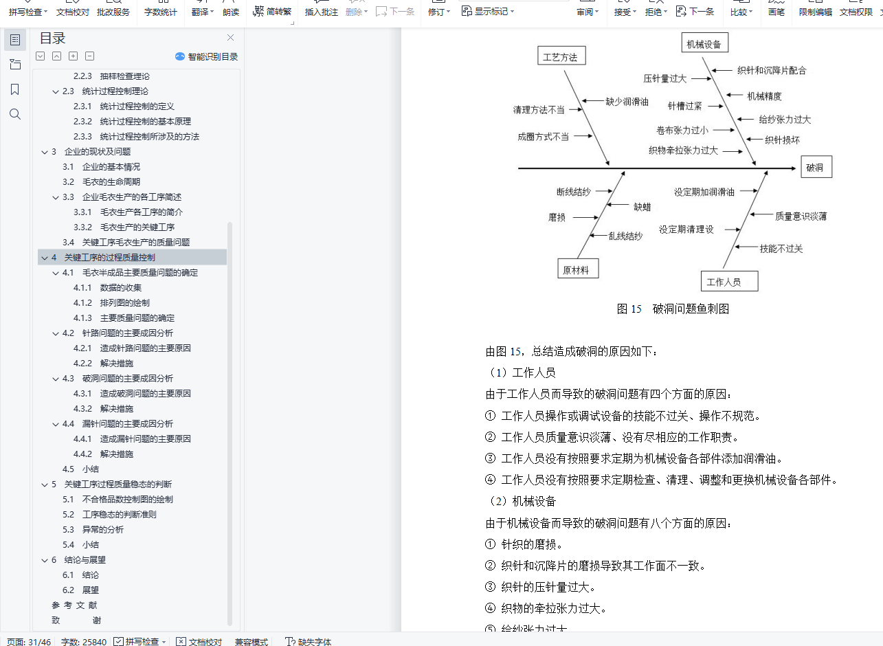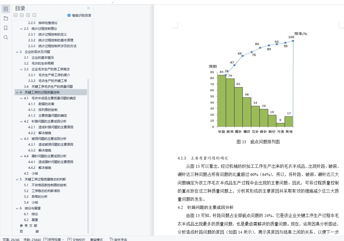 摘 要东莞市作为世界著名的制造业名城,纺织业在其中占有着重要的地位。毛衣的生产工艺虽然不复杂,但由于款式众多,生产批量小且品种变化频繁,毛衣产品的质量问题时有发生。而对于小型纺织企业,由于其半人工半自动的生产方式、质量意识淡薄、管理方法不完善以及事后检验等原因,毛衣产品的质量问题更加突出。这些质量问题已严重制约着小型纺织企业的发展。因此,加强毛衣生产过程的质量控制,提高毛衣产品的质量,对小型纺织企业有深远的意义。本文以东莞市顺昌针织厂为例,重点对该企业毛衣生产的关键工序进行研究,分析该工序生产中毛衣半成品常见的质量问题。然后收集样本数据,运用排列图,找出了该工序生产过程中毛衣半成品的主要质量问题。同时,运用因果分析图法,从人、机、物、法、环五个方面分析产生这些质量问题的原因,并通过生产现场的调研,分析其主要的原因。由此,建立起质量控制点,对其主要原因进行重点的分析,提出相应的措施,解决了该工序生产过程中毛衣半成品的主要质量问题,毛衣产品的质量得到了有效改善。最后,则通过不合格品数控制图对该工序进行生产过程稳态的判断,发现其生产过程中存在的异常情况,调查出原因,并采取有效的措施,解决了这种异常情况。本文通过改善生产中毛衣半成品的主要质量问题以及关键工序稳态的判断,最终达到了提高毛衣半成品质量,保证关键工序过程稳态的目的,并为该企业和其他小型纺织企业提供了生产过程中质量控制的思路和方法。关键词 关键工序 过程质量 控制 研究A Research of Process Quality Control in Dongguan Shunchang KnittingAbstract: As the world famous manufacturing city-Dongguan, textile industry takes an important part in the manufacturing. Although the sweater production process is not complicated, because of many styles, the production of small batch and the variety change more frequently, the quality problems of the sweater happen frequently. For small textile enterprises, their semiautomatic mode of production, quality consciousness, lack of management methods and check afterwards are influencing the quality more seriously. These quality problems have seriously restricted the development of small textile enterprises. So there is profound significance for these small textile enterprises to strengthen the production process quality control and improve the quality of the sweater.This article taking Dongguan Shunchang knitting factory as example, focuses on the key working procedure of this enterprise and analyzes its common quality problems of semi-finished sweater during the production. Then this article collects the sample data and uses the Pareto diagram to find out the main quality problems of the semi-finished sweater in this process. Meanwhile, this article uses fishbone chart to analyze the cause of these quality problems in 4M1E. Then through the investigation of production site, this article analyzes the main cause of these quality problems, sets up quality control points and analyzes the main cause of these quality problems. Then corresponding measures are put forward. Through these measures, the main quality problems of the semi-finished sweater are solved, and the quality of the sweater has been improved effectively. Finally, this article uses Pn control chart to judge the steady state of the production process and find out the abnormal condition in the production process. Then by investigating the reasons and taking effective measures, this article solves this abnormal condition.By improving the main quality problems of the semi-finished sweater and judging the steady state of the key working procedure, this research finally achieves the purpose of improving the quality of semi-finished sweater and ensuring the process steady state of the key working procedure. Meanwhile, this article provides quality control ideas and methods in the production process for this enterprise or small sweater manufacturing.Key words: the key working procedure process quality control research目 录1 前言 11.1 研究的目的和意义 11.2 国内外研究现状 11.2.1 国外研究现状 11.2.2 国内研究现状 31.3 研究的内容和方法 51.3.1 研究内容 51.3.2 研究方法 62 过程质量控制研究的理论基础 72.1 过程质量控制相关概念 72.2 过程质量控制的方法 82.2.1 过程质量控制的管理工具 82.2.2 关键工序的过程质量控制 92.2.3 抽样检查理论 102.3 统计过程控制理论 112.3.1 统计过程控制的定义 112.3.2 统计过程控制的基本原理 112.3.3 统计过程控制所涉及的方法 123 企业的现状及问题 133.1 企业的基本情况 133.2 毛衣的生命周期 143.3 企业毛衣生产的各工序简述 153.3.1 毛衣生产各工序的简介 153.3.2 毛衣生产的关键工序 173.4 关键工序毛衣生产的质量问题 184 关键工序的过程质量控制 194.1 毛衣半成品主要质量问题的确定 204.1.1 数据的收集 204.1.2 排列图的绘制 214.1.3 主要质量问题的确定 224.2 针路问题的主要成因分析 224.2.1 造成针路问题的主要原因 244.2.2 解决措施 254.3 破洞问题的主要成因分析 264.3.1 造成破洞问题的主要原因 284.3.2 解决措施 284.4 漏针问题的主要成因分析 294.4.1 造成漏针问题的主要原因 304.4.2 解决措施 314.5 小结 325 关键工序过程质量稳态的判断 325.1 不合格品数控制图的绘制 325.2 工序稳态的判断准则 355.3 异常的分析 365.4 小结 366 结论与展望 366.1 结论 366.2 展望 37参考文献 39致谢 41