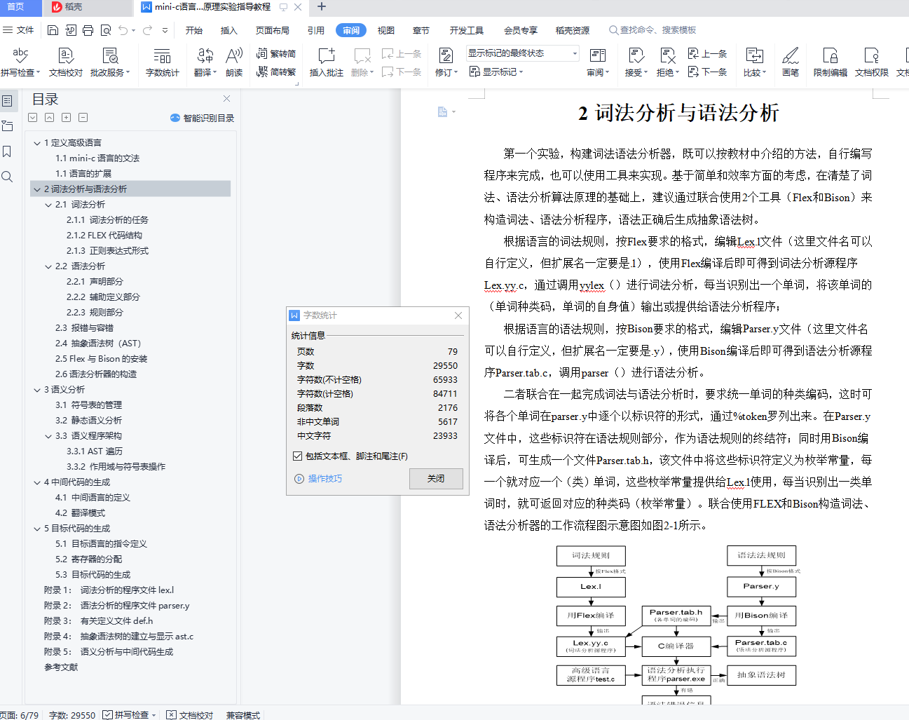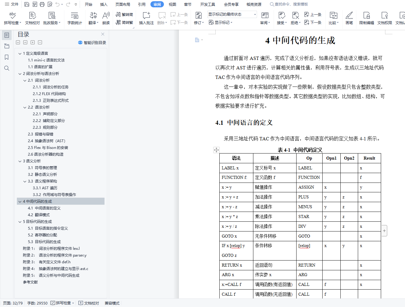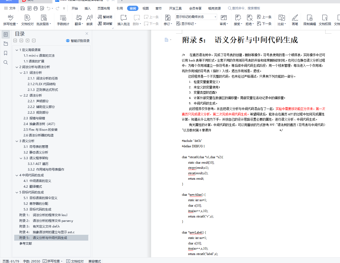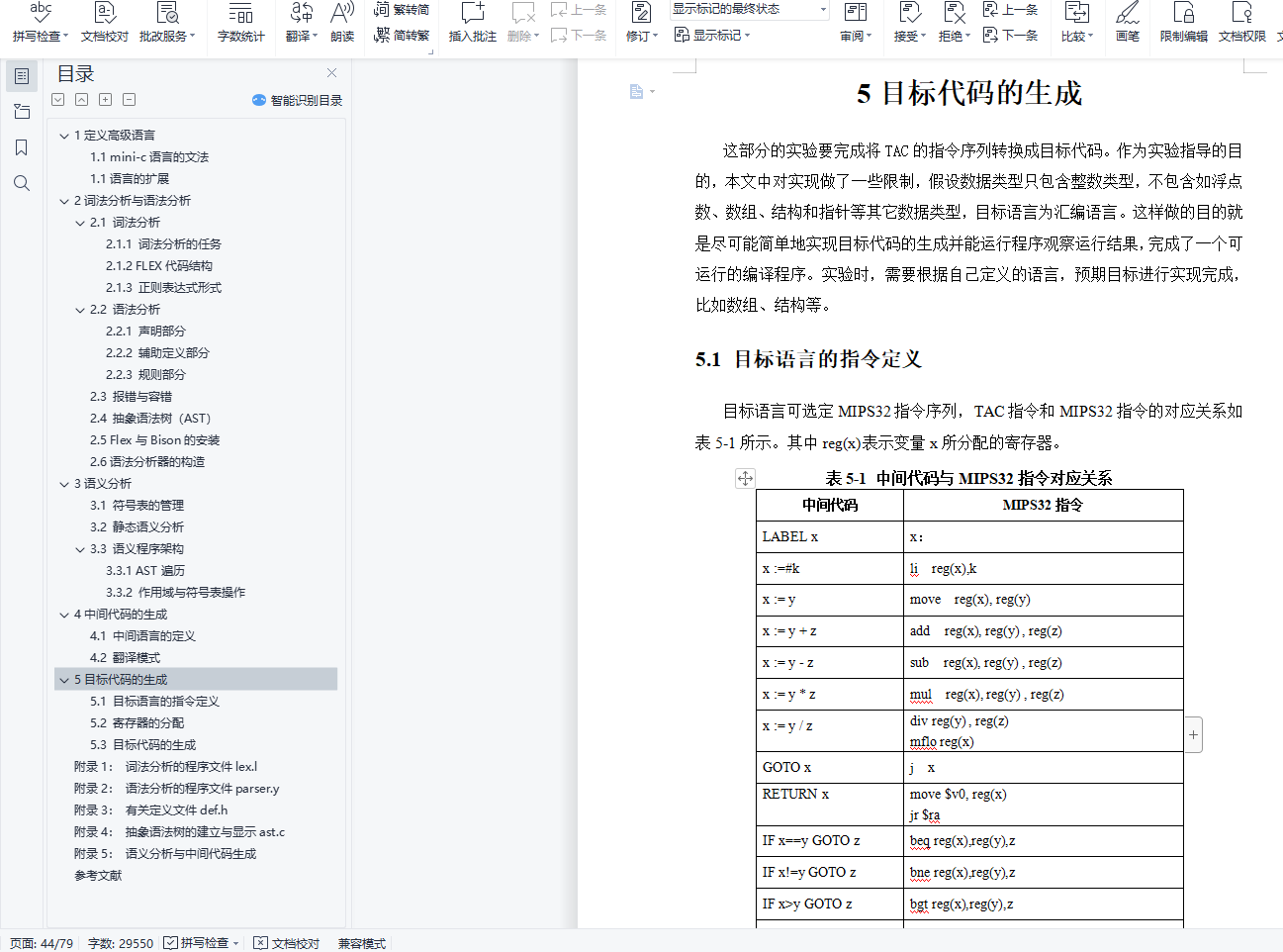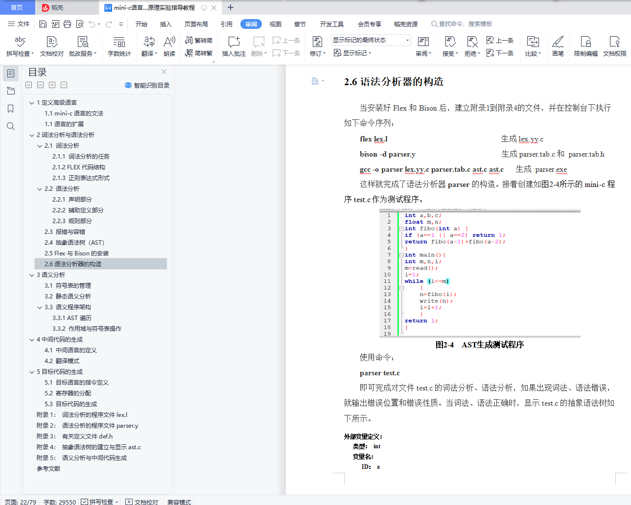 本实验指导教程作为编译原理课程的课程实验和课程设计的参考,对编译器的构造给出了一些参考性的指导意见。本文档不是一个完整使用手册,所以在阅读时,还需要阅读参考文献,并上网查询相关的资料,最后根据自己的理解,选择一种适合自己的技术线路,完成自定义的高级语言编译器的构造。目录1定义高级语言 21.1 mini-c语言的文法 31.1语言的扩展 32词法分析与语法分析 62.1 词法分析 72.1.1 词法分析的任务 72.1.2 FLEX代码结构 82.1.3 正则表达式形式 92.2 语法分析 122.2.1 声明部分 122.2.2 辅助定义部分 122.2.3 规则部分 152.3 报错与容错 162.4 抽象语法树(AST) 182.5 Flex与Bison的安装 202.6语法分析器的构造 223语义分析 263.1 符号表的管理 273.2 静态语义分析 273.3 语义程序架构 283.3.1 AST遍历 283.3.2 作用域与符号表操作 294中间代码的生成 324.1 中间语言的定义 324.2 翻译模式 335目标代码的生成 445.1 目标语言的指令定义 445.2 寄存器的分配 465.3 目标代码的生成 46附录1: 词法分析的程序文件lex.l 49附录2: 语法分析的程序文件parser.y 51附录3: 有关定义文件def.h 55附录4: 抽象语法树的建立与显示ast.c 57附录5: 语义分析与中间代码生成 61参考文献 791定义高级语言编译课程的实验,第一个需要完成的工作,就是要定义一个待实现其编译器的语言,用上下文无关文法定义该语言,并给该语言起一个有意义的名称。后续的工作就是完成该语言的编译器。1.1 mini-c语言的文法本节给出的是一个简化的C语言的文法,不妨将其称为mini-c。在后续的章节中,主要介绍mini-c的编译过程,给出mini-c语言编译程序构造各阶段实现的指导建议,借此理掌握解编译实现的主要技术线路。Mini-c文法如下:G[program]:program → ExtDefListExtDefList→ExtDef ExtDefList | εExtDef→Specifier ExtDecList ; |Specifier FunDec CompStSpecifier→int | floatExtDecList→VarDec | VarDec , ExtDecListVarDec→IDFucDec→ID ( VarList ) | ID ( )VarList→ParamDec , VarList | ParamDecParamDec→Specifier VarDecCompSt→{ DefList StmList }StmList→Stmt StmList | εStmt→Exp ; | CompSt | return Exp ;| if ( Exp ) Stmt | if ( Exp ) Stmt else Stmt | while ( Exp ) StmtDefList→Def DefList | εDef→Specifier DecList ;DecList→Dec | Dec , DecListDec→VarDec | VarDec = ExpExp →Exp =Exp | Exp && Exp | Exp || Exp | Exp < Exp | Exp <= Exp| Exp == Exp | Exp != Exp | Exp > Exp | Exp >= Exp| Exp + Exp | Exp - Exp | Exp * Exp | Exp / Exp | ID | INT | FLOAT| ( Exp ) | - Exp | ! Exp | ID ( Args ) | ID ( )Args→Exp , Args | Exp以上只是给出了一个很简单的语言文法,数据类型只支持整型和浮点;函数只有定义,没有原型声明;以及不支持数组,结构等等。