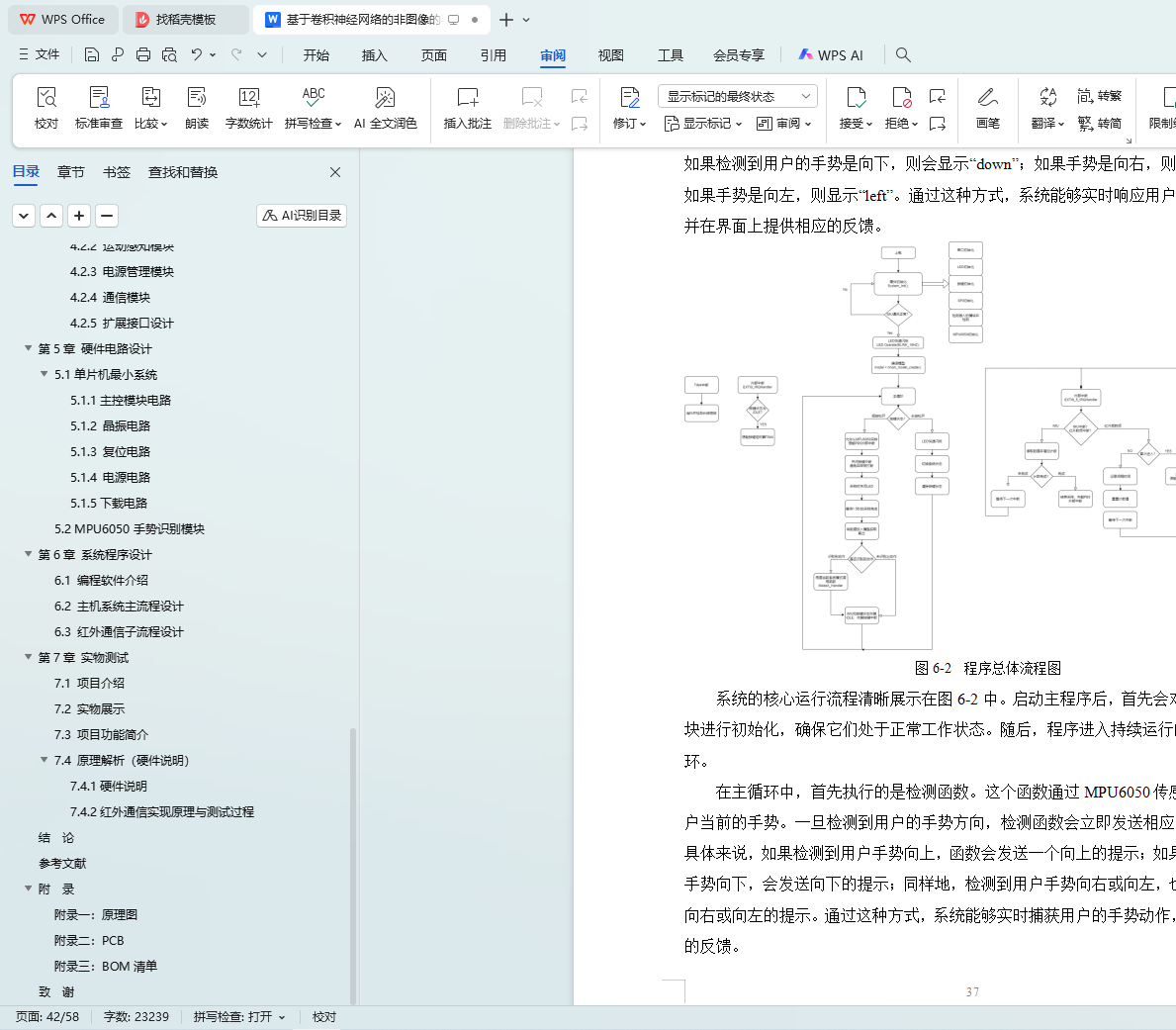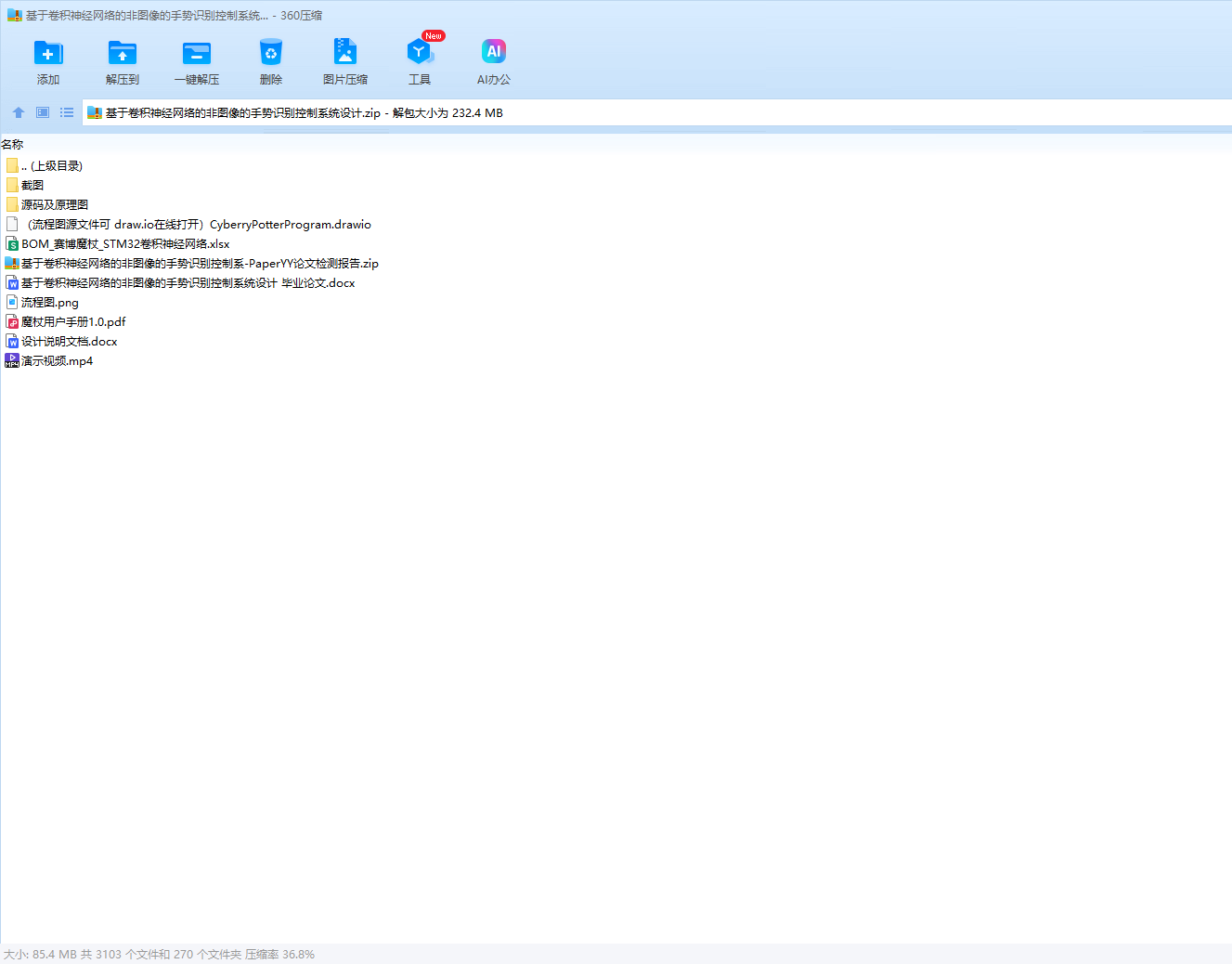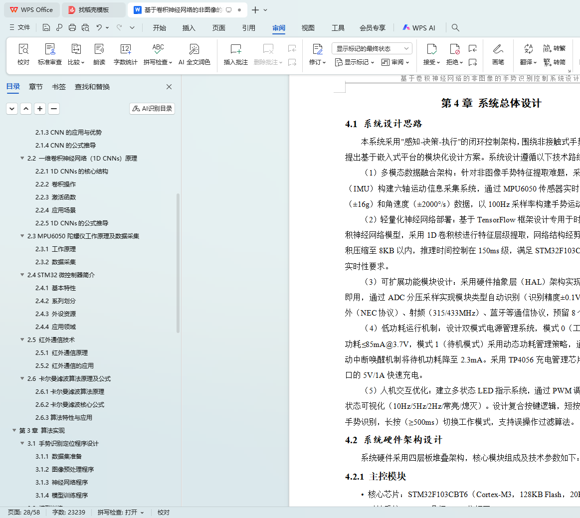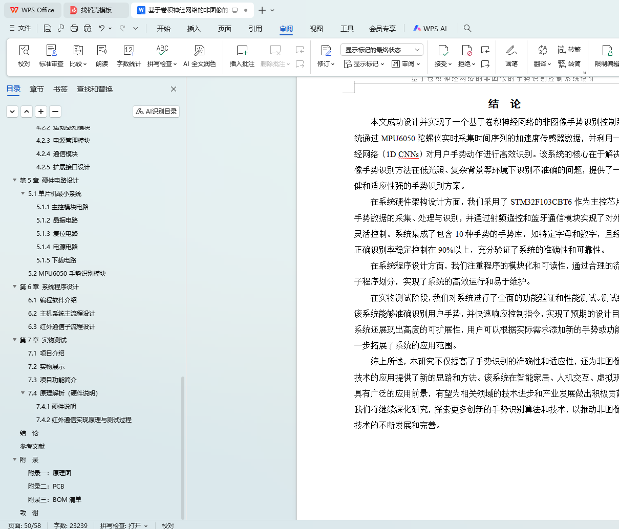 设计采用了STM32F103CBT6作为主控芯片,实现了手势数据的采集、处理与识别,以及基于识别结果对外部设备的控制。系统集成了射频遥控和蓝牙通信模块,能够识别包含10种手势的手势库,如特定字母和数字,且正确识别率控制在90%以上。此外,系统还具备高度的可扩展性,用户可以根据需要添加新的手势或功能模块。本研究不仅提高了手势识别的准确性和适应性,也为非图像手势识别技术的应用提供了新的思路和方法。
