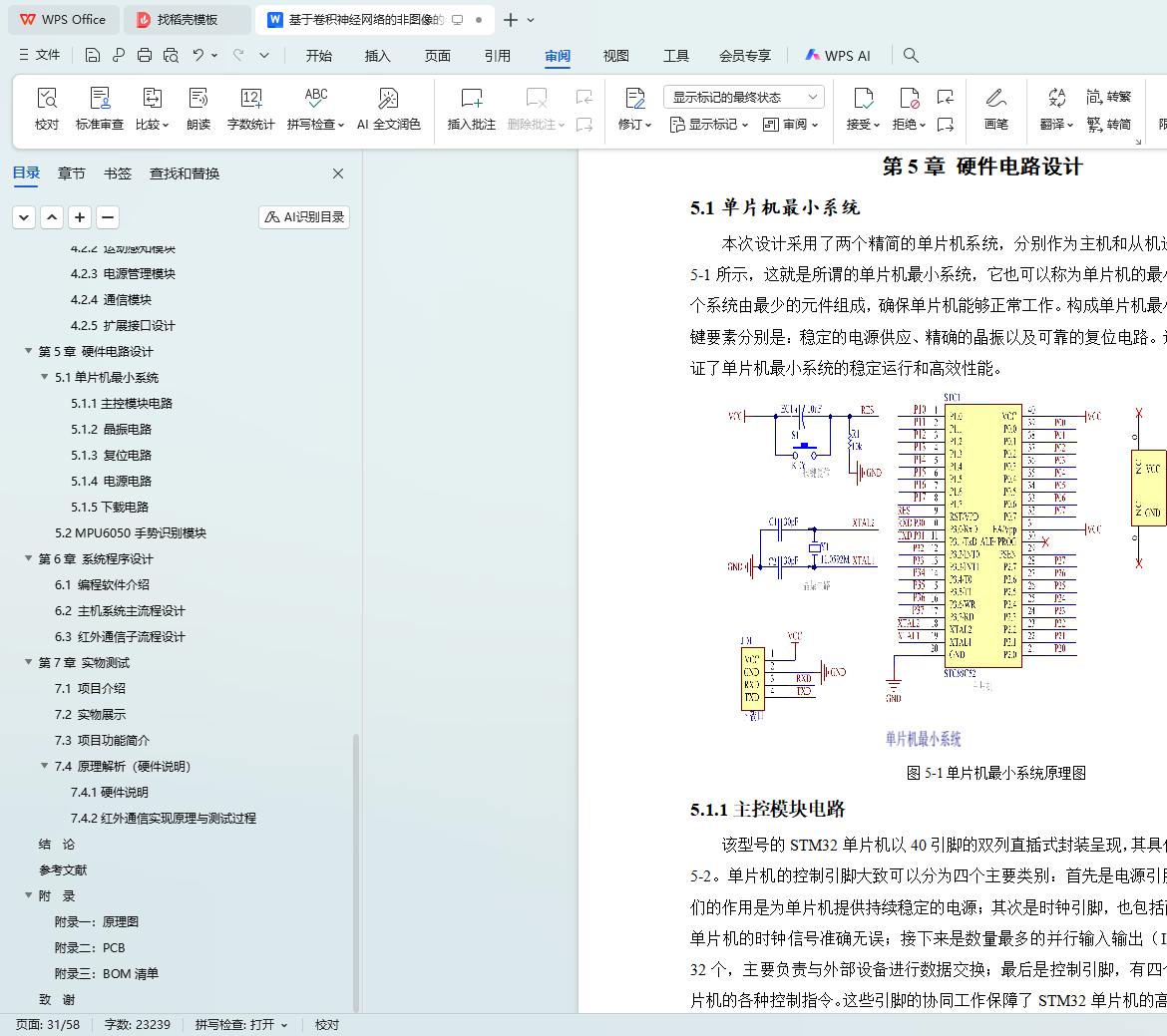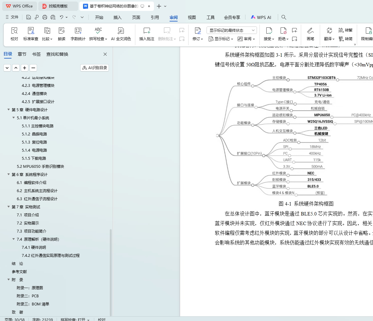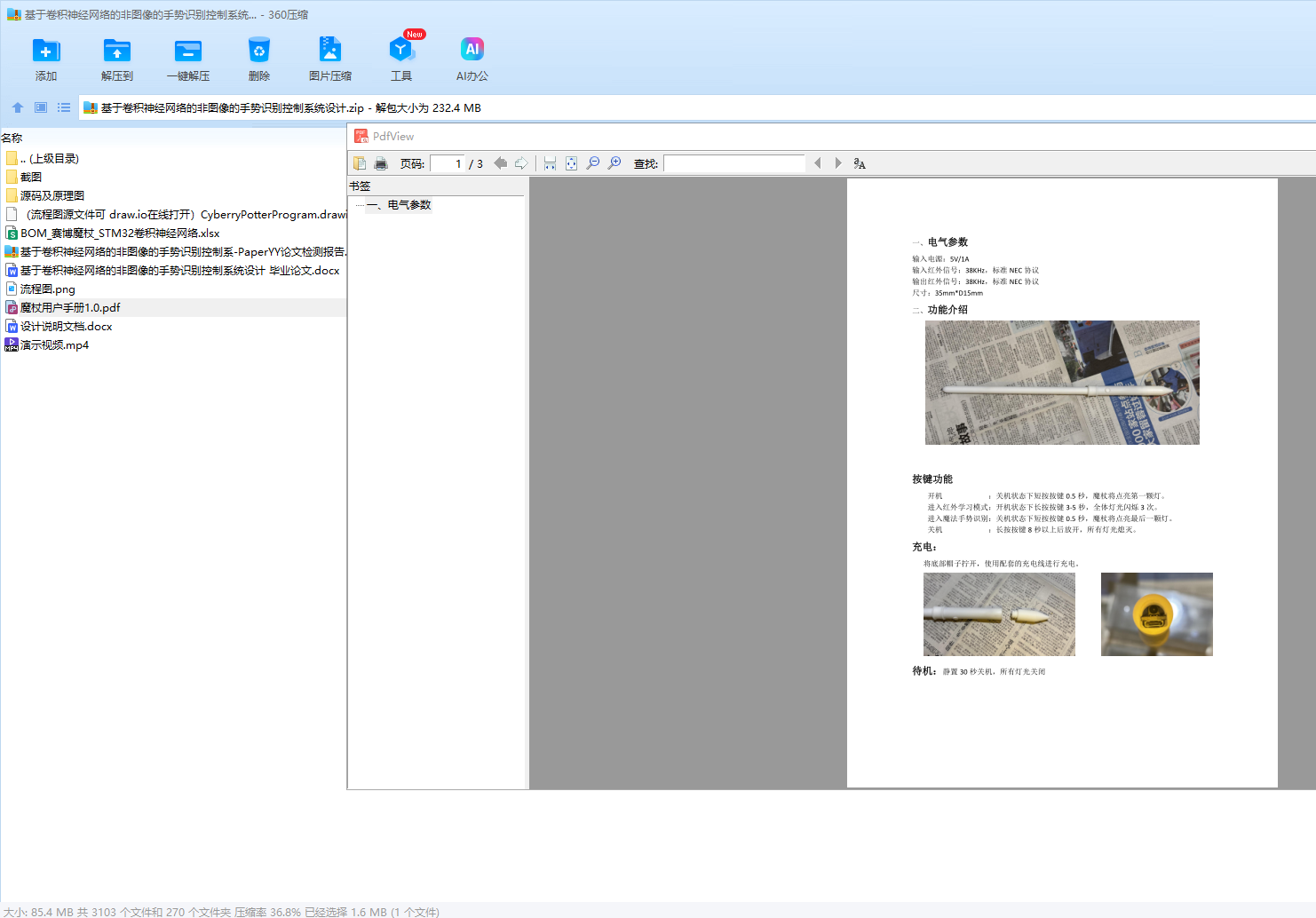 设计采用了STM32F103CBT6作为主控芯片,实现了手势数据的采集、处理与识别,以及基于识别结果对外部设备的控制。系统集成了射频遥控和蓝牙通信模块,能够识别包含10种手势的手势库,如特定字母和数字,且正确识别率控制在90%以上。此外,系统还具备高度的可扩展性,用户可以根据需要添加新的手势或功能模块。本研究不仅提高了手势识别的准确性和适应性,也为非图像手势识别技术的应用提供了新的思路和方法。