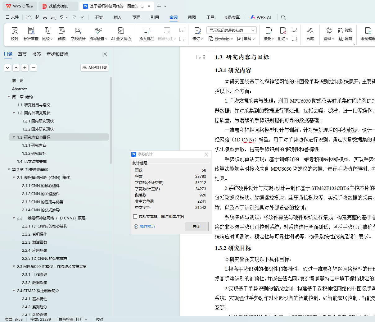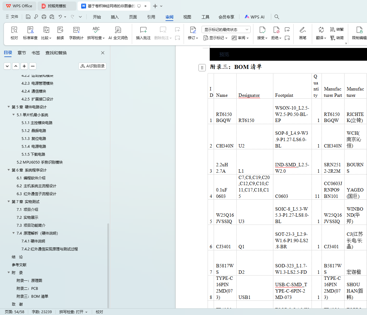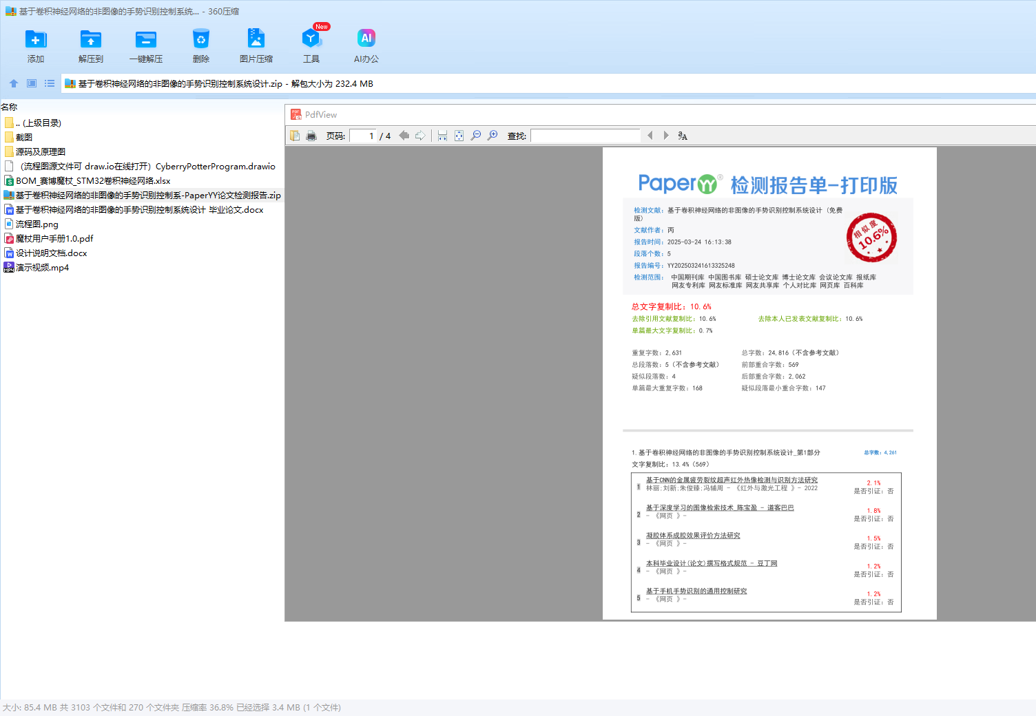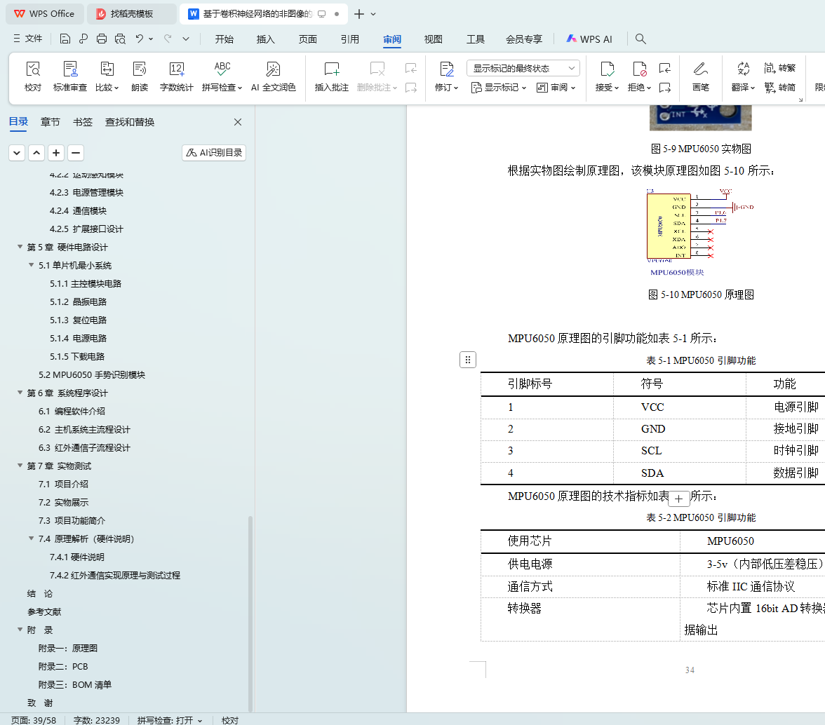 设计采用了STM32F103CBT6作为主控芯片,实现了手势数据的采集、处理与识别,以及基于识别结果对外部设备的控制。系统集成了射频遥控和蓝牙通信模块,能够识别包含10种手势的手势库,如特定字母和数字,且正确识别率控制在90%以上。此外,系统还具备高度的可扩展性,用户可以根据需要添加新的手势或功能模块。本研究不仅提高了手势识别的准确性和适应性,也为非图像手势识别技术的应用提供了新的思路和方法。