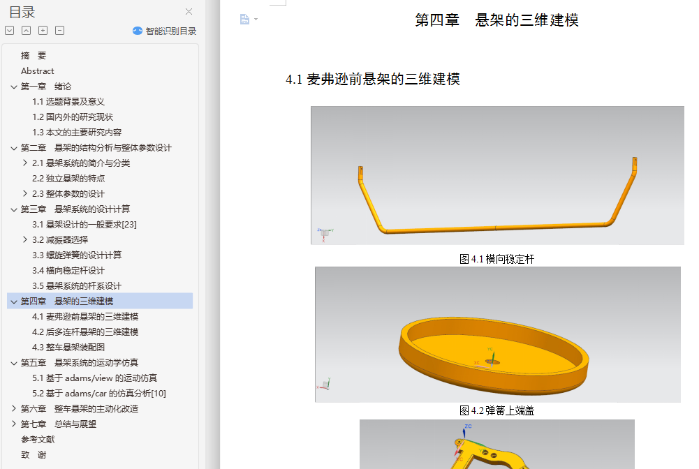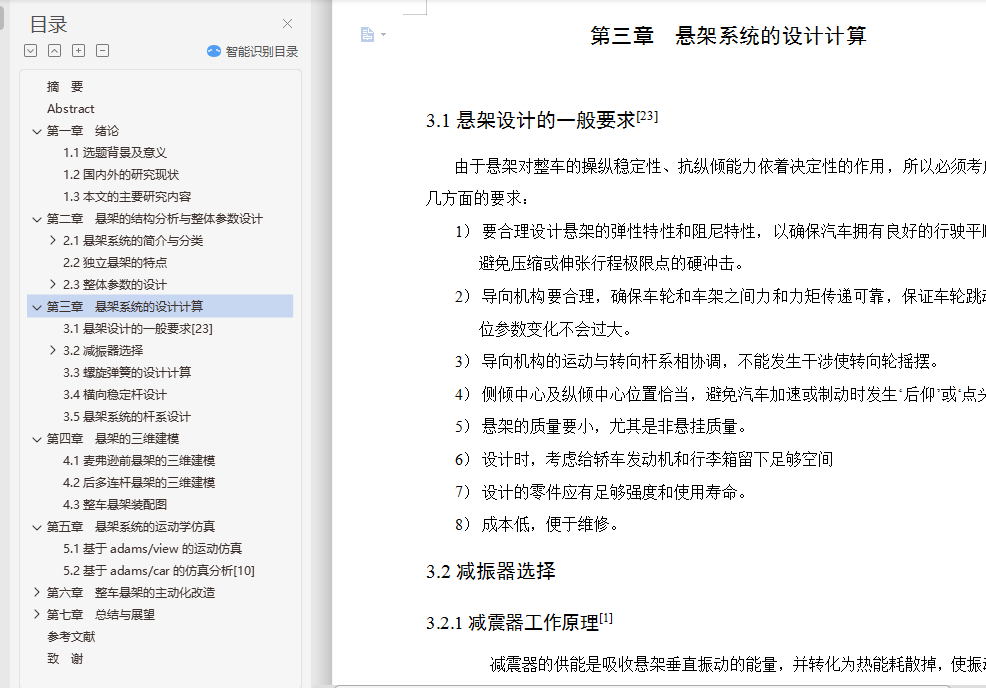Comfort is one of the most important performance of car. Comfort is related to the inherent vibration of the body, and the inherent vibration of the body is related to the suspension. Therefore, automobile suspension is an important component to ensure ride comfort. At the same time, the automobile suspension is an important component to ensure the safety of the vehicle, which is used to connect the frame (or body) to the axle (or wheel). Therefore, automobile suspension is often listed as an important part of the technical specification table of cars, as one of the indicators to measure the quality of cars. This paper first discusses the classification of suspension, advantages and disadvantages, and domestic and foreign research status, and then FAW Volkswagen Miao According to the design reference, the traditional design method (non-optimal design) is used to design and calculate the pre-McPherson suspension and the rear multi-link suspension, which covers the selected suspension mass distribution coefficient, the selected vehicle vibration frequency, the bias frequency ratio, the calculation of the static deflection and the dynamic deflection of the suspension. Selection of shock absorber stroke and inner diameter of working cylinder and design of coil spring diameter, working ring number, etc. At the same time, after introducing active suspension and semi-active suspension, the advantages and disadvantages between them and compared with traditional suspension, the feasible improvement methods of front Macpherson suspension and rear multi-link suspension shock absorber, and the research direction in the future are described. Finally, a review of the design was made. Knot design in the harvest and problems.