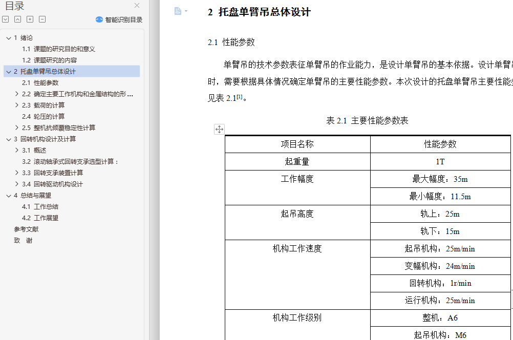 摘 要:单臂吊是利用单个立柱和回转臂来起吊货物的一种起重设备。单臂吊的立柱下端一般固定在混凝土的基础上,回转臂可以根据客户的需要来进行旋转。单臂吊是利用单个立柱和回转臂来起吊货物的一种起重设备。单臂吊的立柱下端一般固定在混凝土的基础上,回转臂可以根据客户的需要来进行旋转。单臂吊结构简单,操纵方便,作业空间大,广泛的用于各种厂矿车间的生产线上和装配线上,是一种节能高效的物料吊装设备。近年来,随着我国实力的不断进步,各行各业都有了巨大的发展,在运输方面,以托盘单臂吊为主要工作单位的运输机械占据的地位也越来越重要,而其中的回转部分的设计也越来越受到人们的关注,回转部分的好坏,对其总体性能的影响是不言而喻的,因此,有必要对其回转机构的设计进行一次探讨。本文以一吨托盘式单臂吊为例,叙述了托盘式单臂吊总体设计的一般过程,并对其回转机构进行了初步设计,并且给出了回转机构及其总体的CAD图纸,结论证明,本文所确定的托盘单臂吊各项参数可以通过整机稳定性验算,回转机构所选择的电机和轴承符合要求。本文借鉴了以往这方面学者的经验,也可以对于后来人的学习提供一些参考。