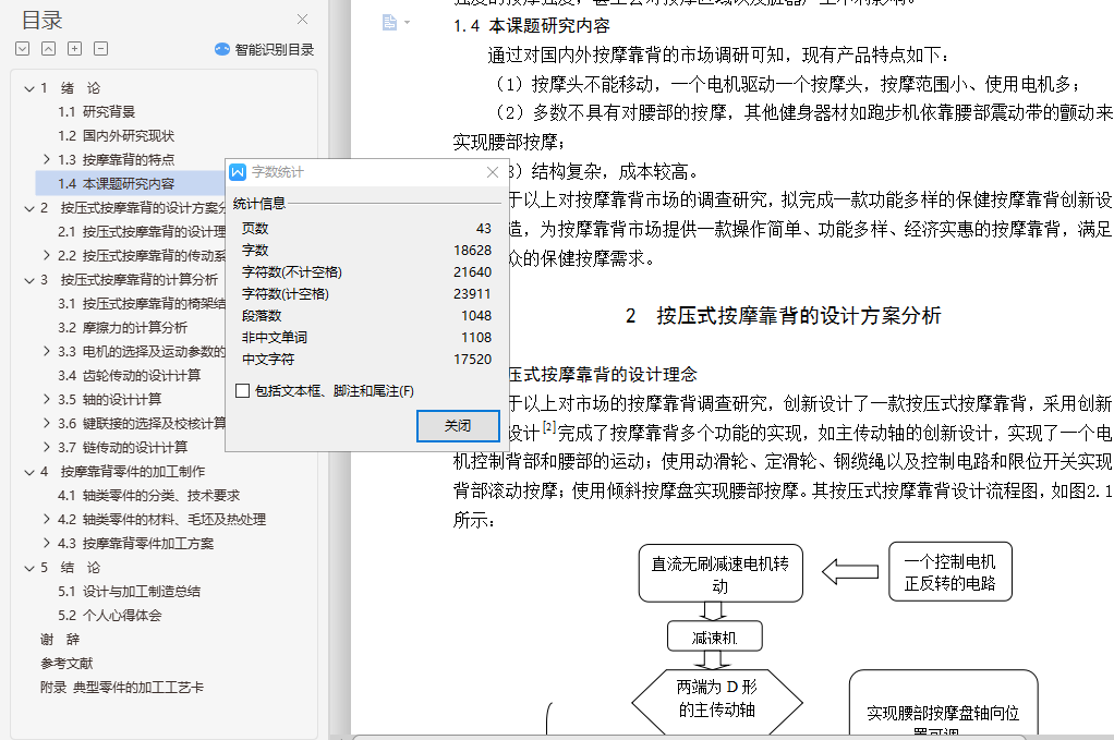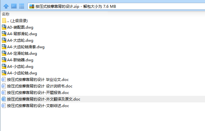 本次设计了解按摩器材的现状,分析总结现有按摩靠背的优缺点,设计一台新型按摩靠背,该按摩靠背可模拟中医推拿的按压及振动手法,通过永磁直流小电机驱动蜗杆传动及齿轮传动,轮齿之间相互啮合实现上下直线运动和旋转拍打按压运动,外接电池使按摩头具有振动功能。完成按摩靠背的参数计算及结构设计,合理的结构方案设计。结构参数设计。结构零件的工程图及装配体的工程图。