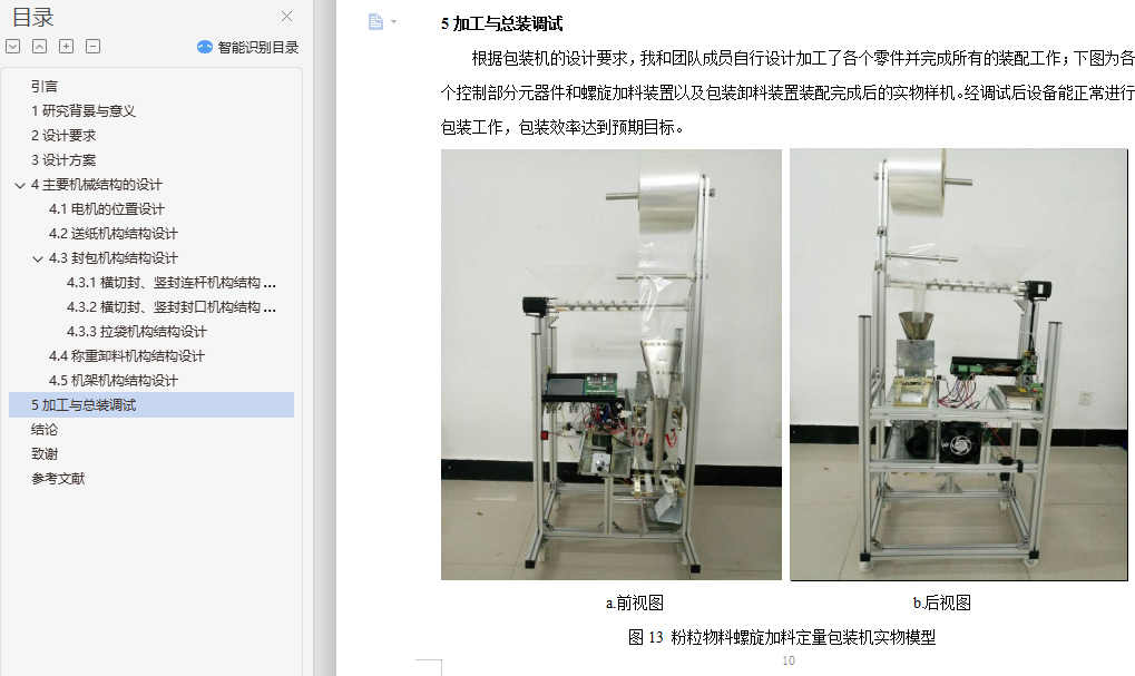 摘 要 :本课题设计的出发点是为农民淘宝卖家出售粉粒状农产品如玉米渣、芝麻、小米、藕粉等,提供一种性价比较高的自动定量包装机。包装机主体结构设计分为加料装置和包装卸料装置两部分。我主要负责设备的封包卸料装置的机械设计和装配工作。其中机械部分的设计主要包括送纸机构、封包机构、机架机构、动力机构、卸料机构等相关机构的设计以及装配。
