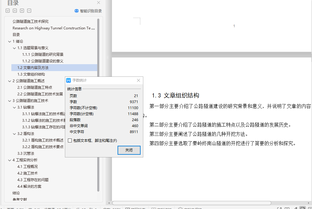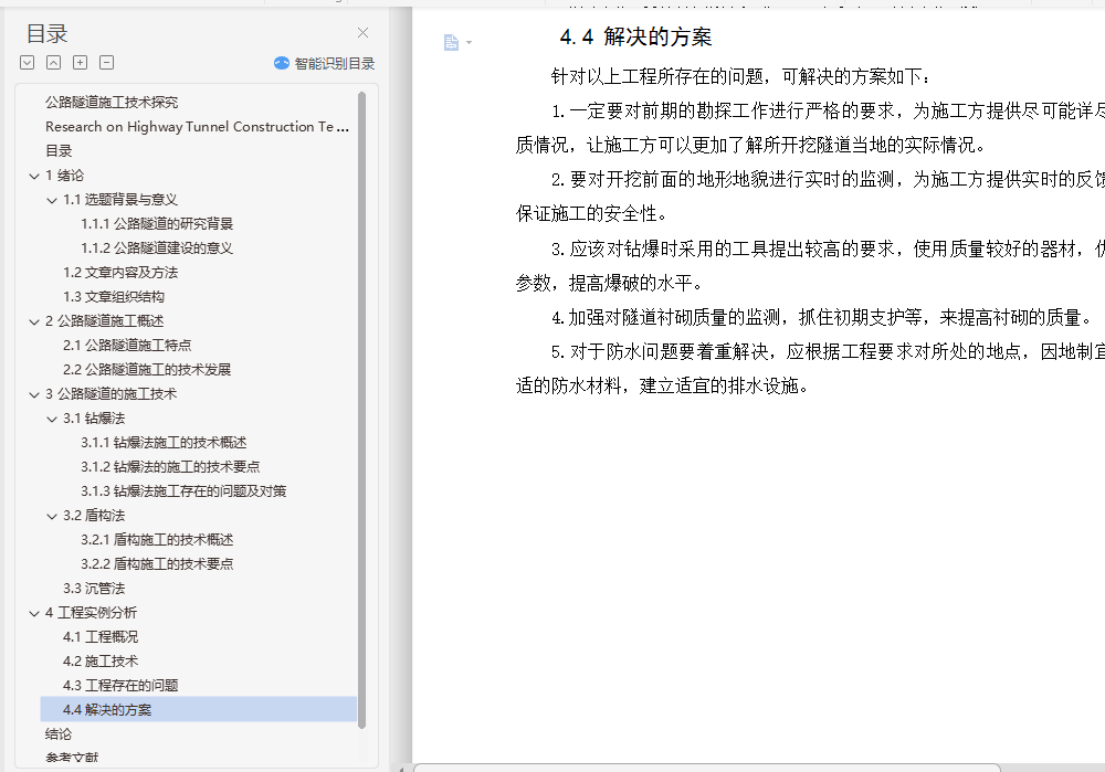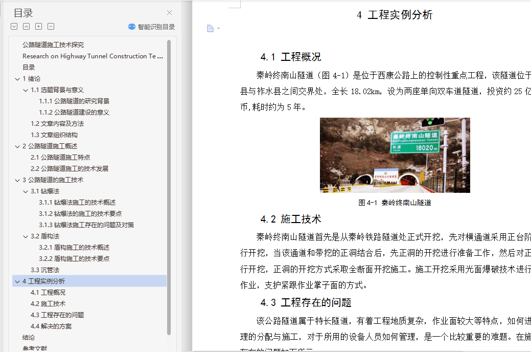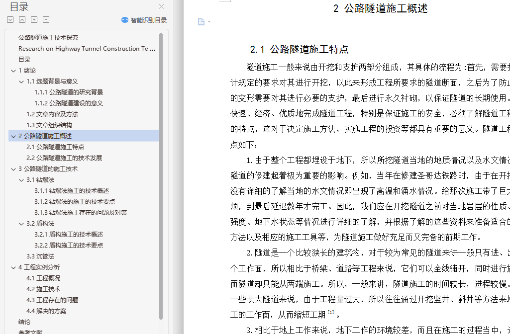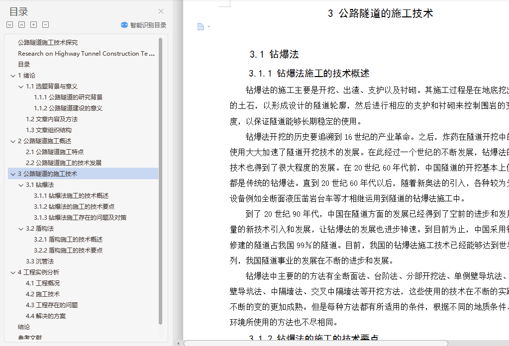 摘要:随着社会的发展,人们对于公路的依赖也不断的增加,各种生产、运输都需要一个安全、快速、便捷的交通环境予以支持,以此来满足日益增长的交通运输的需求。随着我国对于施工技术方面不断的创新和掌握,我国在隧道建设方面也逐渐步入强国的行列。目前,我国可以根据地形地貌的不同,有针对性的在这些地域开挖出适合当地地理环境的隧道。而且,我国在隧道的施工方法上,也由单一向多元化进行发展。不仅将原来的方法研究的更加透彻,而且还紧跟世界发展的潮流,向多元化的施工手段进行探究和发展。为了顺应世界发展的潮流以及我国在隧道行业的不断发展,我们应该对本专业的相关内容进行进一步的探索和研究。本课题主要对于公路隧道常见的问题进行分析和讨论,并且对公路隧道的施工提出了一些的见解和看法。关键词:公路隧道;施工方法;钻爆法;盾构法Research on Highway Tunnel Construction TechnologyAbstract: With the development of society, people's dependence on highways is also increasing. All kinds of production and transportation need a safe, fast and convenient transportation environment to support the ever-increasing transportation. Demand. With the continuous innovation and mastery of construction technology in China, China has gradually stepped into the ranks of powerful countries in tunnel construction. At present, China can excavate tunnels suitable for the local geographical environment in these areas according to the different topography and geomorphology. Moreover, China's tunnel construction methods have also evolved from a single diversification. It not only makes the original method research more thorough, but also keeps up with the trend of world development and explores and develops diversified construction methods. In order to comply with the trend of world development and the continuous development of China's tunnel industry, we should further explore and study the relevant content of this major. This topic mainly analyzes and discusses the common problems of highway tunnels, and puts forward some opinions and views on the construction of highway tunnels.Key words: Road tunnel;Construction method;Drilling and blasting method; Shield method目录1 绪论 11.1 选题背景与意义 11.1.1 公路隧道的研究背景 11.1.2 公路隧道建设的意义 11.2 文章内容及方法 11.3 文章组织结构 22 公路隧道施工概述 32.1 公路隧道施工特点 32.2 公路隧道施工的技术发展 43 公路隧道的施工技术 33.1 钻爆法 33.1.1 钻爆法施工的技术概述 33.1.2 钻爆法施工的技术要点 43.1.3 钻爆法施工存在的问题及对策 53.2 盾构法 63.2.1 盾构施工的技术概述 63.2.2 盾构施工的技术要点 63.2.3 盾构施工存在的问题及对策 73.3 沉管法 73.3.1 沉管法施工的技术概述 73.3.2 沉管法施工的技术要点 83.3.2 沉管法施工存在的问题及对策 84 工程实例分析 114.1 工程概况 114.2 施工技术 114.3 工程存在的问题 114.4 解决的方案 12结论 13参考文献 14致 谢 15