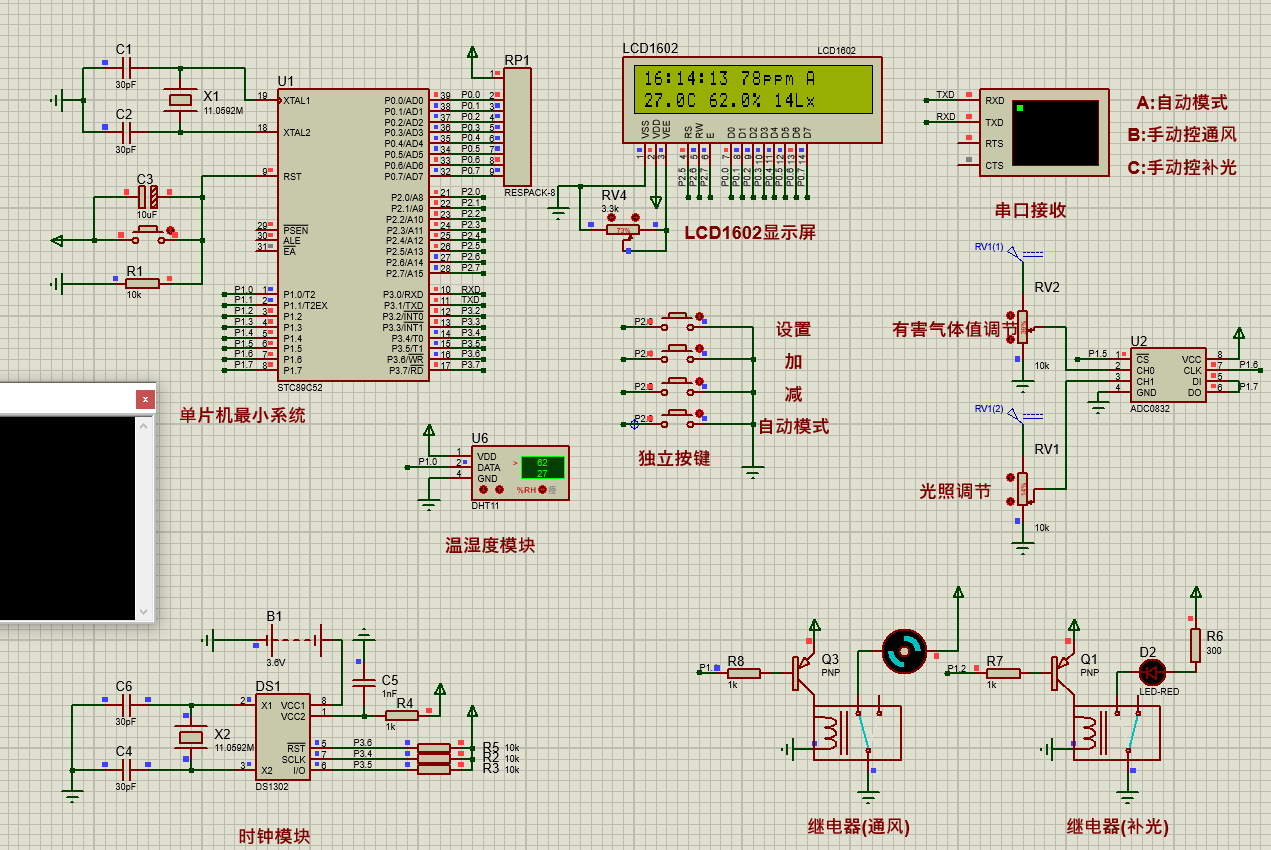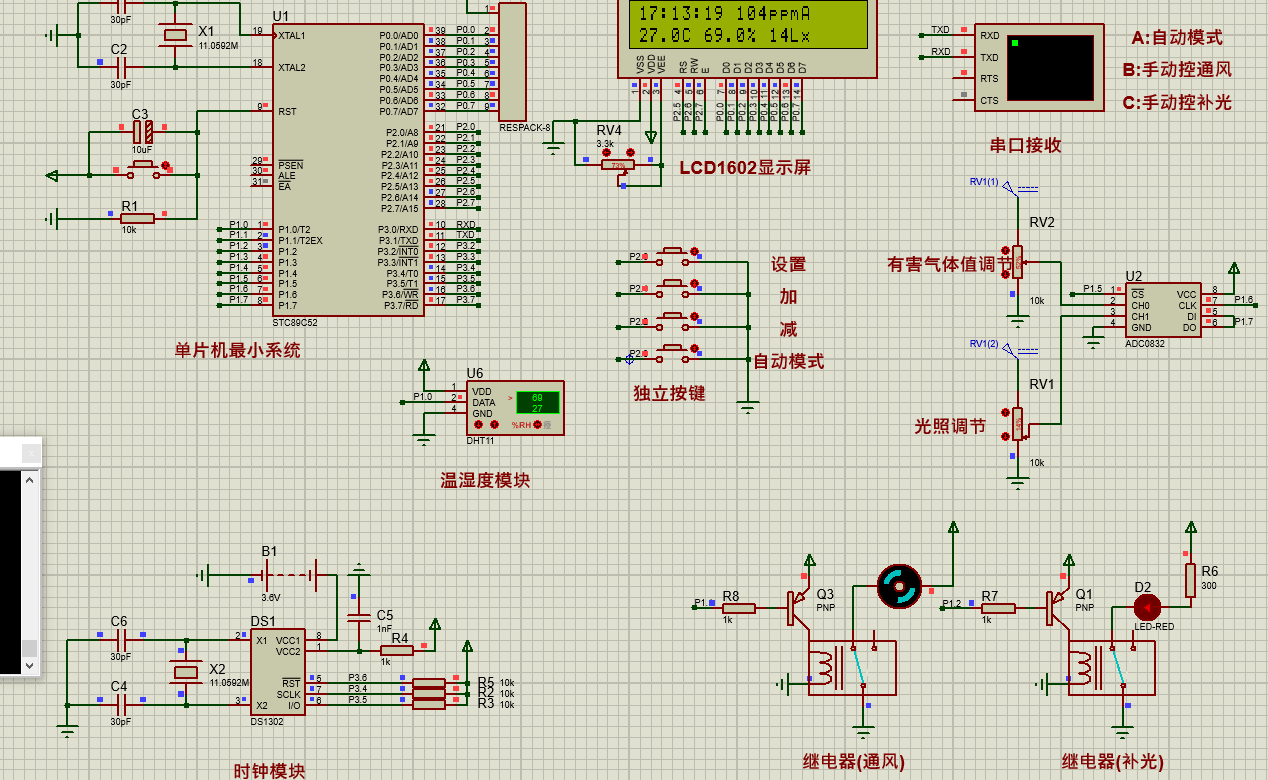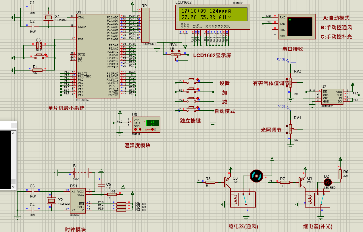 该系统采用STC89C52单片机作为核心控制器,结合DHT11温湿度传感器、MQ-135空气质量传感器等多种传感器,实现对猪场环境的实时监测。当监测到环境参数异常时,如温度过高、二氧化碳浓度超标或温度过低,系统能够自动启动相应的处理措施,如开启风扇进行降温通风、启动加热功能等,以确保猪舍内环境的舒适性和稳定性。此外,该系统还具备报警功能,当环境参数超出预设阈值时,将发出灯光报警,并通过远程监测功能实时传输相关数据至管理端。