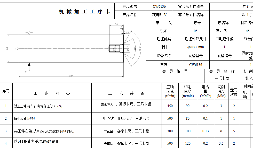 花键轴属于回转体零件,主要是用来传递运动和扭矩的,零件图见图 1-1,由圆柱面,轴肩和螺纹孔等组成,全轴总长224mm。轴肩一般用来确定安装在轴上的零件的轴向位置,内螺纹用于连接,直径φ40js6, φ55db和φ45js6外圆面表面以及螺纹孔加工精度要求较高,其值为Ra1.6,这些都属于主要加工表面,其余属于次要加工表面。
