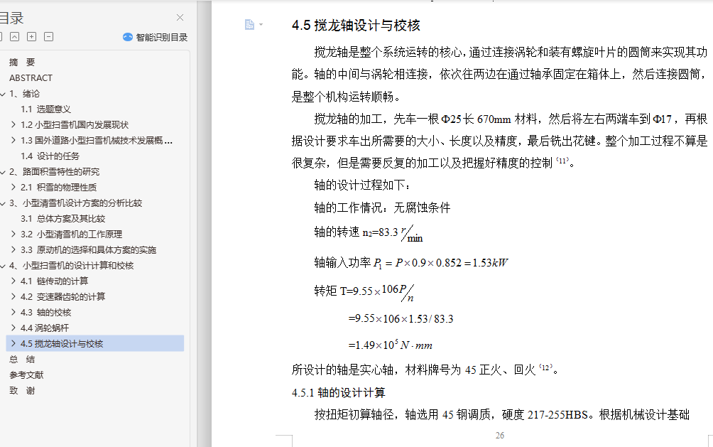 本文在分析了目前国内外的主要除雪方法的基础上,提出一种适合中国国情的小型机械旋转式扫雪机的设计方案。本设计由汽油机提供动力。经输出轴输出动力,通过链传动传递动力,带动其他工作。该扫雪机的工程是利用搅龙旋转将雪集中并向后推送,通过搅龙的向后推力及螺旋桨产生的吸力使其到达螺旋桨。由于螺旋桨高速旋转产生巨大的作用力,雪被高速推向弯管,再通过与弯管壁撞击折射出去。从而达到清除积雪的目的和最佳效果。此次扫雪机的设计原理是,由原动机提供动力,经过链传动将动力传递给输出轴,输出轴又带动抛雪叶轮高速旋转,利用离心力将雪抛出。同时利用减速器来减速带动搅龙传动轴和螺旋搅龙叶片旋转来实现集雪作业。而其他的动力则由变速器传输给车轮轴来带动扫雪机前进,实现清雪工作。本论文对小型路面机械清雪车进行了深入的分析,并进一步地完善了此机构,设计出此种扫雪设备。