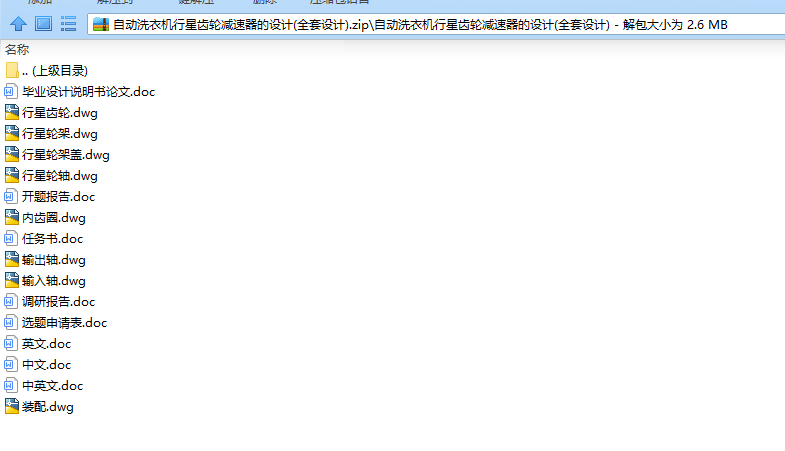 自动洗衣机行星齿轮减速器的设计摘要:本课题是有关一种自动洗衣机减速离合器内部减速装置行星轮系减速器的设计。在洗衣机中使用行星轮系减速器正是利用了行星齿轮传动:体积小,质量小,结构紧凑,承载能力大;传动效率高;传动比较大;运动平稳、抗冲击和震动的能力较强、噪声低的特点。行星轮减速其实就是齿轮减速的原理,它有一个轴线位置固定的齿轮叫中心轮或太阳轮,在太阳轮边上有轴线变动的齿轮,即既作自转又作公转的齿轮叫行星轮,行星轮有支持构件叫行星架,通过行星架将动力传到轴上,再传给其它齿轮.它们由一组若干个齿轮组成一个轮系.只有一个原动件,这种周转轮系称为行星轮系.关键词:行星轮系减速器、行星轮、中心轮、行星架。Absrtact: this paper is concerned with the design of a planetary gear train reducer for the internal deceleration device of the automatic washing machine deceleration clutch. The use of planetary gear train reducer in washing machine is precisely the use of planetary gear transmission: small volume, small mass, compact structure, large bearing capacity, high transmission efficiency, large transmission; Smooth motion, strong ability to resist shock and vibration, low noise characteristics. Planetary gear deceleration is actually the principle of gear reduction, it has a fixed axis of gear called center wheel or sun wheel, there is axis change gear on the edge of the sun wheel, that is, the gear for both rotation and rotation is called planetary wheel. The planetary wheel has a supporting component called Planetary rack through which power is transmitted to the shaft and then to other gears. They consist of a set of gears to form a gear train. There is only one primary mover, and this type of swing gear train is called a planetary gear train.