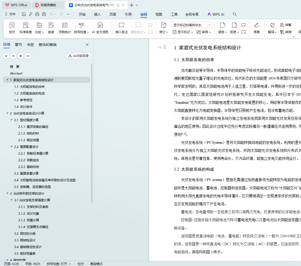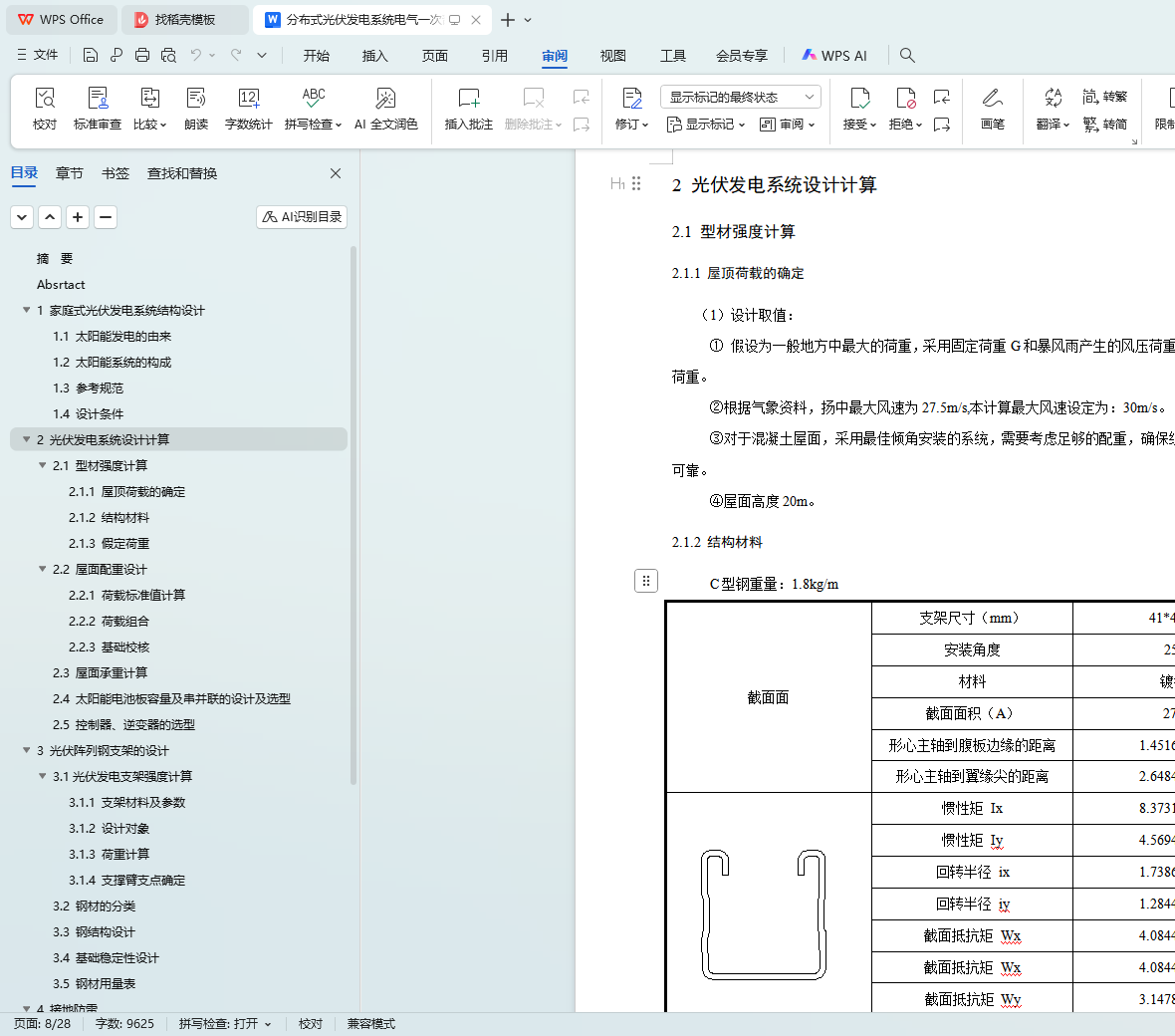 在设计中,首先明确了太阳能发电的基本原理与系统构成,依据相关规范及设计条件,进行了光伏组件的容量规划及串并联设计选型,同时考虑了控制器与逆变器的匹配选型,以优化系统性能。针对光伏阵列的支撑结构,设计了钢支架系统,通过详细计算支架材料参数、荷重分布及支撑臂支点位置,确保了支架的强度与稳定性,并提供了钢材用量估算。