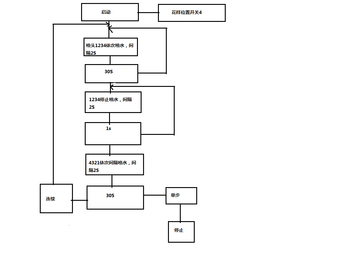 ④花样选择开关在位置4时,按下启动按钮后,按照1-2-3-4的顺序,以此间隔2s喷水,然后一起喷水。30s后,按照1-2-3-4的顺序,分别延迟2s依次停止喷水。再经1s延迟时,按照4-3-2-1的顺序,依次间隔2s喷水,然后一起喷水。30s后停止。如果为单步工作方式,则停下来。如果为连续工作方式,则继续循环下去。