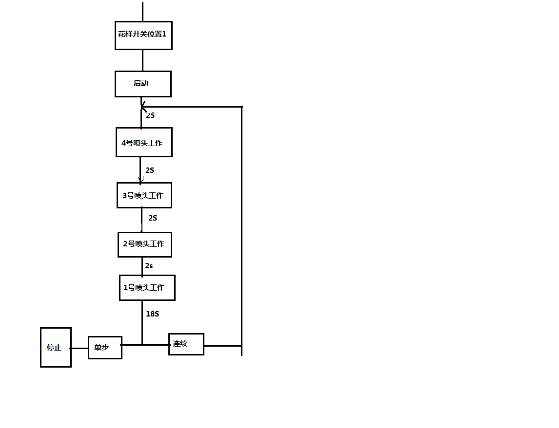 ①花样选择开关在位置1时,按下启动按钮后,4号喷头喷水,延迟2s后,3号喷头喷水,再延迟2s后,2号喷头喷水,又延迟2s后,1号喷头喷水。18s后,如果为单步工作方式,则停下来。如果为连续工作方式,则继续循环下去。