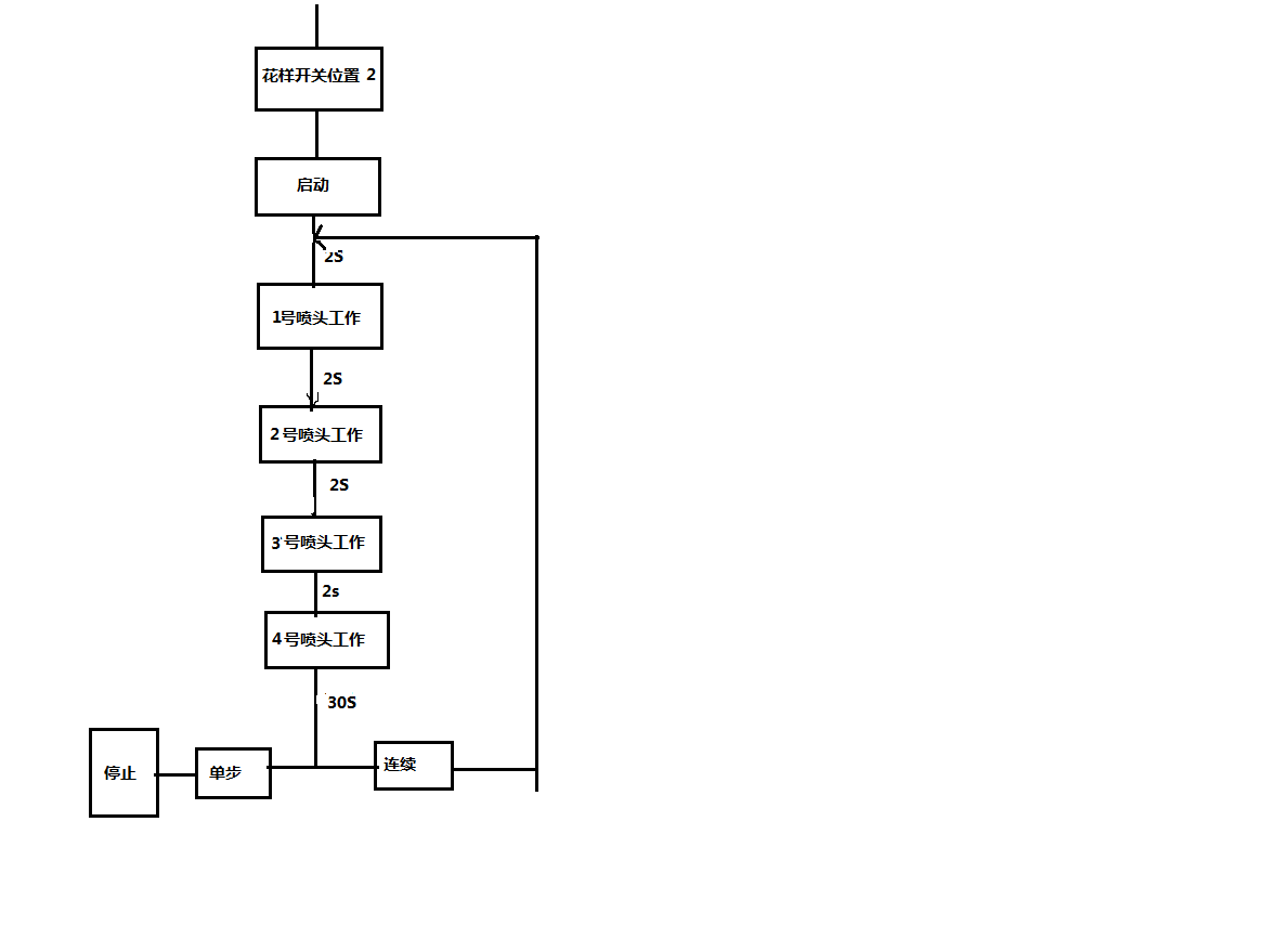 ②花样选择开关在位置2时,按下启动按钮后,1号喷头喷水,延迟2s后,2号喷头喷水,再延迟2s后,3号喷头喷水,又延迟2s后,4号喷头喷水。30s后,如果为单步工作方式,则停下来。如果为连续工作方式,则继续循环下去。
