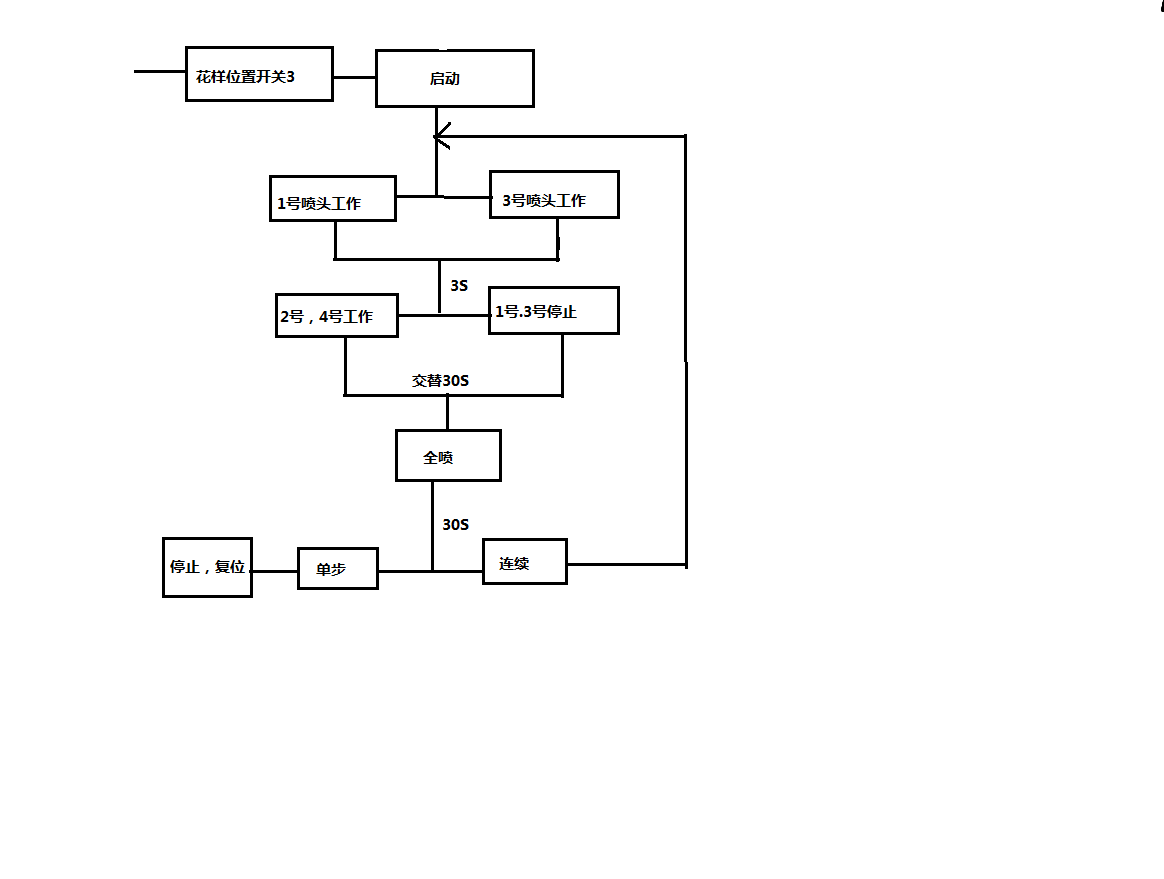 ③花样选择开关在位置3时,按下启动按钮后,1号、3号喷头同时喷水,延迟3s后,2号、4号喷头同时喷水,1号、3号喷头停止喷水。如此交替15s后,4组喷头全喷水,30s后,如果为单步工作方式,则停下来。如果为连续工作方式,则继续循环下去。