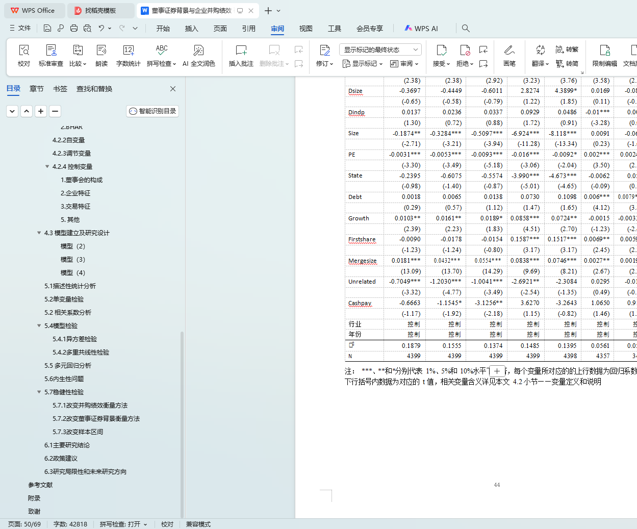 表 11 改变并购绩效衡量方法回归结果 43
