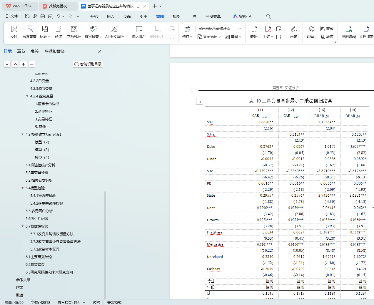 表 10 工具变量两步最小二乘法回归结果 40