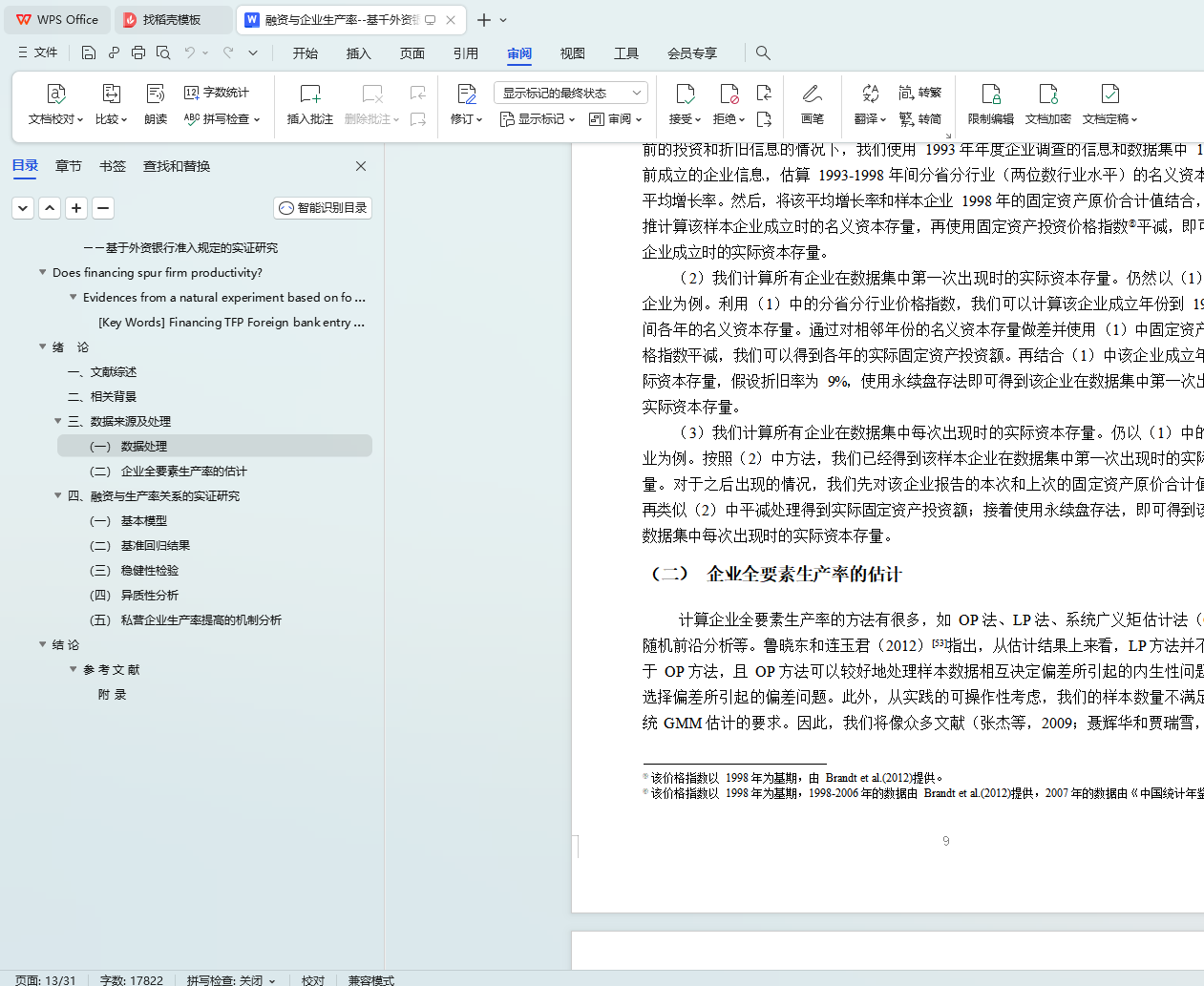 Copious foreign literature has explored the relationship between financing and firm productivity, but so far there are no consistent conclusions. There are fewer relevant domestic studies, and most of them do not do a good job of excluding endogeneity and other factors from interfering with the findings. We use a large dataset developed and maintained by the National Bureau of Statistics of China (NBS) from 1998 to 2007, and explore the relationship between financing and firm productivity using a difference-in-difference model with WTO regulations on easing access to foreign banks in China as an exogenous change in financing. Our results show that, overall, firms' total factor productivity increases significantly after the deregulation of foreign bank access. The results pass a parallel trend test and are robust to labor productivity and the exclusion of newly established firms after deregulation from the sample. The results of the placebo test suggest that the increase in firms' total factor productivity was not caused by other factors over the same period. When the sample is disaggregated by ownership, we find that the most significant increase in total factor productivity is found in the private sector and that this result is driven by the financially constrained firms in the sample.