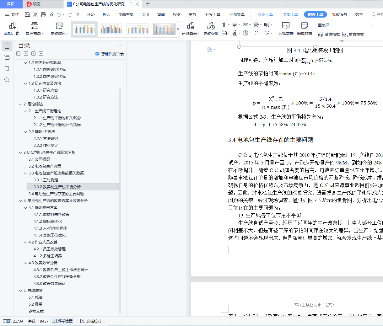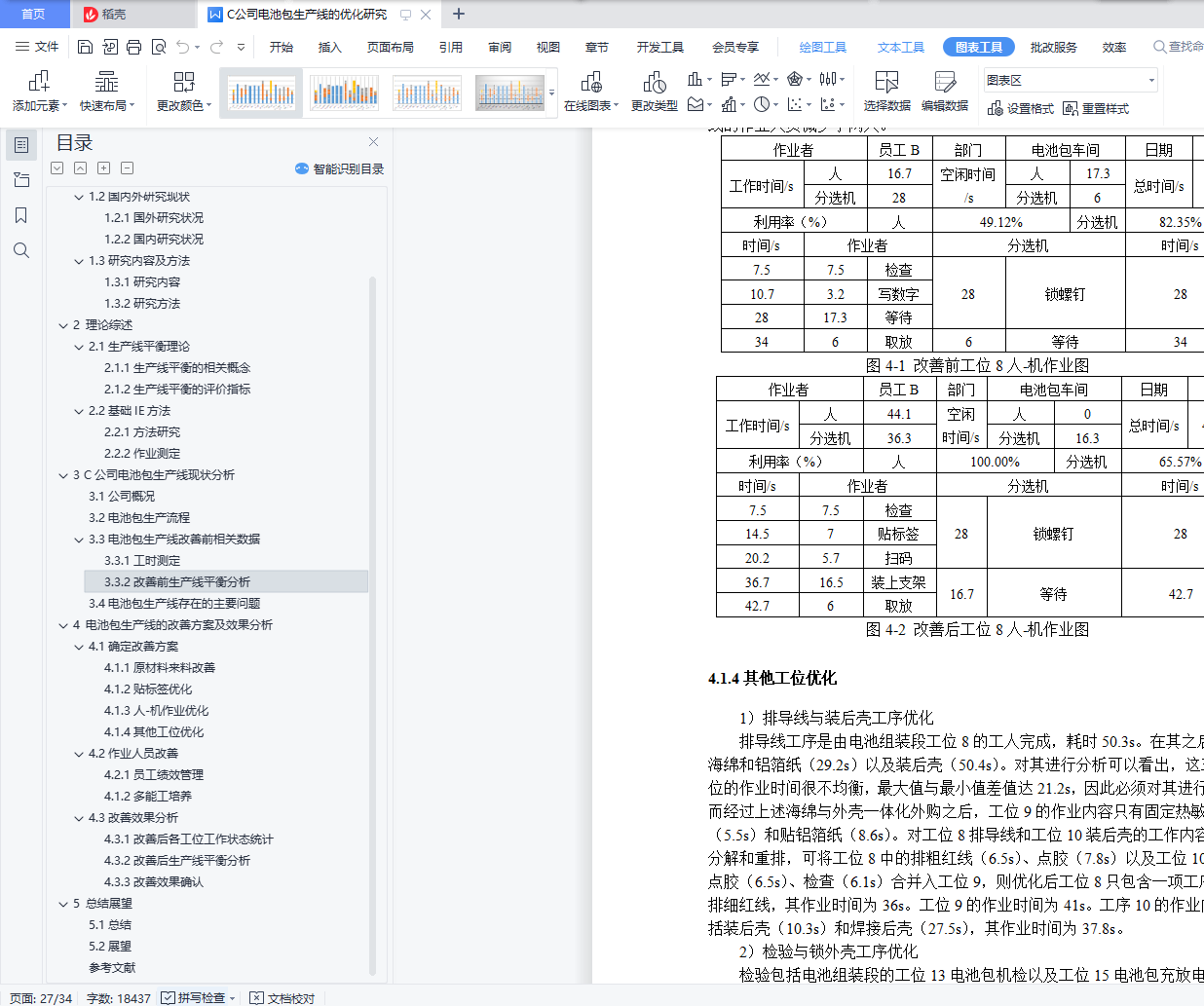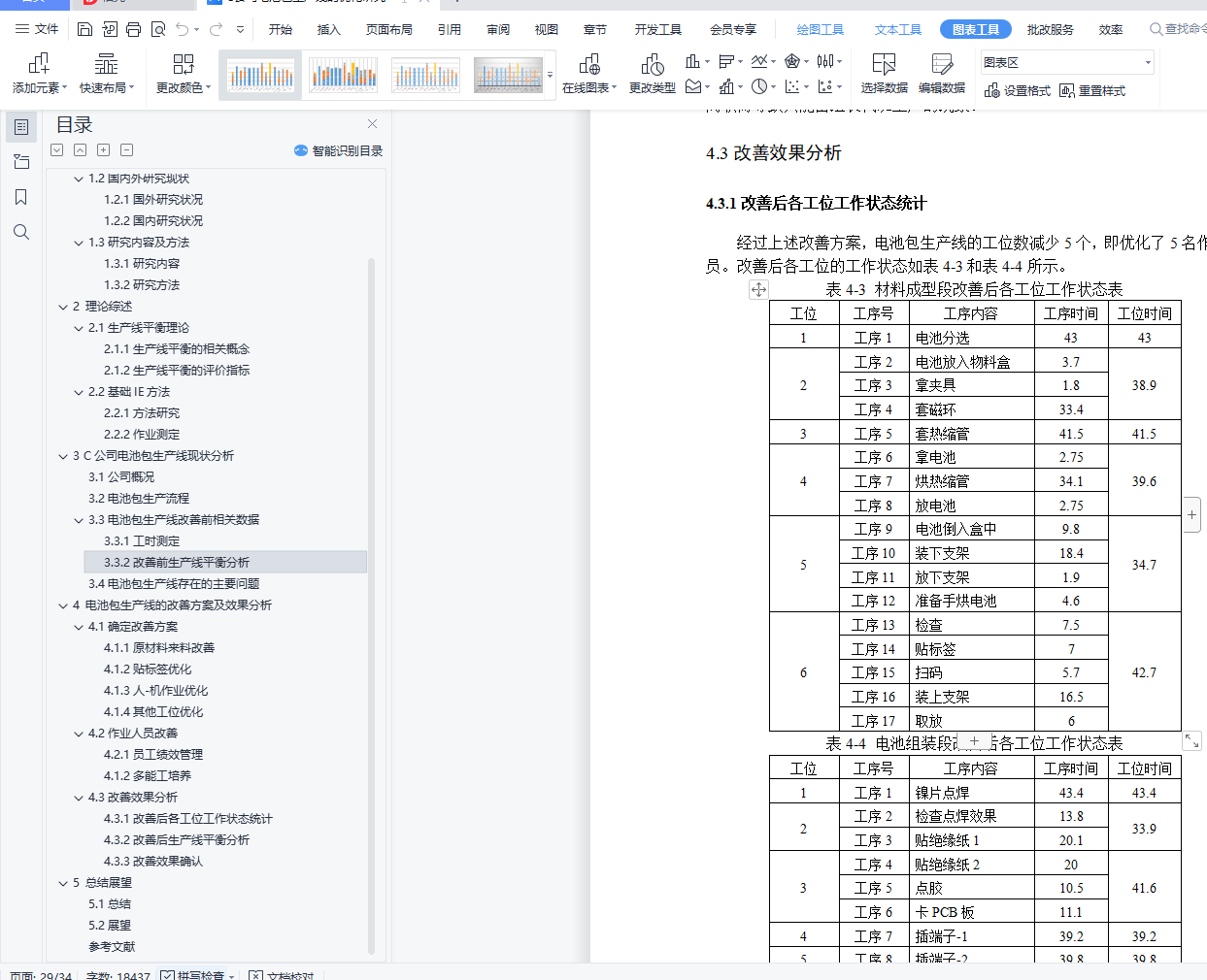 摘 要生产线作为制造型企业生产活动的主体,很容易因工作量分配不均而产生瓶颈工位和能力过剩工位,进而影响生产效率。对于大多数企业而言,生产线的投资成本比较高,因此对生产线的现有流程进行优化,提高生产线的平衡率、在保证产品质量的前提下降低生产成本、按时完成客户需求的订单就显得尤为重要。本文以C公司电池包生产线的28节电池包生产流程为研究对象,结合秒表测时法收集各工位的作业内容和生产节拍,并计算出其平衡率。在此基础上,使用5W1H提问技术、ECRS原则、人-机作业分析等方法优化各工位的作业内容,提高生产线平衡率。改善后各工位的作业时间均低于客户需求的节拍时间,在满足客户订单需求的同时,平衡了各工位的工作量,生产线直接作业人员优化了5人,电池包材料成型段平衡率提高11.21%,电池组装段平衡率提高14.18%,生产周期时间降低了162.1s,并且通过对人员的优化,不仅提高了产线的生产效率和员工作业积极性,也为产线的持续改善奠定了基础。关键字:生产线平衡;秒表测时;ECRS原则;人-机作业分析目 录1 绪论 11.1研究背景及意义 11.1.1研究背景 11.1.2研究意义 11.2国内外研究现状 21.2.1国外研究状况 21.2.2国内研究状况 31.3研究内容及方法 41.3.1研究内容 41.3.2研究方法 42 理论综述 52.1生产线平衡理论 52.1.1生产线平衡的相关概念 52.1.2生产线平衡的评价指标 62.2基础IE方法 62.2.1方法研究 62.2.2作业测定 73 C公司电池包生产线现状分析 103.1公司概况 103.2电池包生产流程 113.3电池包生产线改善前相关数据 123.3.1工时测定 123.3.2改善前生产线平衡分析 183.4电池包生产线存在的主要问题 194 电池包生产线的改善方案及效果分析 224.1确定改善方案 224.1.1原材料来料改善 224.1.2贴标签优化 224.1.3人-机作业优化 234.1.4其他工位优化 244.2作业人员改善 254.2.1员工绩效管理 254.1.2多能工培养 254.3改善效果分析 264.3.1改善后各工位工作状态统计 264.3.2改善后生产线平衡分析 274.3.3改善效果确认 295 总结展望 305.1总结 305.2展望 30参考文献 31