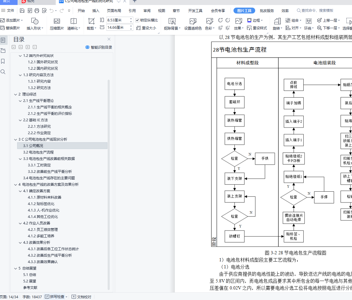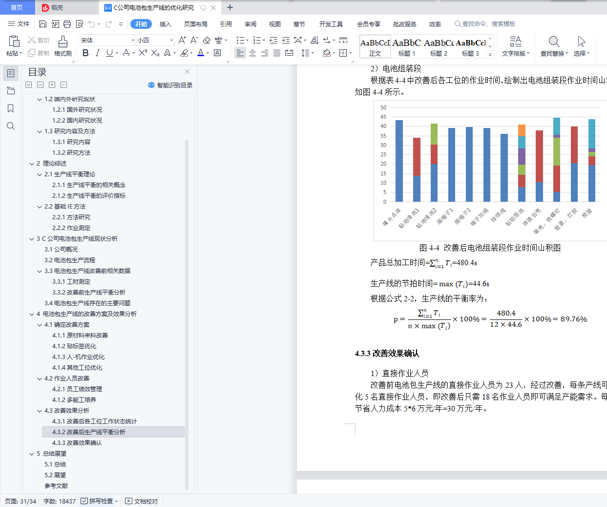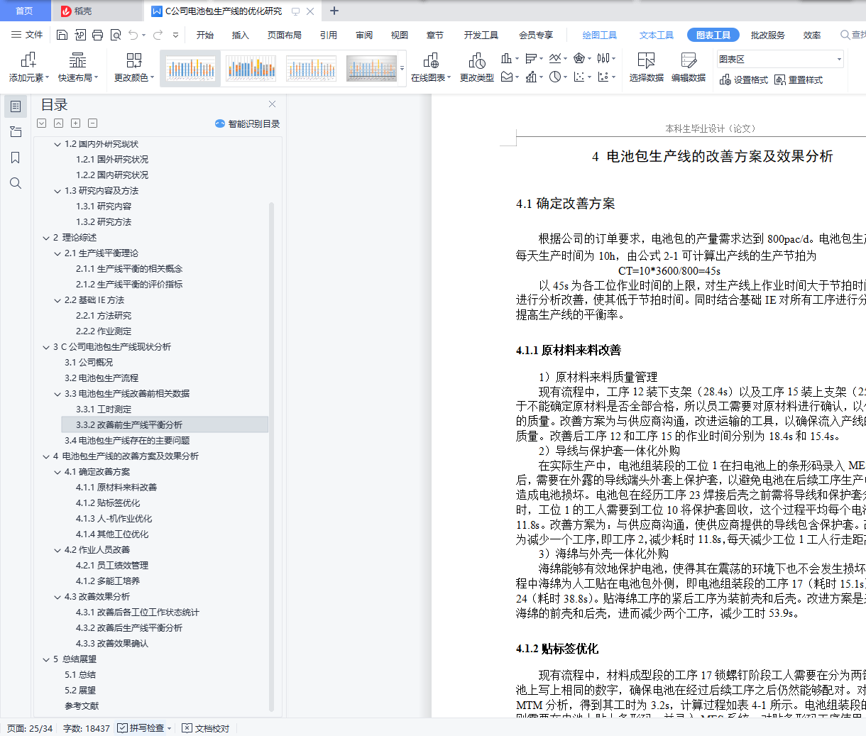 摘 要生产线作为制造型企业生产活动的主体,很容易因工作量分配不均而产生瓶颈工位和能力过剩工位,进而影响生产效率。对于大多数企业而言,生产线的投资成本比较高,因此对生产线的现有流程进行优化,提高生产线的平衡率、在保证产品质量的前提下降低生产成本、按时完成客户需求的订单就显得尤为重要。本文以C公司电池包生产线的28节电池包生产流程为研究对象,结合秒表测时法收集各工位的作业内容和生产节拍,并计算出其平衡率。在此基础上,使用5W1H提问技术、ECRS原则、人-机作业分析等方法优化各工位的作业内容,提高生产线平衡率。改善后各工位的作业时间均低于客户需求的节拍时间,在满足客户订单需求的同时,平衡了各工位的工作量,生产线直接作业人员优化了5人,电池包材料成型段平衡率提高11.21%,电池组装段平衡率提高14.18%,生产周期时间降低了162.1s,并且通过对人员的优化,不仅提高了产线的生产效率和员工作业积极性,也为产线的持续改善奠定了基础。关键字:生产线平衡;秒表测时;ECRS原则;人-机作业分析目 录1 绪论 11.1研究背景及意义 11.1.1研究背景 11.1.2研究意义 11.2国内外研究现状 21.2.1国外研究状况 21.2.2国内研究状况 31.3研究内容及方法 41.3.1研究内容 41.3.2研究方法 42 理论综述 52.1生产线平衡理论 52.1.1生产线平衡的相关概念 52.1.2生产线平衡的评价指标 62.2基础IE方法 62.2.1方法研究 62.2.2作业测定 73 C公司电池包生产线现状分析 103.1公司概况 103.2电池包生产流程 113.3电池包生产线改善前相关数据 123.3.1工时测定 123.3.2改善前生产线平衡分析 183.4电池包生产线存在的主要问题 194 电池包生产线的改善方案及效果分析 224.1确定改善方案 224.1.1原材料来料改善 224.1.2贴标签优化 224.1.3人-机作业优化 234.1.4其他工位优化 244.2作业人员改善 254.2.1员工绩效管理 254.1.2多能工培养 254.3改善效果分析 264.3.1改善后各工位工作状态统计 264.3.2改善后生产线平衡分析 274.3.3改善效果确认 295 总结展望 305.1总结 305.2展望 30参考文献 31