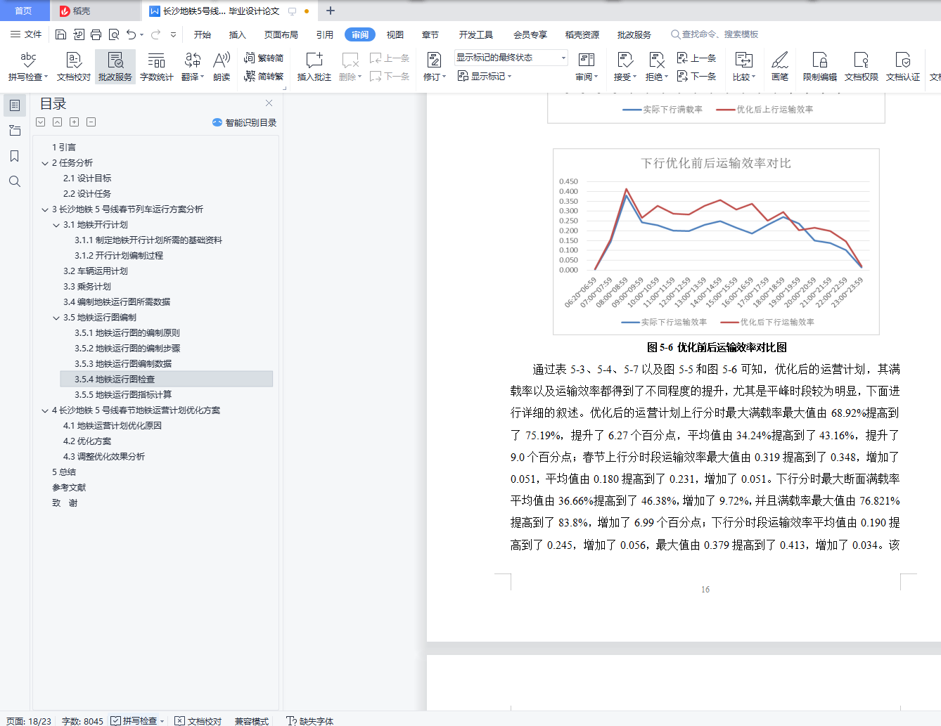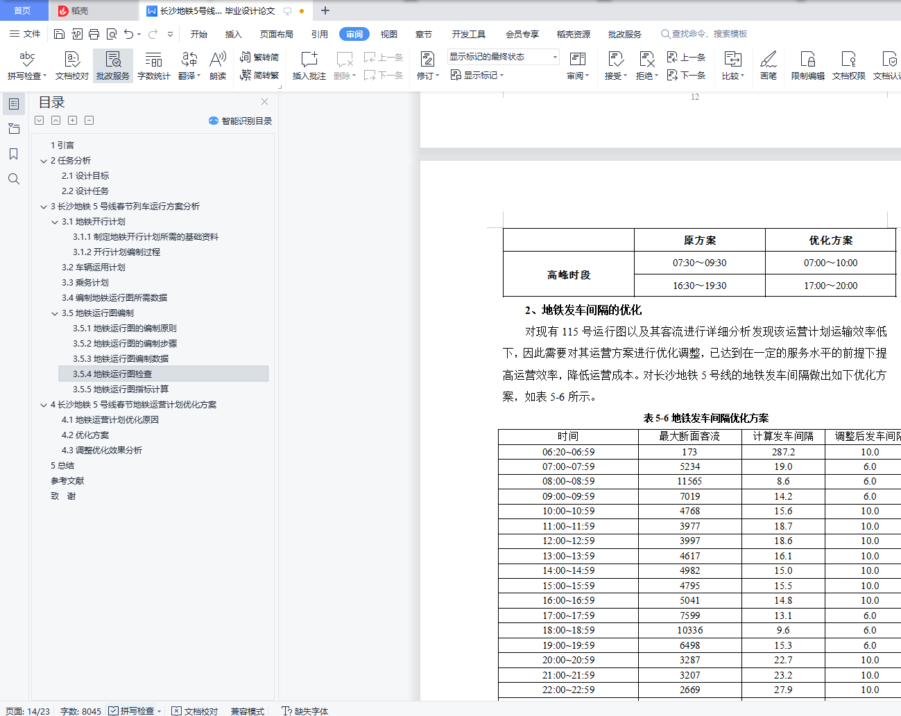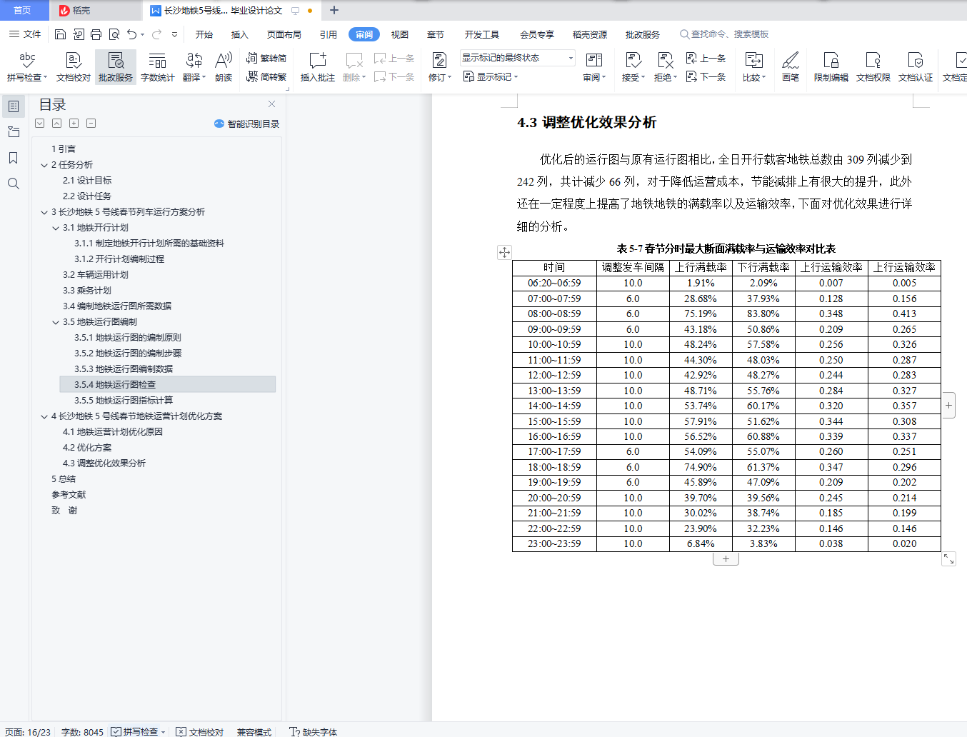 目 录1引言 12任务分析 22.1设计目标 22.2设计任务 23长沙地铁5号线春节列车运行方案分析 33.1地铁开行计划 33.1.1制定地铁开行计划所需的基础资料 33.1.2开行计划编制过程 43.2车辆运用计划 53.3乘务计划 63.4编制地铁运行图所需数据 63.5地铁运行图编制 73.5.1地铁运行图的编制原则 73.5.2地铁运行图的编制步骤 83.5.3地铁运行图编制数据 93.5.4地铁运行图检查 103.5.5地铁运行图指标计算 114长沙地铁5号线春节地铁运营计划优化方案 124.1地铁运营计划优化原因 124.2优化方案 124.3调整优化效果分析 145总结 18参考文献 19致 谢 211引言长沙地铁5号线于2020年6月28日开通试运营。长沙市轨道交通5号线呈南北走向,南起天心区解放垸大托西站,北至长沙县北三环安沙路站,线路全长35km,共设26个车站。全线在线路北端设水渡河车辆段、在线路南端设置大托西停车场。5号线一期工程(时代阳光大道~蟠龙路)沿万家丽路布置,南起雨花区毛竹塘站,北至长沙县水渡河站,线路全长22.5km,设车站18座,均为地下车站,平均站间距1.28km。地铁作为长沙的新兴事物,在现有的长沙城市地铁交通5号线设备系统以及保证相应的服务水平和地铁运力的前提下,经济合理地运用地铁车辆,实现最科学合理、最有经济效益,能够最有效的降低运营部门的运营成本以及最大限度地为乘客提供方便[16];在保证行车安全以及科学合理的前提下,通过采用缩短地铁的折返时间和停站时间的方式来提高地铁运行效率;在高峰时段,尽量合理的安排地铁地铁的发车间隔,一定程度上提高服务水平;在平峰时段,在合理范围内去调整发车间隔,提高地铁运输效率;在保证安全、环保、乘客舒适度前提下,一定程度上提高地铁的区间运行速度,缩短地铁的运行时间。在原有的地铁运营计划下对其进行优化调整,以达到最大化利用现有资源以及更方便城市居民出行是很有必要的。