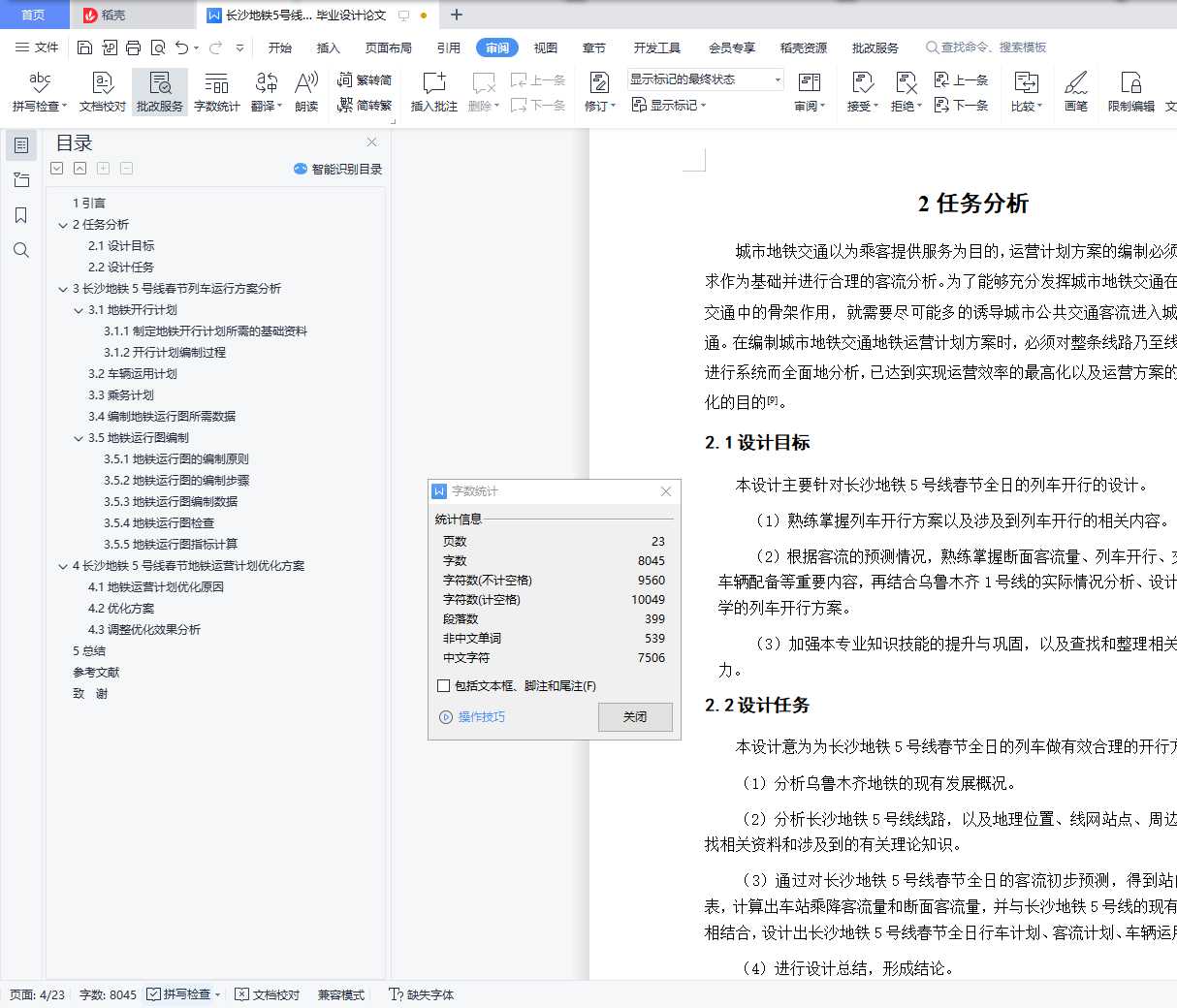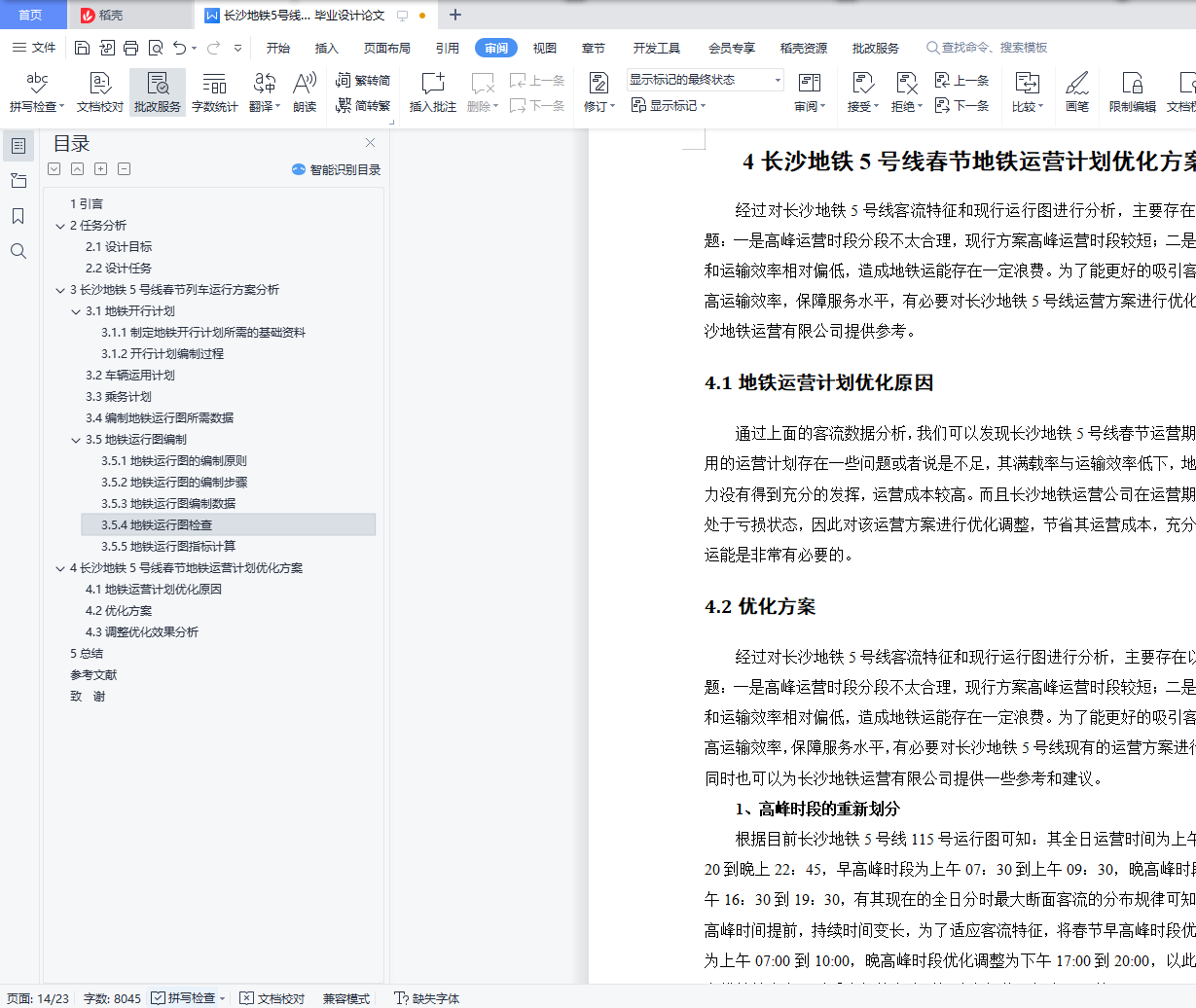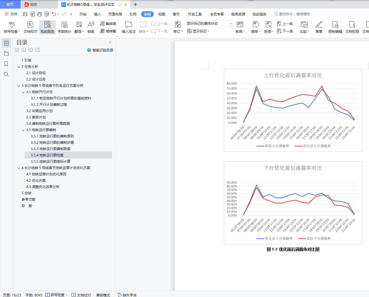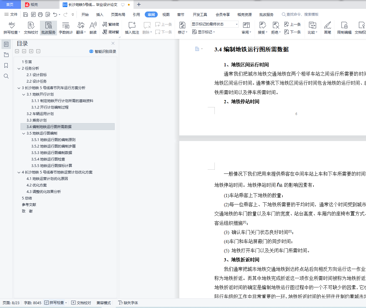 目 录1引言 12任务分析 22.1设计目标 22.2设计任务 23长沙地铁5号线春节列车运行方案分析 33.1地铁开行计划 33.1.1制定地铁开行计划所需的基础资料 33.1.2开行计划编制过程 43.2车辆运用计划 53.3乘务计划 63.4编制地铁运行图所需数据 63.5地铁运行图编制 73.5.1地铁运行图的编制原则 73.5.2地铁运行图的编制步骤 83.5.3地铁运行图编制数据 93.5.4地铁运行图检查 103.5.5地铁运行图指标计算 114长沙地铁5号线春节地铁运营计划优化方案 124.1地铁运营计划优化原因 124.2优化方案 124.3调整优化效果分析 145总结 18参考文献 19致 谢 211引言长沙地铁5号线于2020年6月28日开通试运营。长沙市轨道交通5号线呈南北走向,南起天心区解放垸大托西站,北至长沙县北三环安沙路站,线路全长35km,共设26个车站。全线在线路北端设水渡河车辆段、在线路南端设置大托西停车场。5号线一期工程(时代阳光大道~蟠龙路)沿万家丽路布置,南起雨花区毛竹塘站,北至长沙县水渡河站,线路全长22.5km,设车站18座,均为地下车站,平均站间距1.28km。地铁作为长沙的新兴事物,在现有的长沙城市地铁交通5号线设备系统以及保证相应的服务水平和地铁运力的前提下,经济合理地运用地铁车辆,实现最科学合理、最有经济效益,能够最有效的降低运营部门的运营成本以及最大限度地为乘客提供方便[16];在保证行车安全以及科学合理的前提下,通过采用缩短地铁的折返时间和停站时间的方式来提高地铁运行效率;在高峰时段,尽量合理的安排地铁地铁的发车间隔,一定程度上提高服务水平;在平峰时段,在合理范围内去调整发车间隔,提高地铁运输效率;在保证安全、环保、乘客舒适度前提下,一定程度上提高地铁的区间运行速度,缩短地铁的运行时间。在原有的地铁运营计划下对其进行优化调整,以达到最大化利用现有资源以及更方便城市居民出行是很有必要的。
