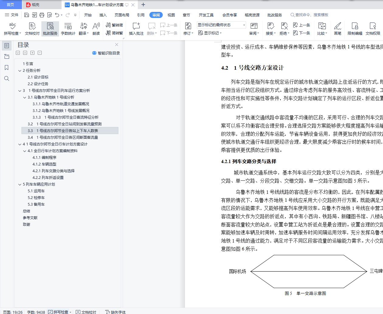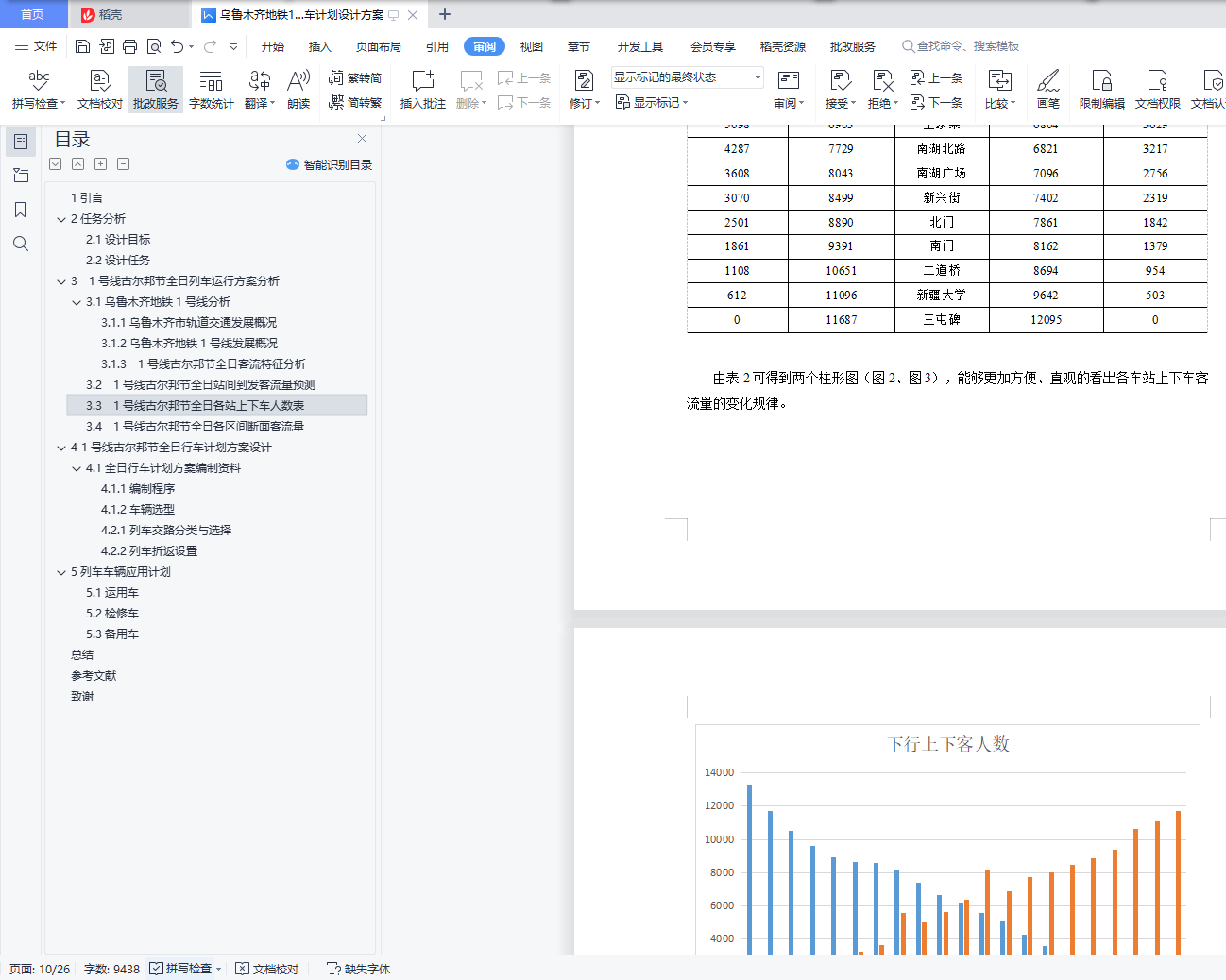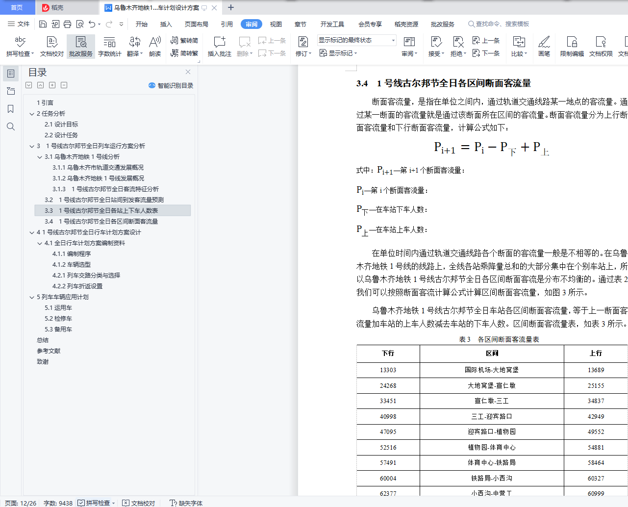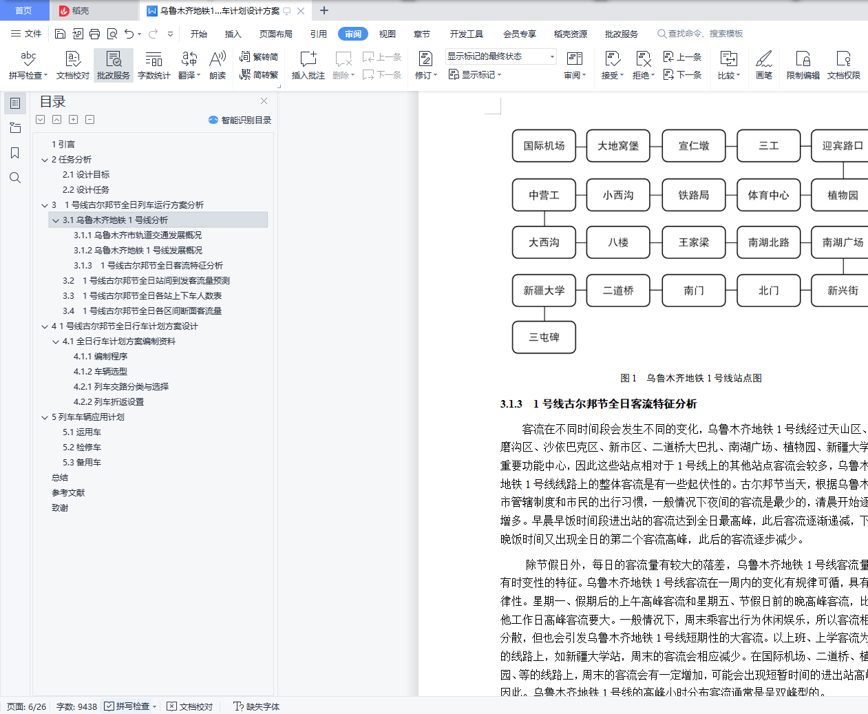 毕业设计成果《乌鲁木齐地铁1号线古尔邦节全日行车计划设计方案》目 录1引言 32任务分析 42.1设计目标 42.2设计任务 43 1号线古尔邦节全日列车运行方案分析 53.1乌鲁木齐地铁1号线分析 53.1.1乌鲁木齐市轨道交通发展概况 53.1.2乌鲁木齐地铁1号线发展概况 53.1.3 1号线古尔邦节全日客流特征分析 63.2 1号线古尔邦节全日站间到发客流量预测 73.3 1号线古尔邦节全日各站上下车人数表 103.4 1号线古尔邦节全日各区间断面客流量 124 1号线古尔邦节全日行车计划方案设计 144.1全日行车计划方案编制资料 144.1.1编制程序 144.1.2车辆选型 184.2 1号线交路方案设计 194.2.1列车交路分类与选择 194.2.2列车折返设置 204.2.3列车停车方案设计 215列车车辆应用计划 225.1运用车 225.2检修车 225.3备用车 23总结 24参考文献 25致谢 261引言乌鲁木齐作为新疆首府城市,截至2018年,常住人口350.58万人,城镇人口261.57万人,城镇化率74.61%。随着乌鲁木齐的城镇率在逐年增加,城市轨道交通的运输压力也在同时增大,地铁是缓解运输压力和缓解城市交通拥挤的最佳交通工具。现代地铁有首都城市名片和观光车的美誉,不尽能够促进城市经济发展与繁荣,还能成为城市文化形象的象征,同时减轻城市的交通压力,给人们带来更加轻松、快捷、舒适的生活出行方式。对于乌鲁木齐而言,发展地铁无疑是使其更加稳步快速发展的必要选择。乌鲁木齐地铁的建设,是城市可持续性发展的需要。然而,地铁的建设需要花费巨资,更需要多方面综合考虑众多因素,而目前需要解决的是怎样设计出合理的地铁列车开行方案,为了在将来能够取得更高的经济和社会效益。本设计意为设计出科学合理的列车开行方案,更好地发挥出乌鲁木齐地铁的最大运营能力,提高地铁运行效率,减少乘客平均出行时间,给旅客带来更舒适、愉快、便捷的出行体验。令市民更热爱生活,热爱乌鲁木齐,为乌鲁木齐的发展增光添彩。