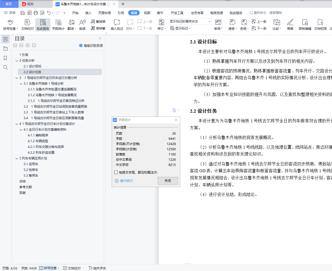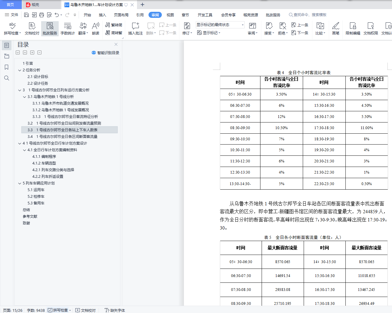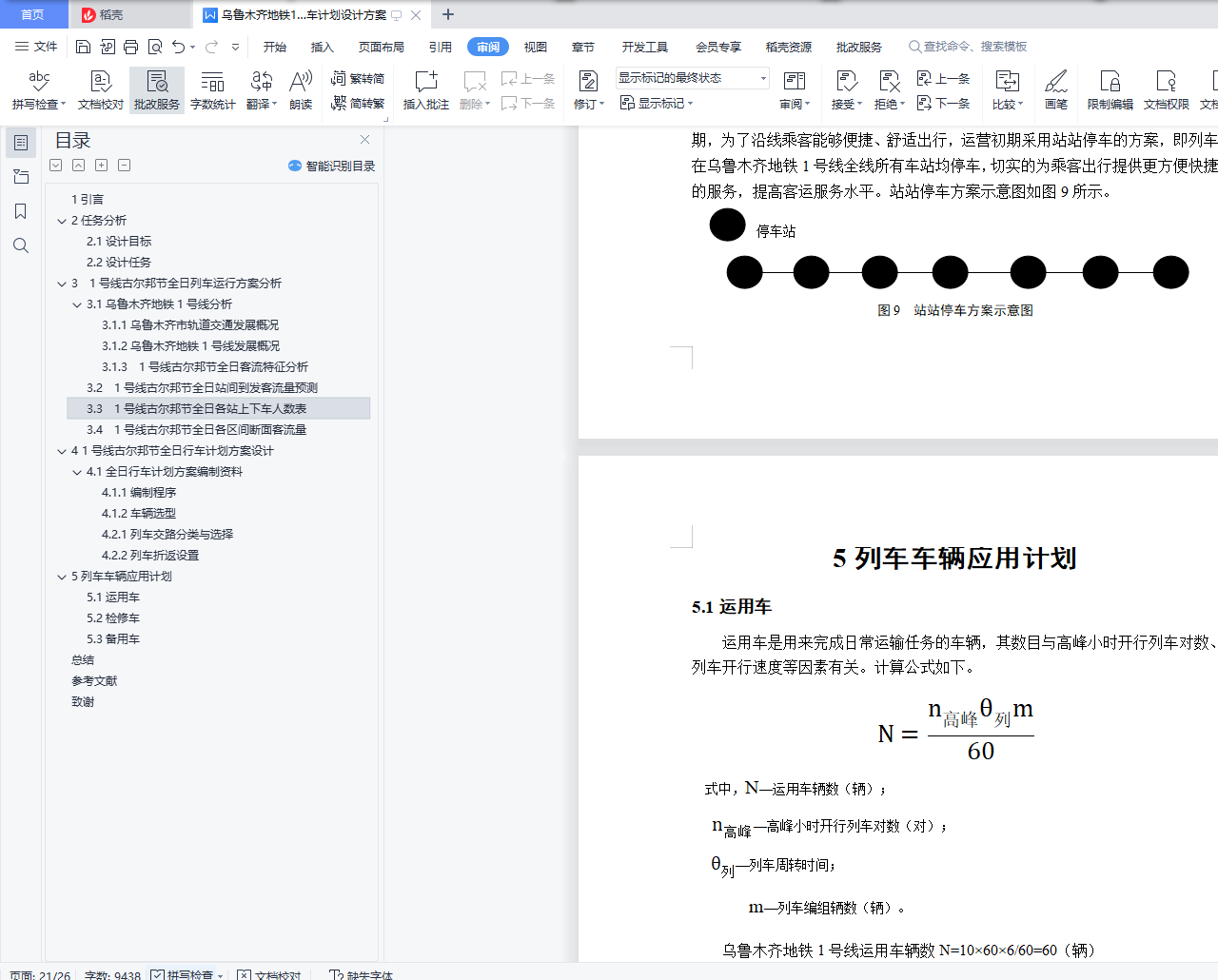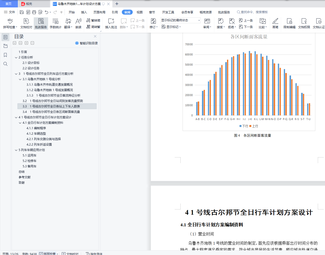 毕业设计成果《乌鲁木齐地铁1号线古尔邦节全日行车计划设计方案》目 录1引言 32任务分析 42.1设计目标 42.2设计任务 43 1号线古尔邦节全日列车运行方案分析 53.1乌鲁木齐地铁1号线分析 53.1.1乌鲁木齐市轨道交通发展概况 53.1.2乌鲁木齐地铁1号线发展概况 53.1.3 1号线古尔邦节全日客流特征分析 63.2 1号线古尔邦节全日站间到发客流量预测 73.3 1号线古尔邦节全日各站上下车人数表 103.4 1号线古尔邦节全日各区间断面客流量 124 1号线古尔邦节全日行车计划方案设计 144.1全日行车计划方案编制资料 144.1.1编制程序 144.1.2车辆选型 184.2 1号线交路方案设计 194.2.1列车交路分类与选择 194.2.2列车折返设置 204.2.3列车停车方案设计 215列车车辆应用计划 225.1运用车 225.2检修车 225.3备用车 23总结 24参考文献 25致谢 261引言乌鲁木齐作为新疆首府城市,截至2018年,常住人口350.58万人,城镇人口261.57万人,城镇化率74.61%。随着乌鲁木齐的城镇率在逐年增加,城市轨道交通的运输压力也在同时增大,地铁是缓解运输压力和缓解城市交通拥挤的最佳交通工具。现代地铁有首都城市名片和观光车的美誉,不尽能够促进城市经济发展与繁荣,还能成为城市文化形象的象征,同时减轻城市的交通压力,给人们带来更加轻松、快捷、舒适的生活出行方式。对于乌鲁木齐而言,发展地铁无疑是使其更加稳步快速发展的必要选择。乌鲁木齐地铁的建设,是城市可持续性发展的需要。然而,地铁的建设需要花费巨资,更需要多方面综合考虑众多因素,而目前需要解决的是怎样设计出合理的地铁列车开行方案,为了在将来能够取得更高的经济和社会效益。本设计意为设计出科学合理的列车开行方案,更好地发挥出乌鲁木齐地铁的最大运营能力,提高地铁运行效率,减少乘客平均出行时间,给旅客带来更舒适、愉快、便捷的出行体验。令市民更热爱生活,热爱乌鲁木齐,为乌鲁木齐的发展增光添彩。