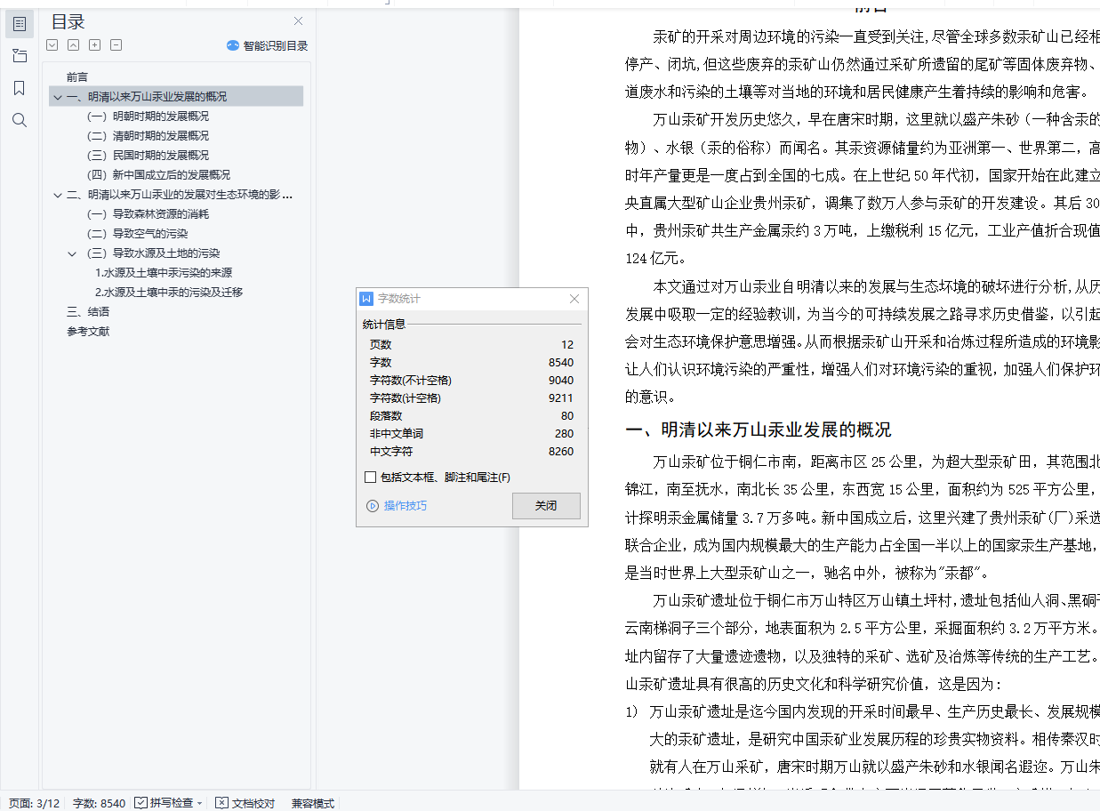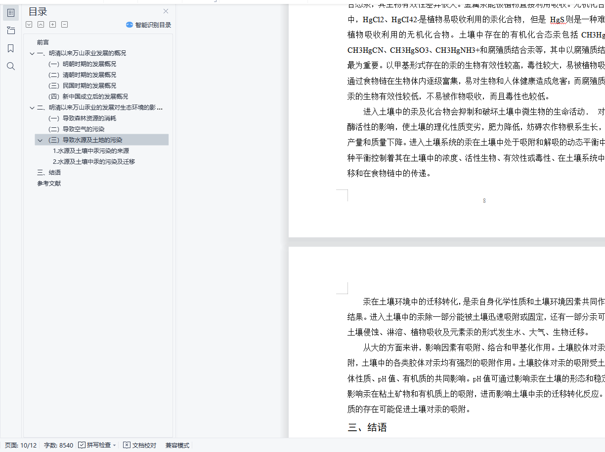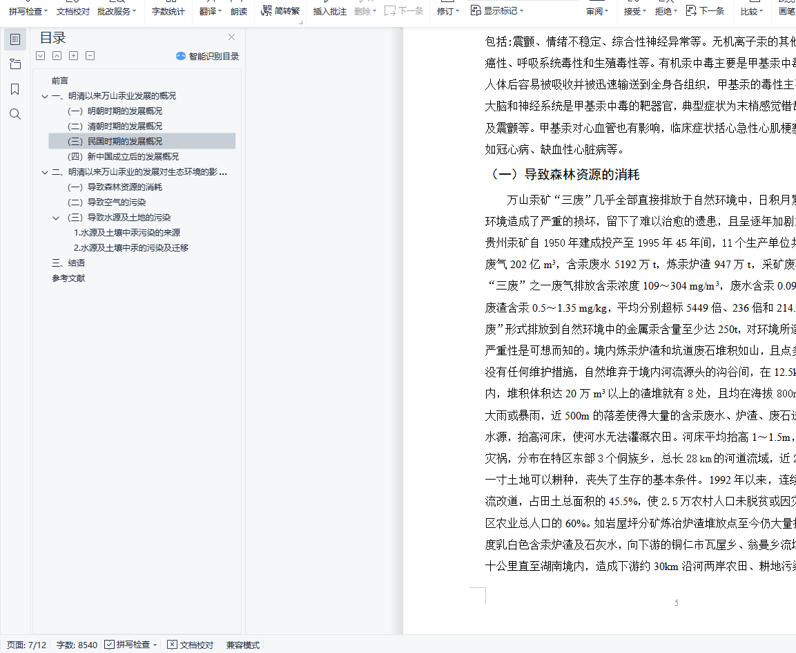 明清以来万山汞业发展与生态环境的变迁摘要汞矿山开采对周边环境的汞污染一直受到关注,尽管全球多数汞矿山已经相继停产、闭坑,但这些废弃的汞矿山仍然通过采矿所遗留的尾矿等固体废弃物、坑道废水和污染的土壤等对当地的环境和居民健康产生着持续的影响和危害。汞由于特殊的物理化学性质和强的毒性, 对环境及人体健康极具危害,已经成为全球关注的污染物。本文通过对万山汞业自明清以来的发展与生态坏境的变迁进行分析,评述了全球范围内汞矿的分布以及汞矿山开采和冶炼过程所造成的环境影响,提出了对于污染治理和风险评价的展望。关键词:汞矿;万山汞矿;生态环境变迁;汞污染目录前言 1一、明清以来万山汞业发展的概况 1(一)明朝时期的发展概况 3(二)清朝时期的发展概况 3(三)民国时期的发展概况 3(四)新中国成立后的发展概况 4二、明清以来万山汞业的发展对生态环境的影响 4(一)导致森林资源的消耗 5(二)导致空气的污染 6(三)导致水源及土地的污染 81.水源及土壤中汞污染的来源 82.水源及土壤中汞的污染及迁移 8三、结语 9参考文献 10