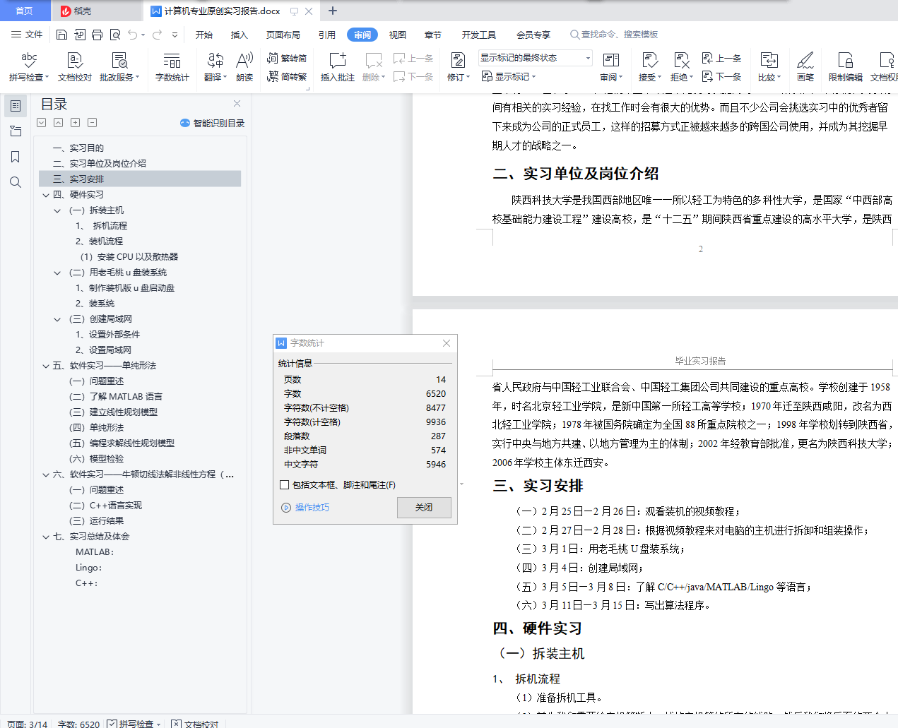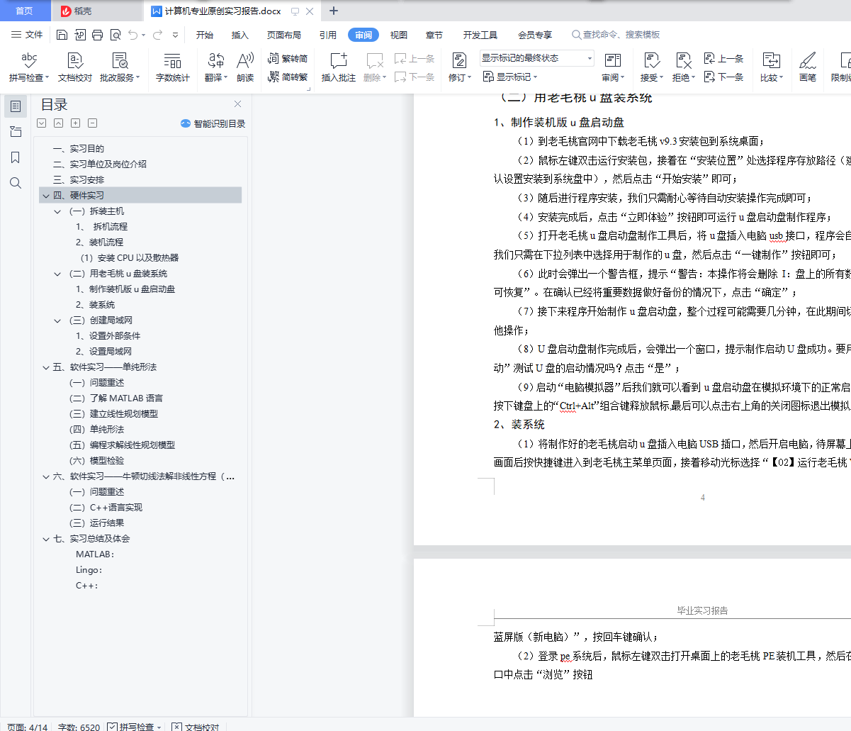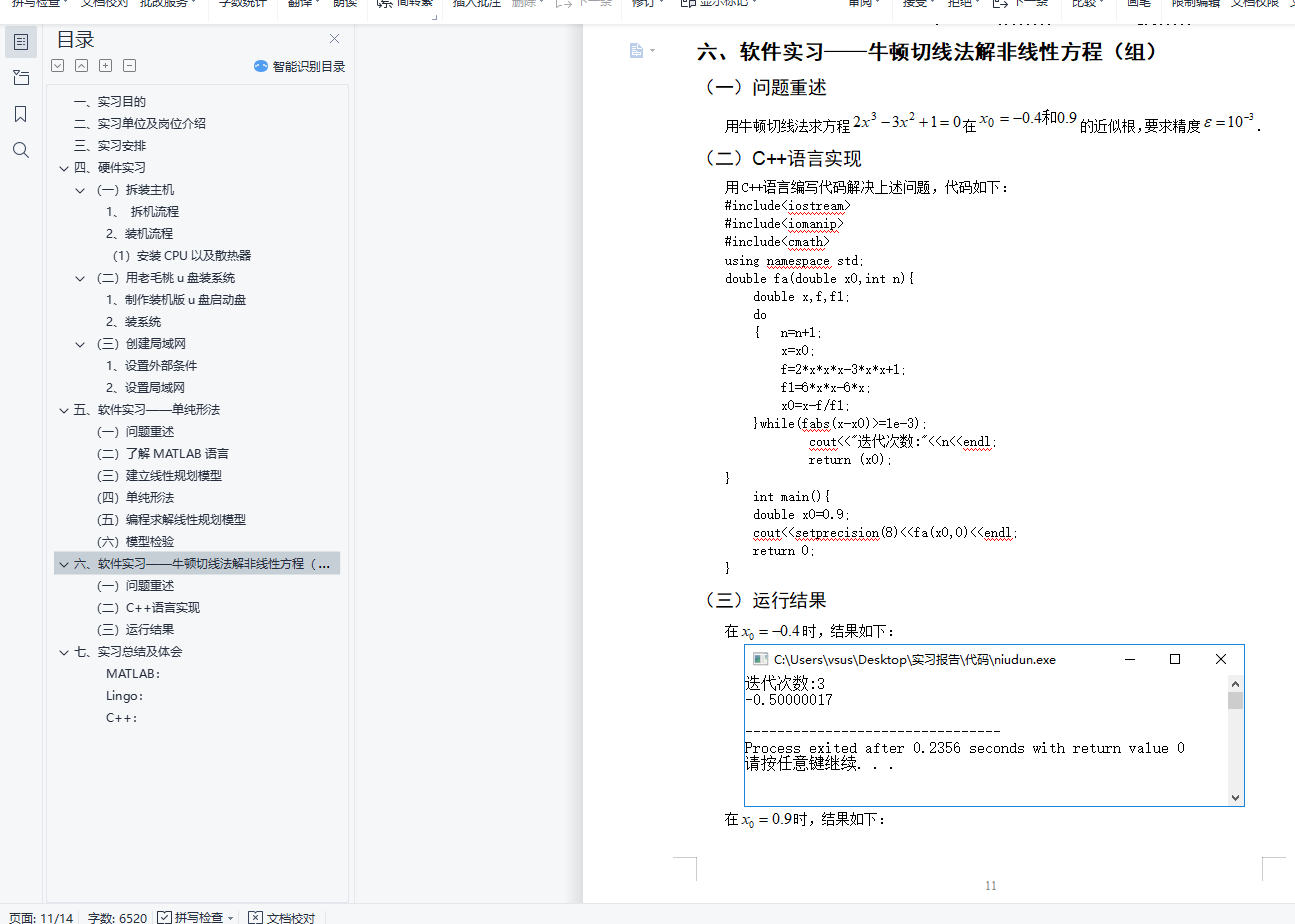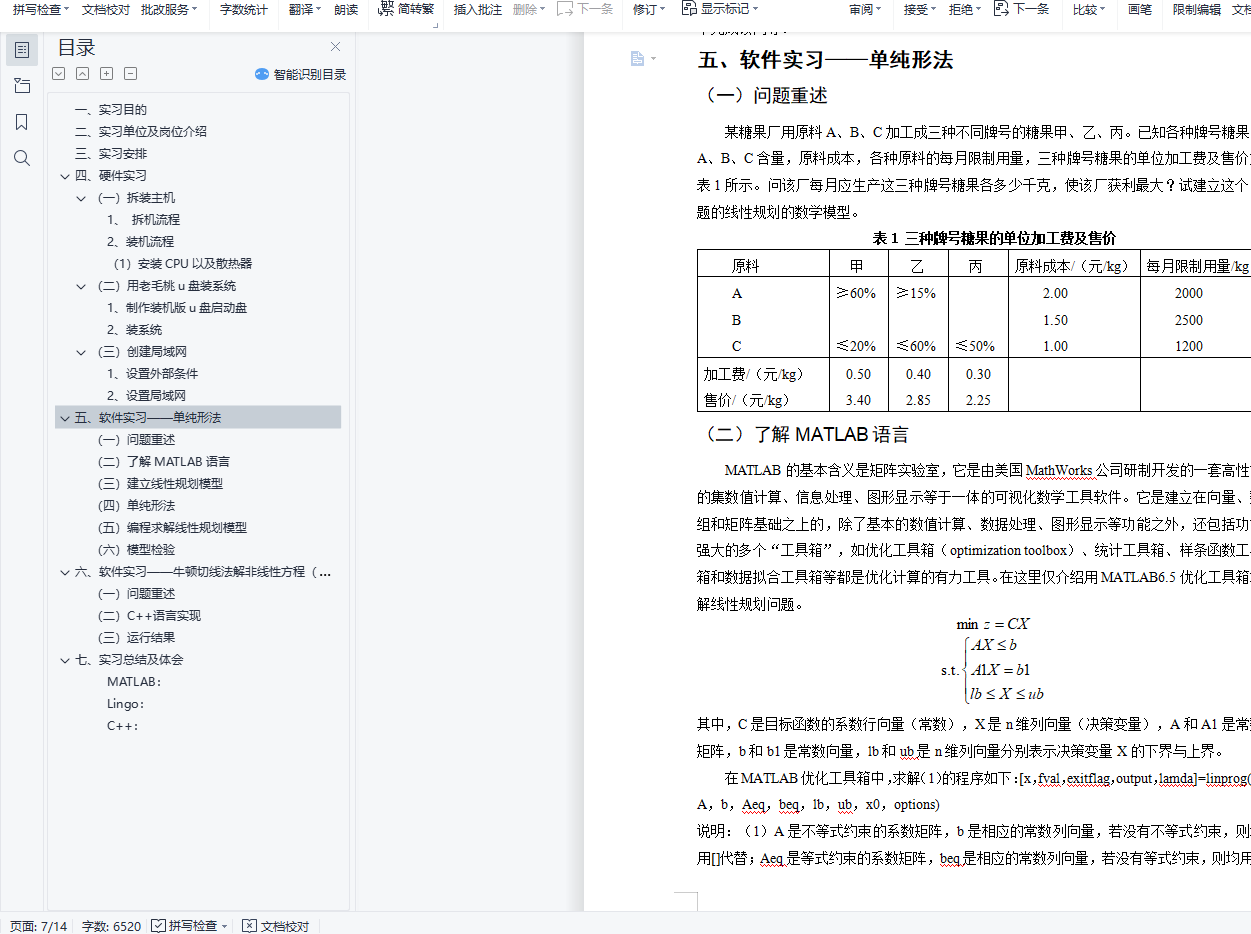 目录一、 实习目的 1二、实习单位及岗位介绍 2三、实习安排 3四、硬件实习 3(一)拆装主机 31、 拆机流程 32、装机流程 3(1)安装CPU以及散热器 3(二)用老毛桃u盘装系统 41、制作装机版u盘启动盘 42、装系统 4(三)创建局域网 51、设置外部条件 52、设置局域网 5五、 软件实习――单纯形法 6(一)问题重述 6(二)了解MATLAB语言 6(三)建立线性规划模型 7(四)单纯形法 8(五)编程求解线性规划模型 8(六)模型检验 9六、软件实习――牛顿切线法解非线性方程(组) 10(一)问题重述 10(二)C++语言实现 10(三)运行结果 10七、实习总结及体会 11MATLAB: 12Lingo: 12C++: 12毕业实习报告一、实习目的(一)、加深对职业与行业的了解,确认喜欢或擅长的职业了解职业行业有很多方法,譬如阅读相关的文章,请教业内人士,但最直接的方法还是亲自做这份工作。在做的过程中,你可以确定自己是否喜欢这份工作,自己能否胜任。如果喜欢又胜任,以后毕业找工作,就可以把它作为目标职业;反之,就要寻找新的工作方向。