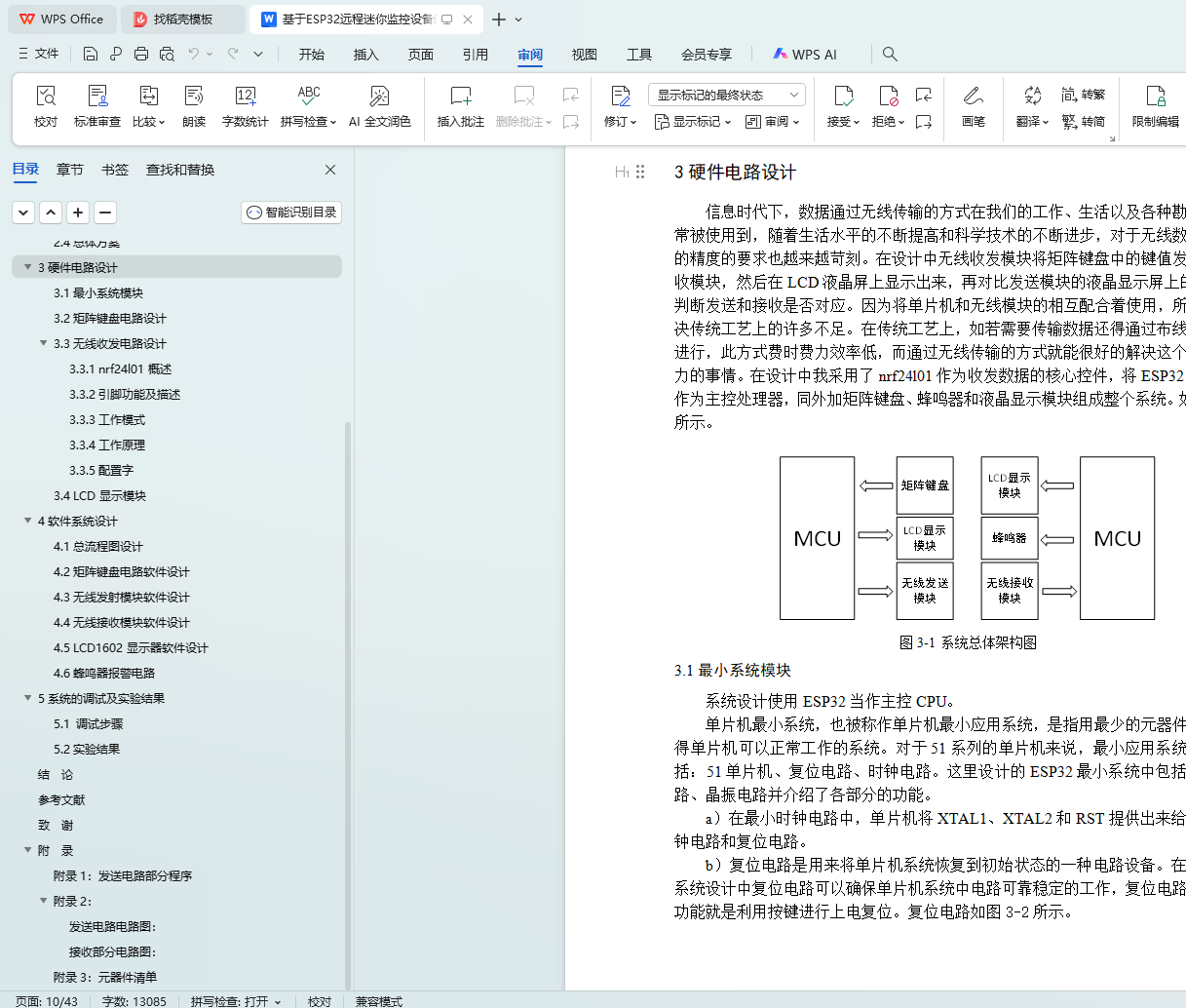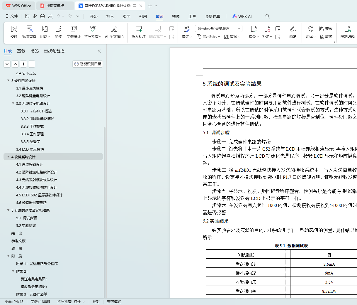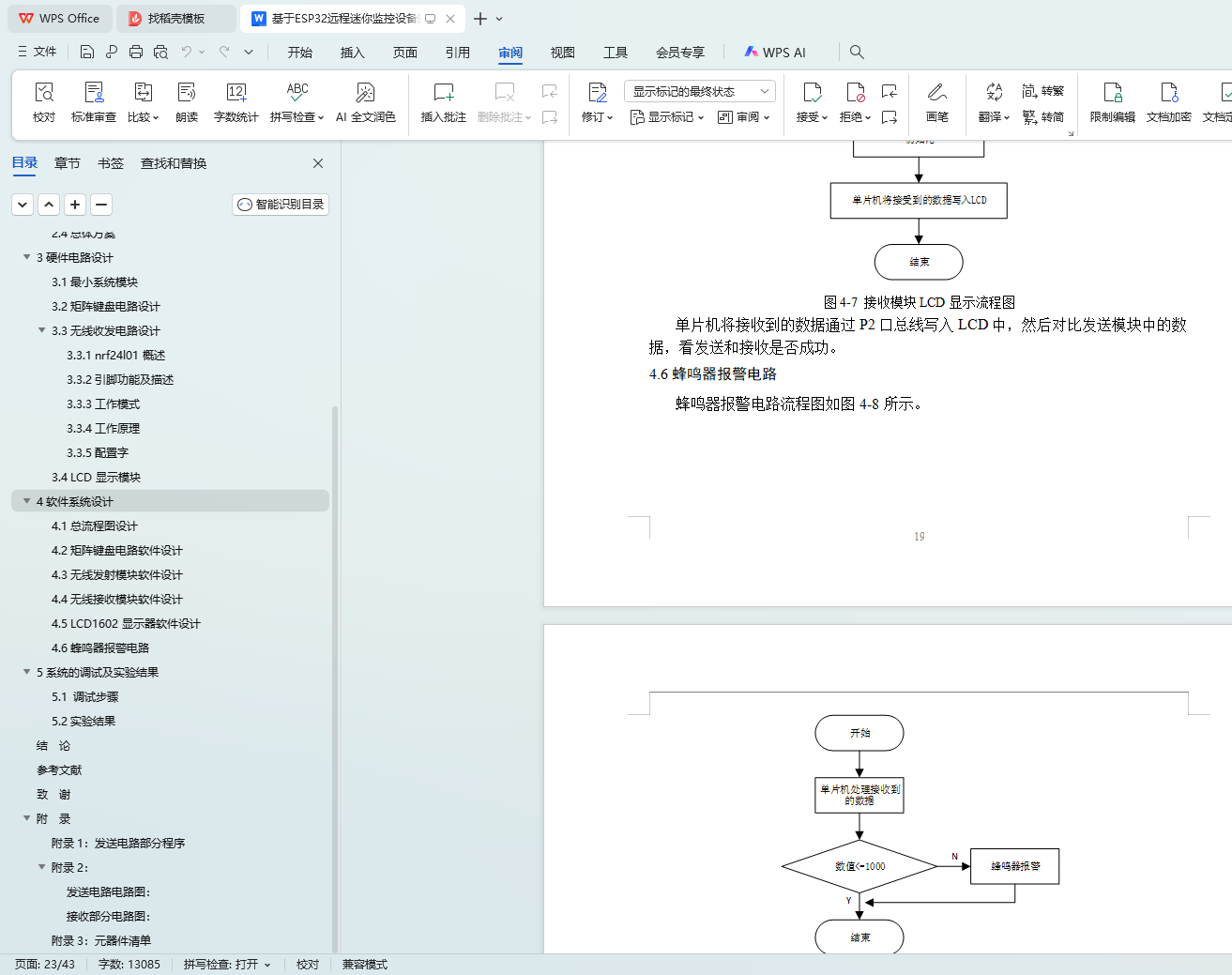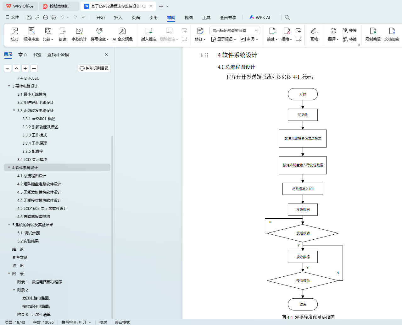软件部分采用了模块化的设计方法,主要包括主程序、无线发射模块子程序、无线接收子程序、按键检测子程序、液晶显示子程序以及报警模块子程序。这种模块化的设计使得系统更加易于调试和维护,同时也提高了系统的可扩展性和灵活性。