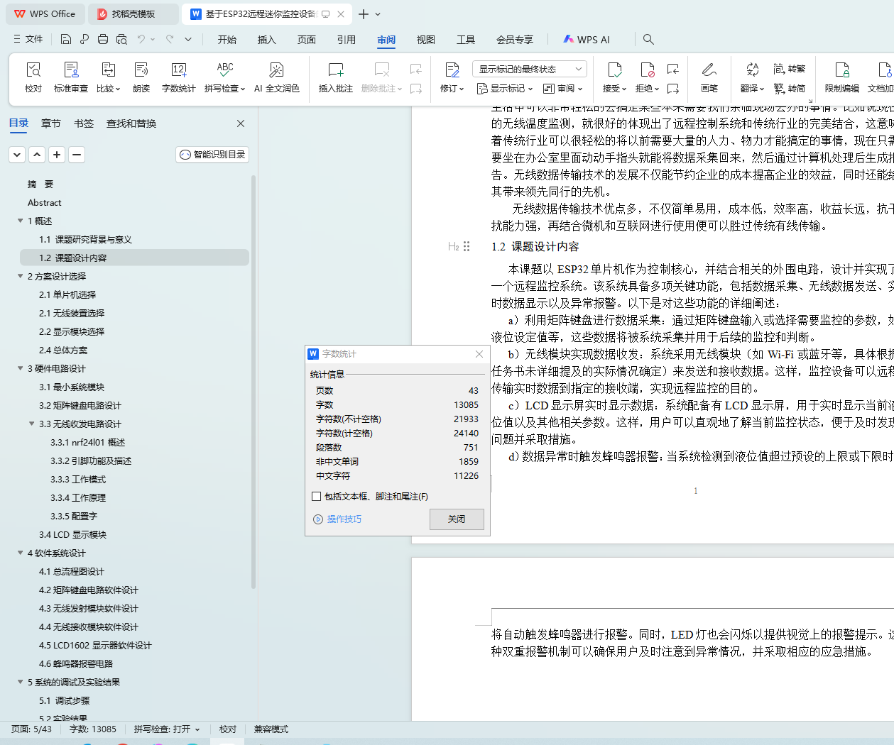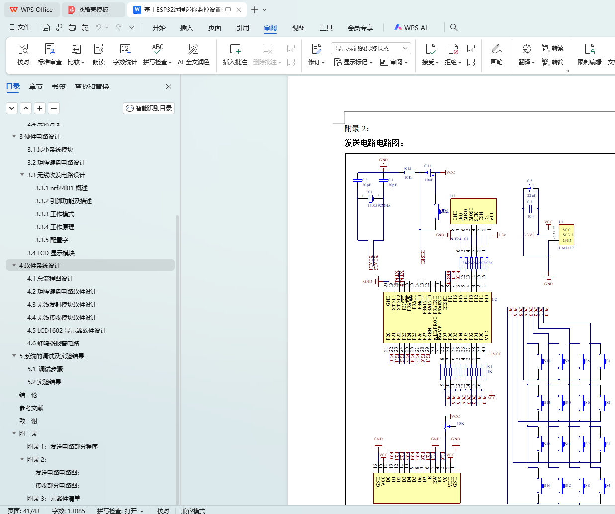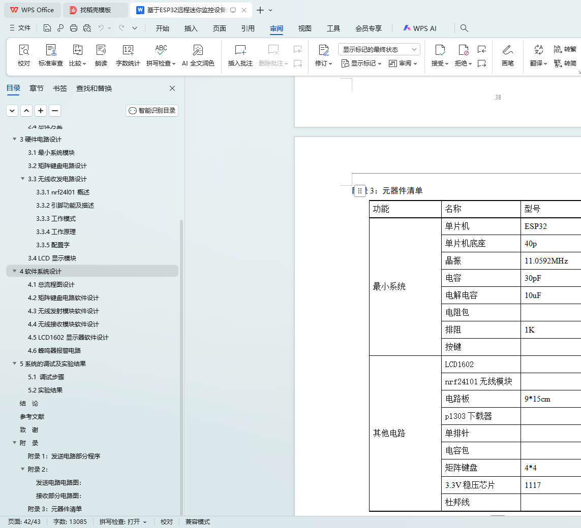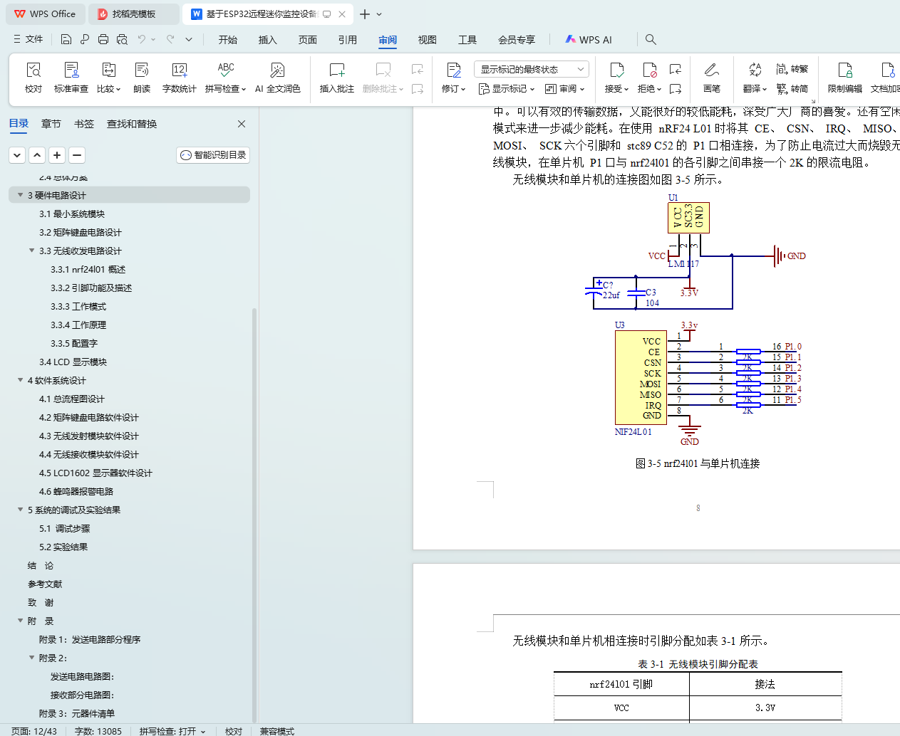 软件部分采用了模块化的设计方法,主要包括主程序、无线发射模块子程序、无线接收子程序、按键检测子程序、液晶显示子程序以及报警模块子程序。这种模块化的设计使得系统更加易于调试和维护,同时也提高了系统的可扩展性和灵活性。