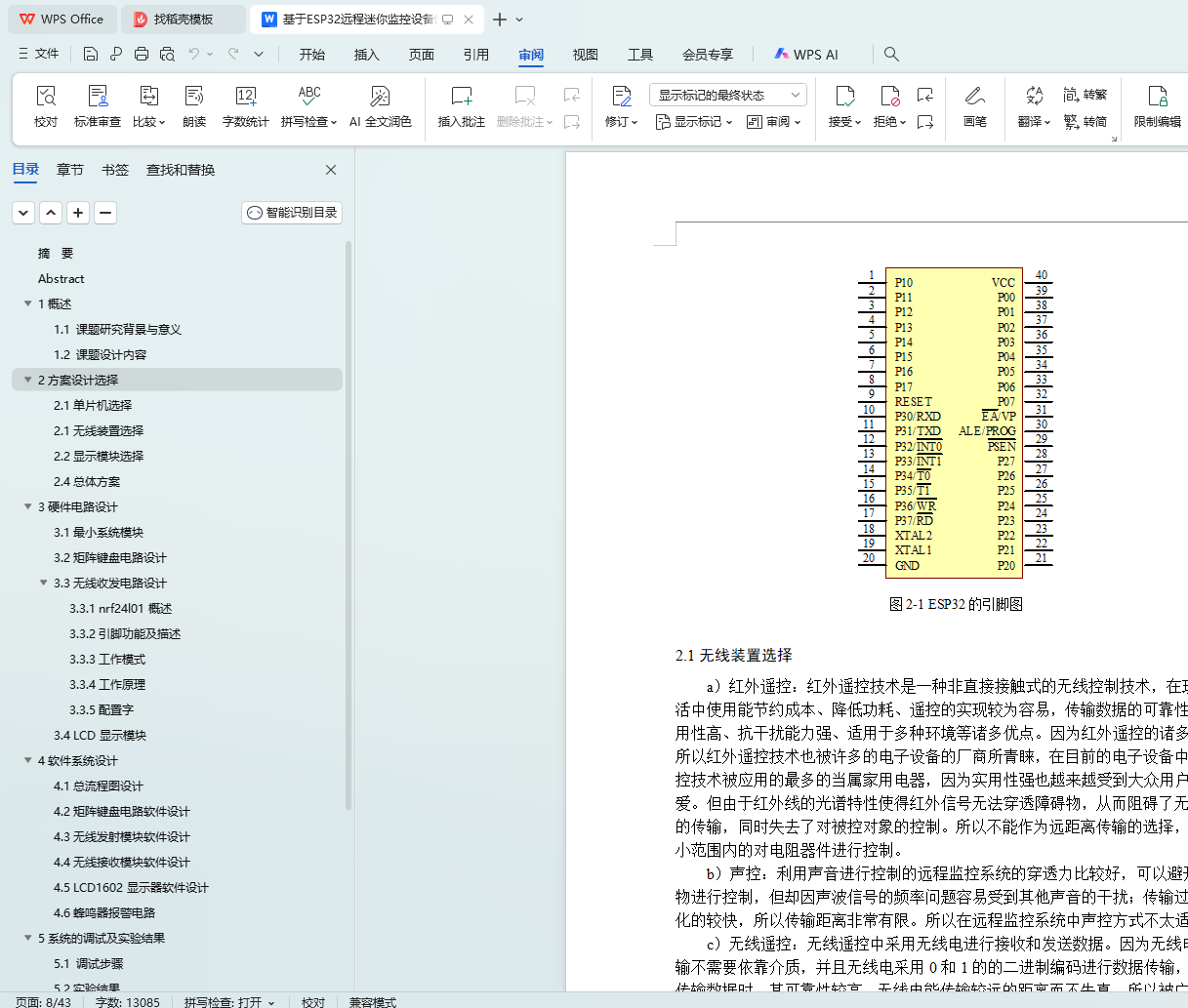 在设计过程中,我们根据远程监控系统的主要功能需求,提出了详细的设计方案,并进行了充分的论证。设计方案涵盖了硬件和软件两大部分。硬件部分主要包括单片机最小系统、矩阵键盘模块、无线收发模块、显示模块以及报警模块。其中,单片机选用了宏晶科技公司的ESP32,以其强大的性能和稳定性确保系统的稳定运行。矩阵键盘模块用于输入模拟液位数据值,这些数据将通过无线模块进行传输和处理。1602液晶显示器则用于显示高塔液位信息,并与输入值进行比较,以便操作人员作出判断。报警模块则包括发光二极管和蜂鸣器,用于在异常情况发生时提供及时的报警提示。
