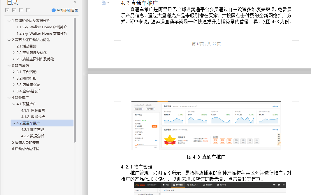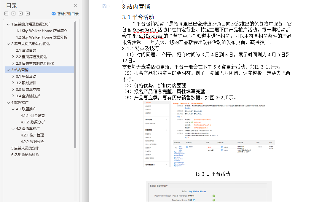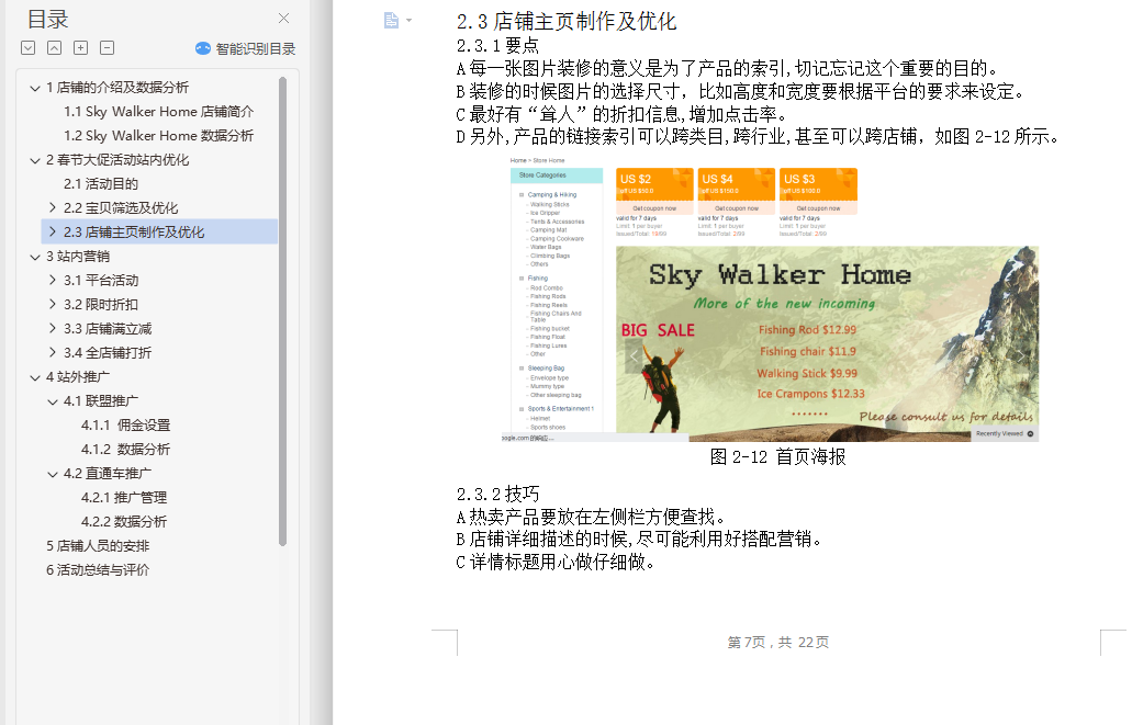 摘要:速卖通(AliExpress)是阿里巴巴旗下的跨境小额外贸在线交易平台,它融合订单、支付、物流于一体。Sky Walker Home是在速卖通平台上经营的一家户外类运动产品的店铺,本方案为该店铺制定了春节促销活动的推广,从店铺数据分析,选品,活动设计,产品优化,站内站外推广等方面进行阐述,使本店铺能通过此次活动提高访客数、浏览量、转化量和销量,提升排名。