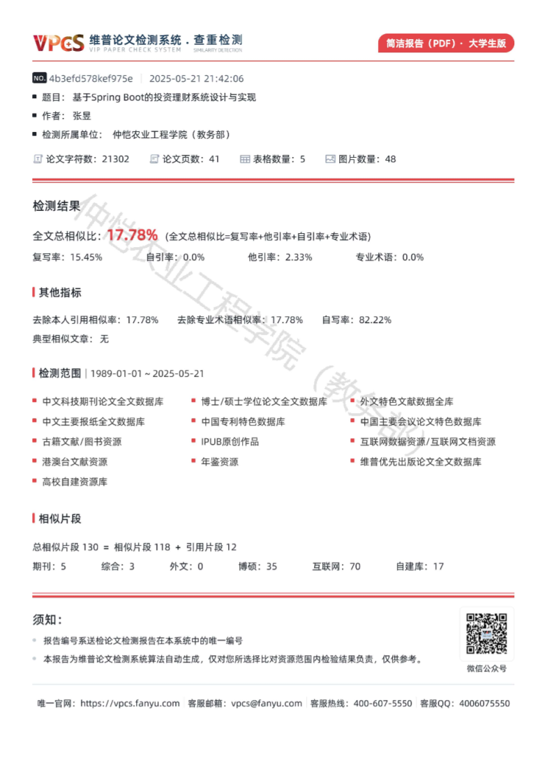 投资理财是现代经济体系的重要组成部分,对于个人财富增值和风险管理具有不可忽视的作用。在金融环境日益复杂的今天,高效的投资理财信息管理显得尤为关键。本文实现了一个基于Spring Boot的投资理财系统,系统采用MySQL数据库,实现对投资理财相关信息的高效管理。本系统涵盖了多个模块,包括用户端:用户信息审核模块、用户钱包模块、订单管理模块、投资理财模块,管理员端:产品管理模块、订单管理模块、系统管理模块等。在设计和实施基于Spring Boot的投资理财系统时,需要综合考虑多个因素,以确保系统界面的美观性、运行的流畅性,同时也要保证其全面性、实用性和用户账户的安全性。