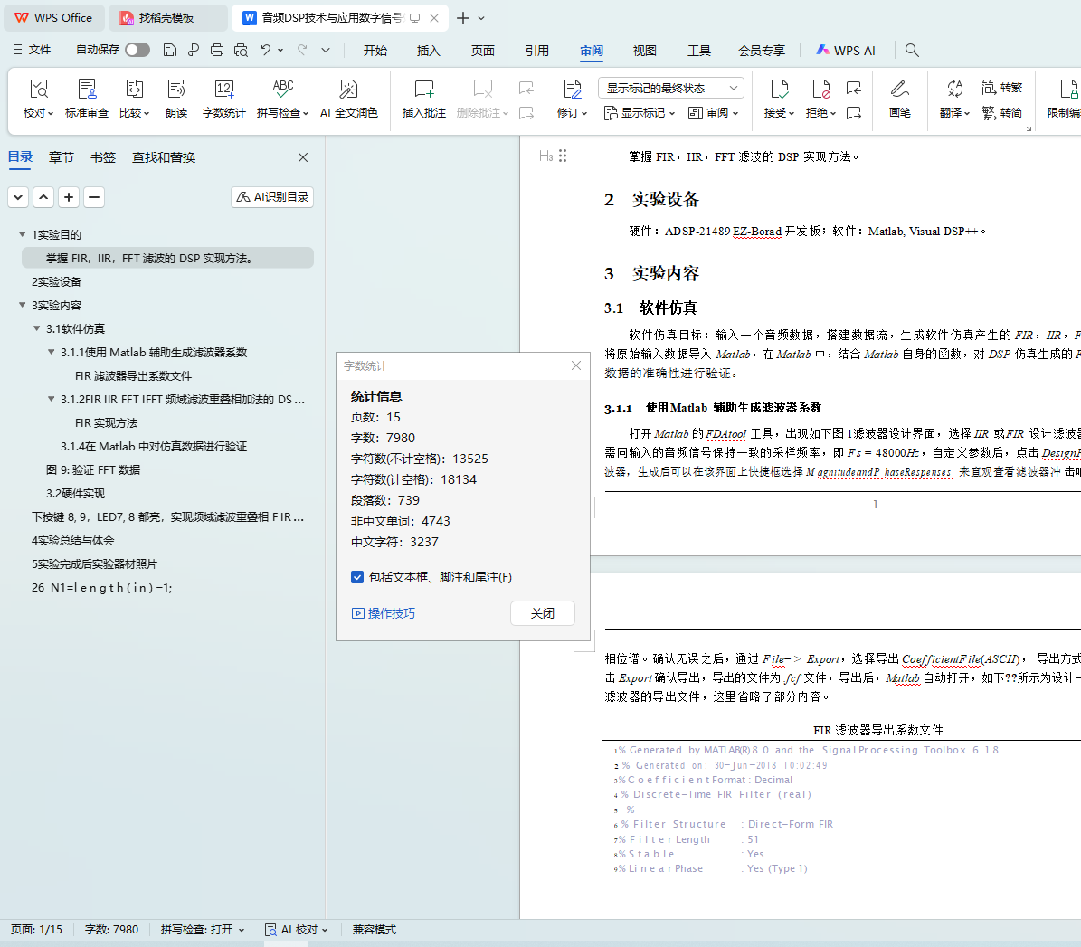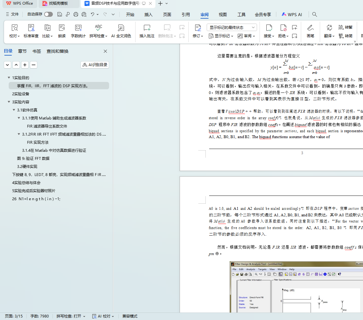 打开 Matlab 的 FDAtool 工具,出现如下图 1滤波器设计界面,选择 IIR 或 FIR 设计滤波器,注意这里需同输入的音频信号保持一致的采样频率,即 F s = 48000Hz,自定义参数后,点击 DesignF ilter 来生成滤波器,生成后可以在该界面上快捷框选择 M agnitudeandP haseRespenses 来直观查看滤波器冲 击响应的幅度谱和相位谱。确认无误之后,通过 F ile− > Export,选择导出 Coef f icientF ile(ASCII), 导出方式为 Decimal,点击 Export 确认导出,导出的文件为 .f cf 文件,导出后,M atlab 自动打开,如下??所示为设计一个 FIR,IIR 滤波器的导出文件,这里省略了部分内容。