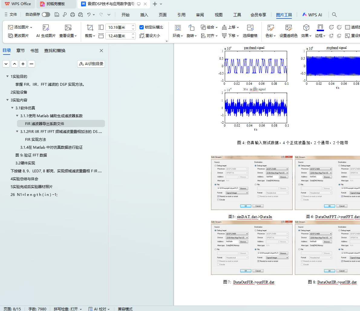 软件仿真目标:输入一个音频数据,搭建数据流,生成软件仿真产生的 FIR,IIR,FFT 数据文件; 将原始输入数据导入 Matlab,在 Matlab 中,结合 Matlab 自身的函数,对 DSP 仿真生成的 FIR,IIR, FFT 数据的准确性进行验证。