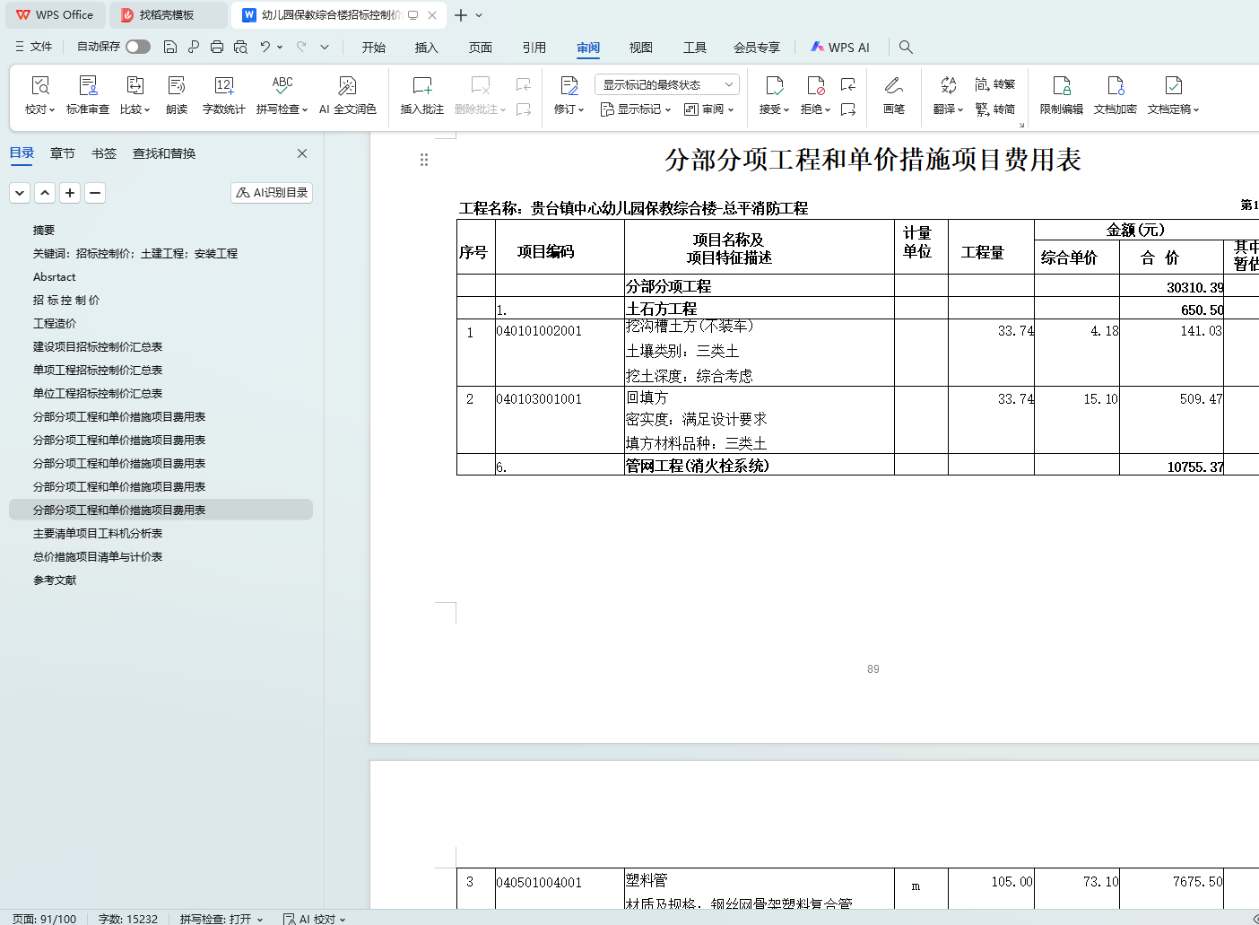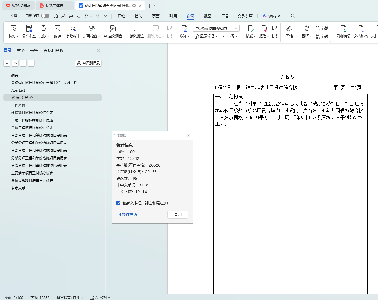 The design is the preparation of the bidding control price of the kindergarten in the center of Guitai Town, the project has a total of 4 floors, the building height is 15.45m, the total construction area: 1775.04 square meters, covers an area of 439.19 square meters, the building structure is in the form of a frame structure, and the construction project grade is three. The total cost of the project: 3,963,673.35 yuan, including construction engineering: 3,049,581.40 yuan, including installation engineering: 766,118.10 yuan, wall ancillary engineering: 113,189.31 yuan, total fire engineering: 34,784.54 yuan.