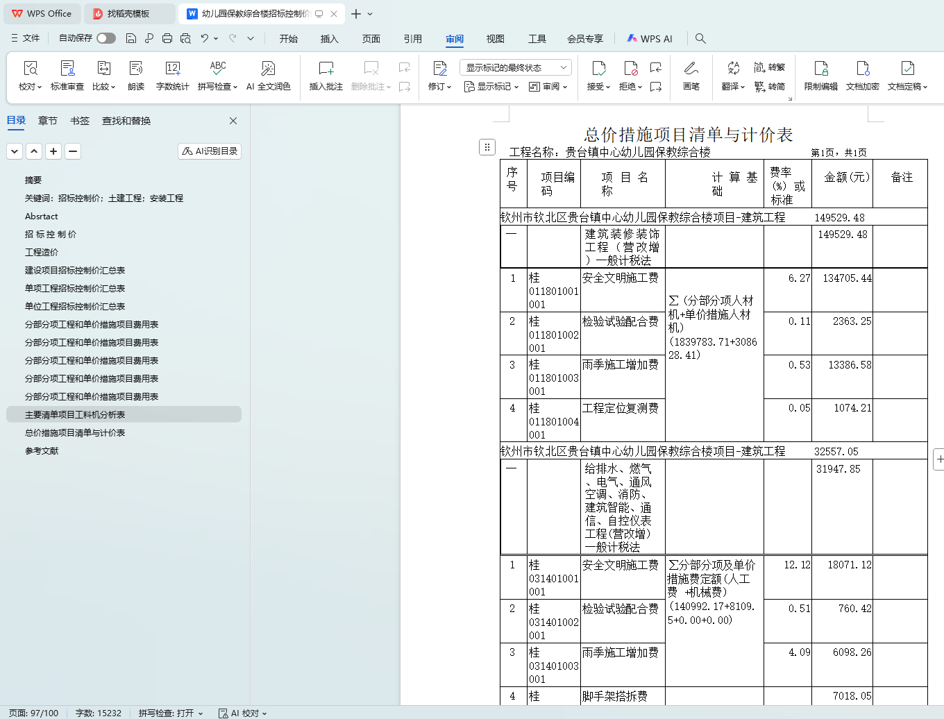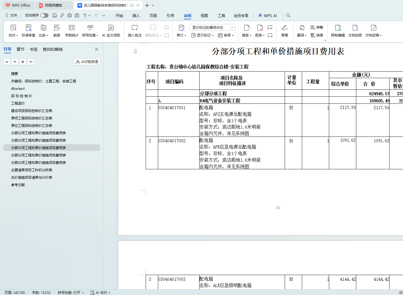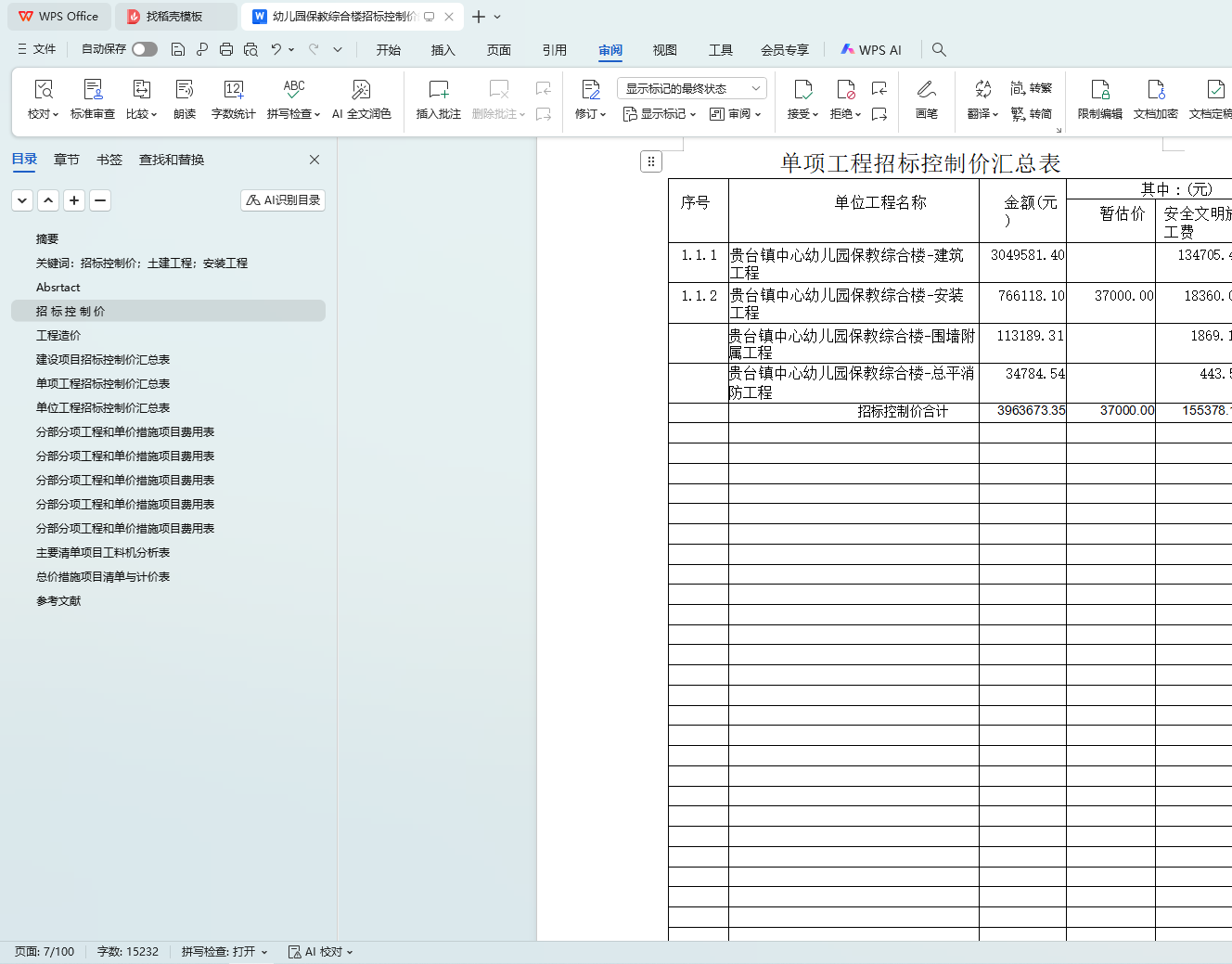 本设计为贵台镇中心幼儿园保教综合楼招标控制价的编制,本工程一共4层,建筑高度15.45m,总建筑面积:1775.04平方米,占地面积:439.19平方米,建筑结构形式为框架结构,建筑工程等级为三级。本工程总造价:3963673.35元,其中建筑工程:3049581.40元;其中安装工程:766118.10元,围墙附属工程:113189.31元,总平消防工程:34784.54元。