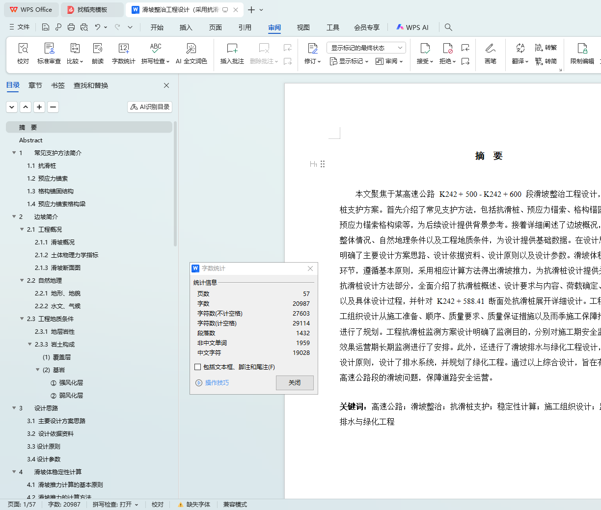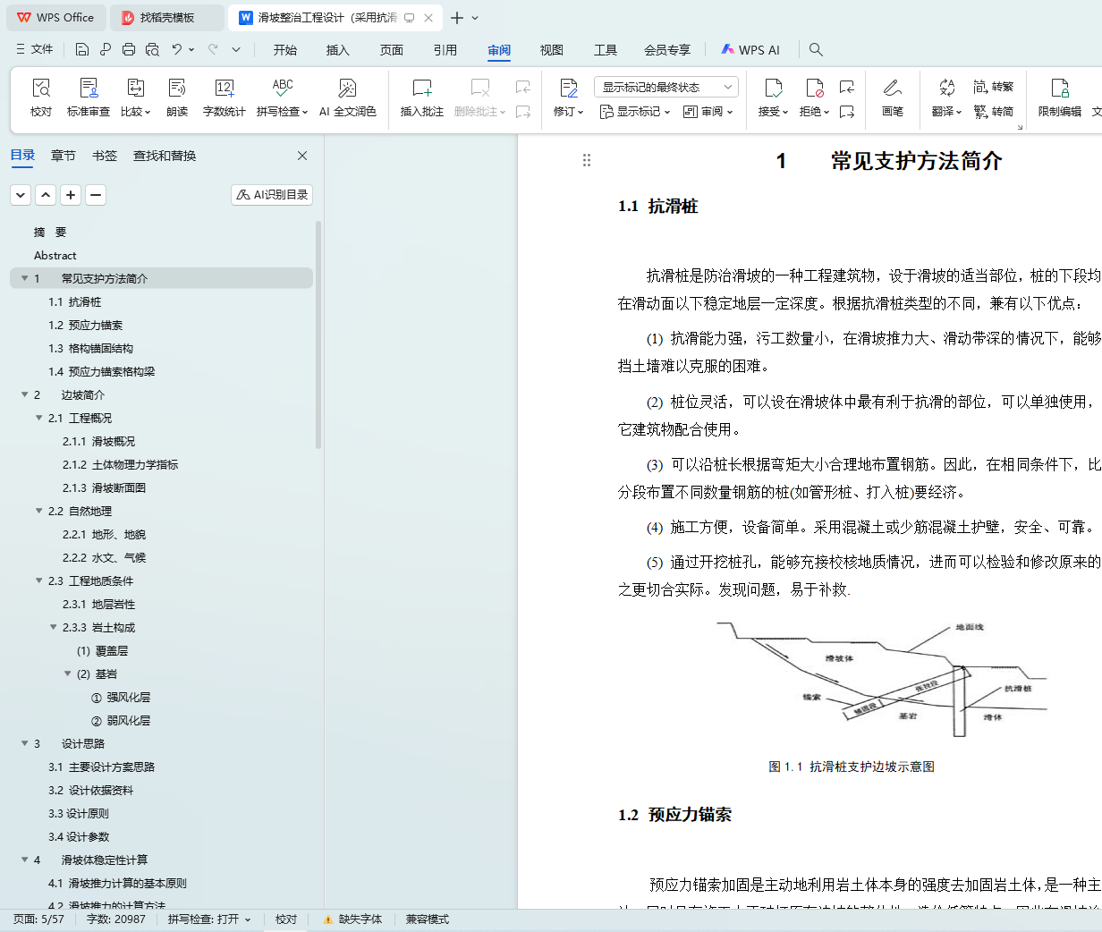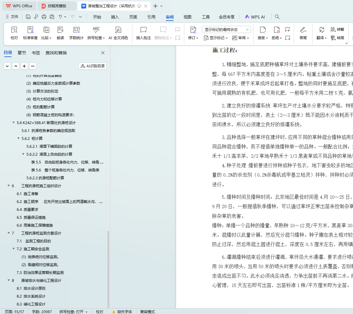 本文聚焦于某高速公路 K242 + 500 - K242 + 600 段滑坡整治工程设计,采用抗滑桩支护方案。首先介绍了常见支护方法,包括抗滑桩、预应力锚索、格构锚固结构以及预应力锚索格构梁等,为后续设计提供背景参考。接着详细阐述了边坡概况,涵盖工程整体情况、自然地理条件以及工程地质条件,为设计提供基础数据。在设计思路部分,明确了主要设计方案思路、设计依据资料、设计原则以及设计参数。滑坡体稳定性计算环节,遵循基本原则,采用相应计算方法得出滑坡推力,为抗滑桩设计提供关键参数。抗滑桩设计方法部分,全面介绍了抗滑桩概述、设计要求与内容、荷载确定、计算方法以及具体设计过程,并针对 K242 + 588.41 断面处抗滑桩展开详细设计。工程抗滑桩施工组织设计从施工准备、顺序、质量要求、质量保证措施以及雨季施工保障措施等方面进行了规划。工程抗滑桩监测方案设计明确了监测目的,分别对施工期安全监测和防治效果运营期长期监测进行了安排。此外,还进行了滑坡排水与绿化工程设计,遵循排水设计原则,设计了排水系统,并规划了绿化工程。通过以上综合设计,旨在有效整治该高速公路段的滑坡问题,保障道路安全运营。