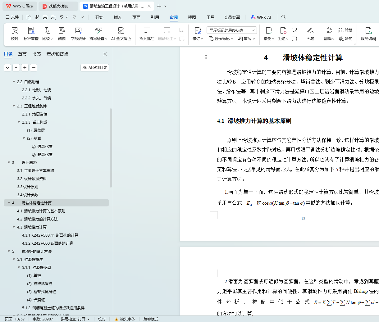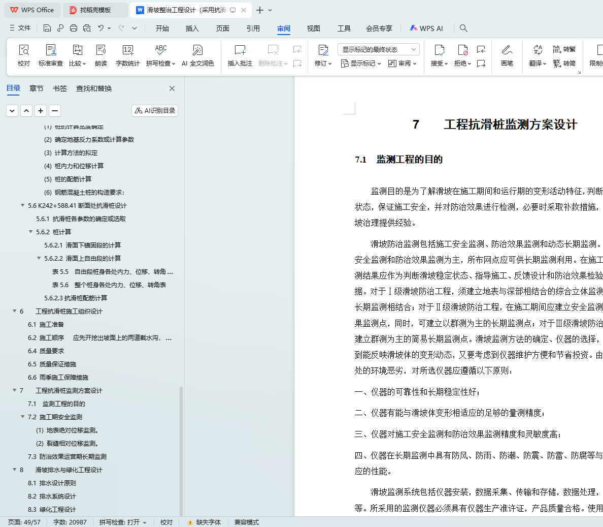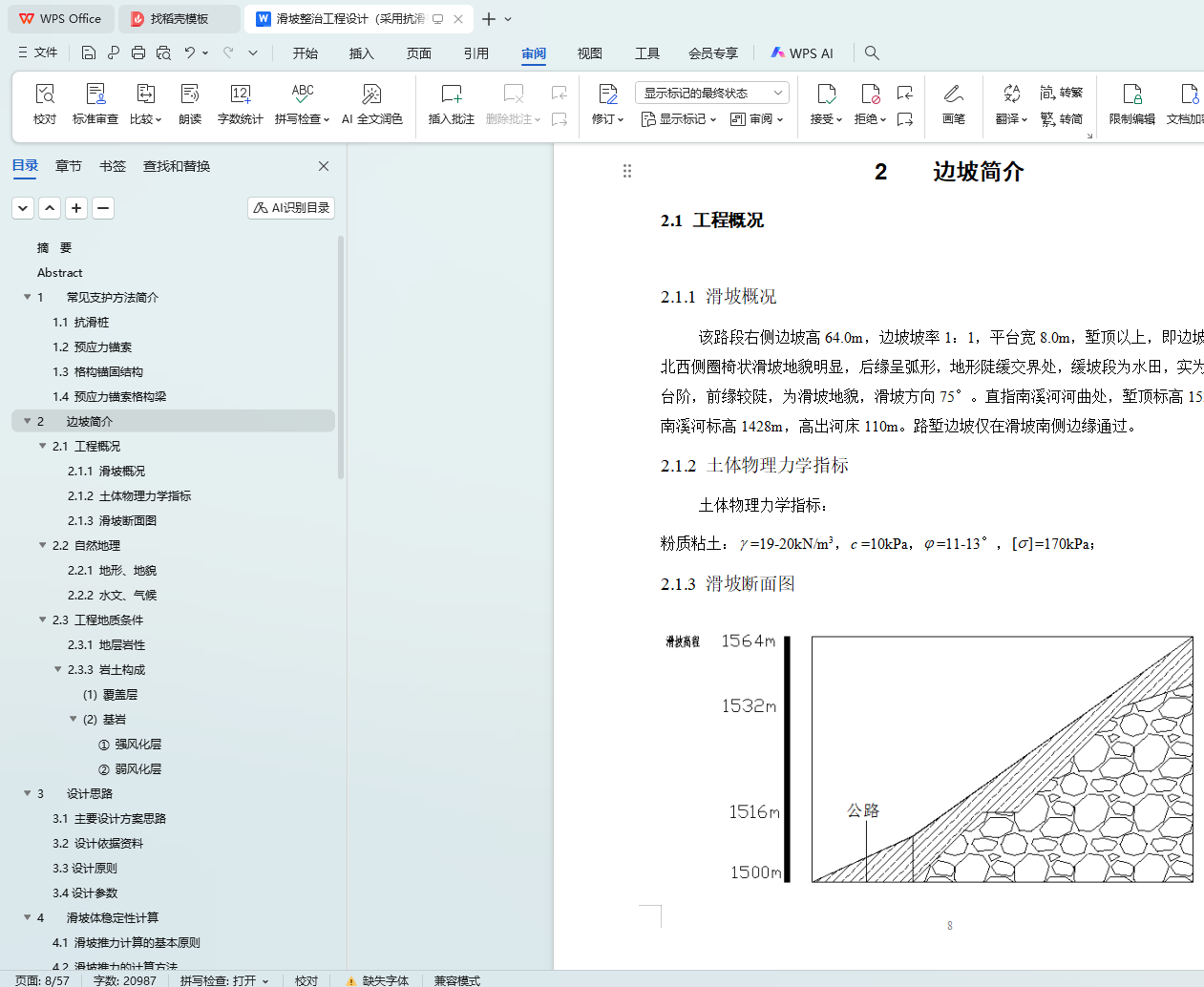 本文聚焦于某高速公路 K242 + 500 - K242 + 600 段滑坡整治工程设计,采用抗滑桩支护方案。首先介绍了常见支护方法,包括抗滑桩、预应力锚索、格构锚固结构以及预应力锚索格构梁等,为后续设计提供背景参考。接着详细阐述了边坡概况,涵盖工程整体情况、自然地理条件以及工程地质条件,为设计提供基础数据。在设计思路部分,明确了主要设计方案思路、设计依据资料、设计原则以及设计参数。滑坡体稳定性计算环节,遵循基本原则,采用相应计算方法得出滑坡推力,为抗滑桩设计提供关键参数。抗滑桩设计方法部分,全面介绍了抗滑桩概述、设计要求与内容、荷载确定、计算方法以及具体设计过程,并针对 K242 + 588.41 断面处抗滑桩展开详细设计。工程抗滑桩施工组织设计从施工准备、顺序、质量要求、质量保证措施以及雨季施工保障措施等方面进行了规划。工程抗滑桩监测方案设计明确了监测目的,分别对施工期安全监测和防治效果运营期长期监测进行了安排。此外,还进行了滑坡排水与绿化工程设计,遵循排水设计原则,设计了排水系统,并规划了绿化工程。通过以上综合设计,旨在有效整治该高速公路段的滑坡问题,保障道路安全运营。