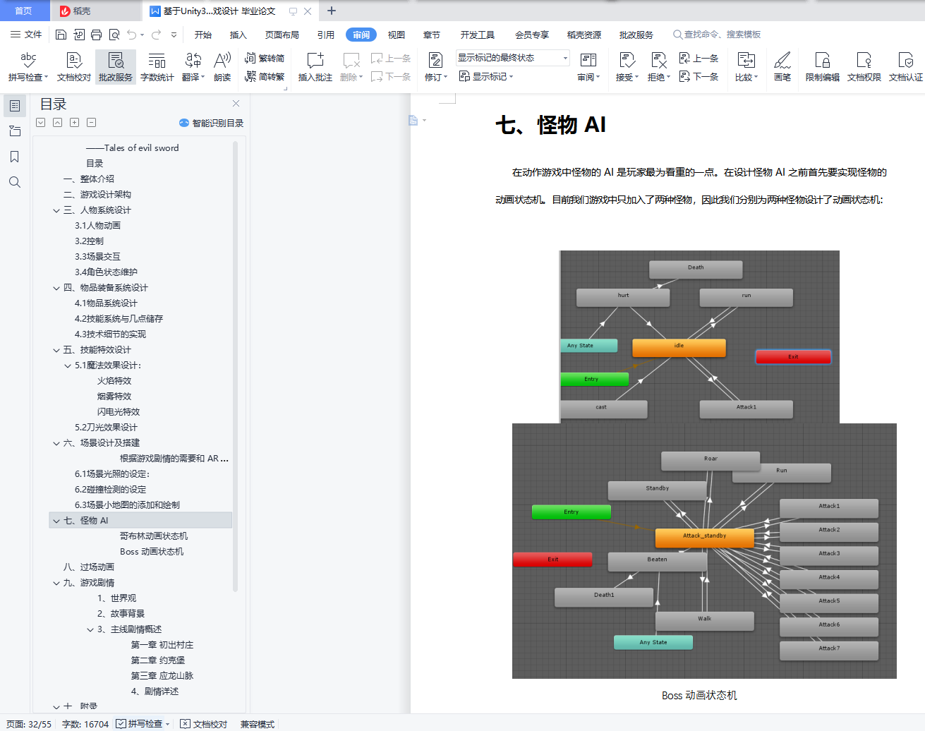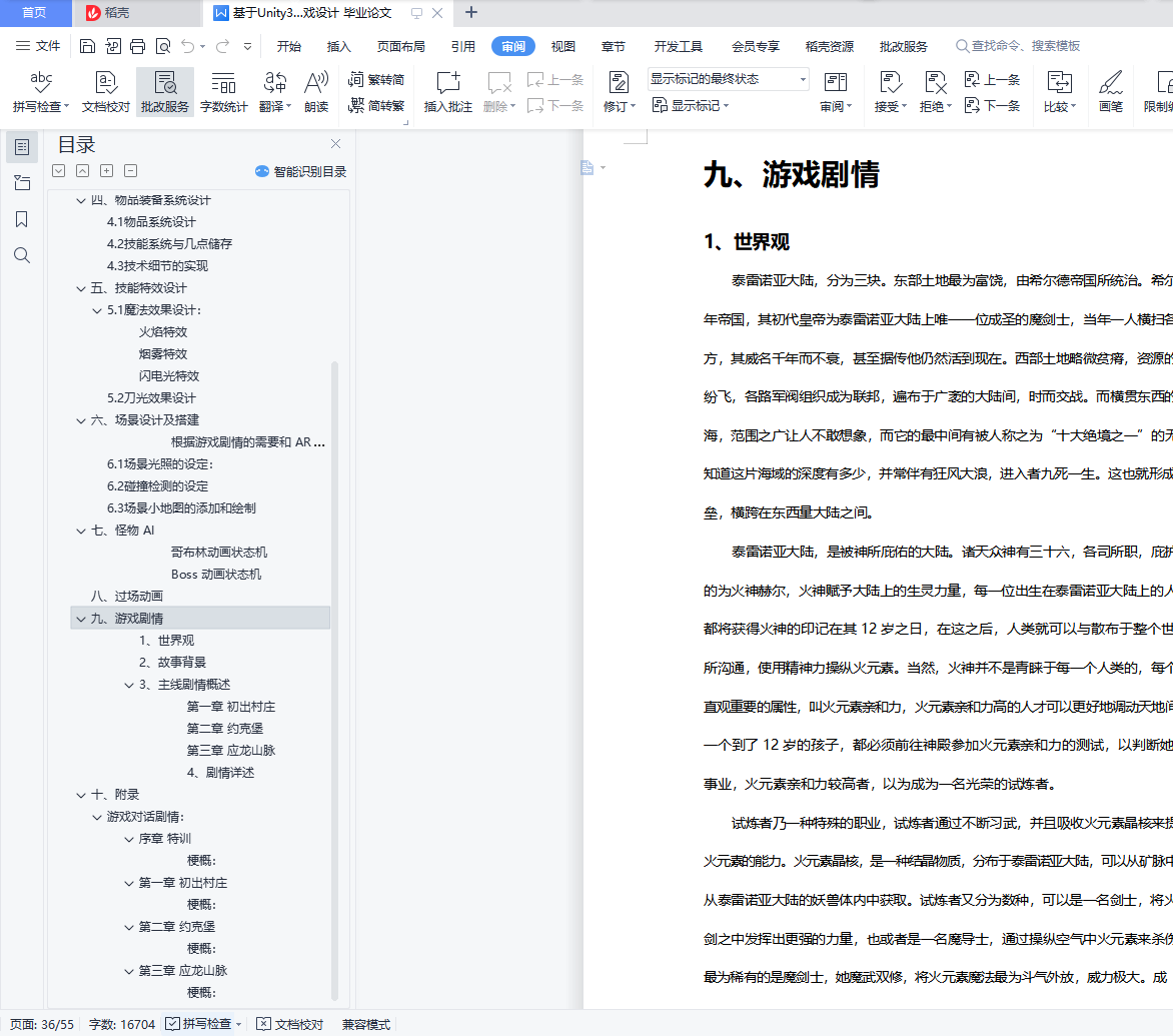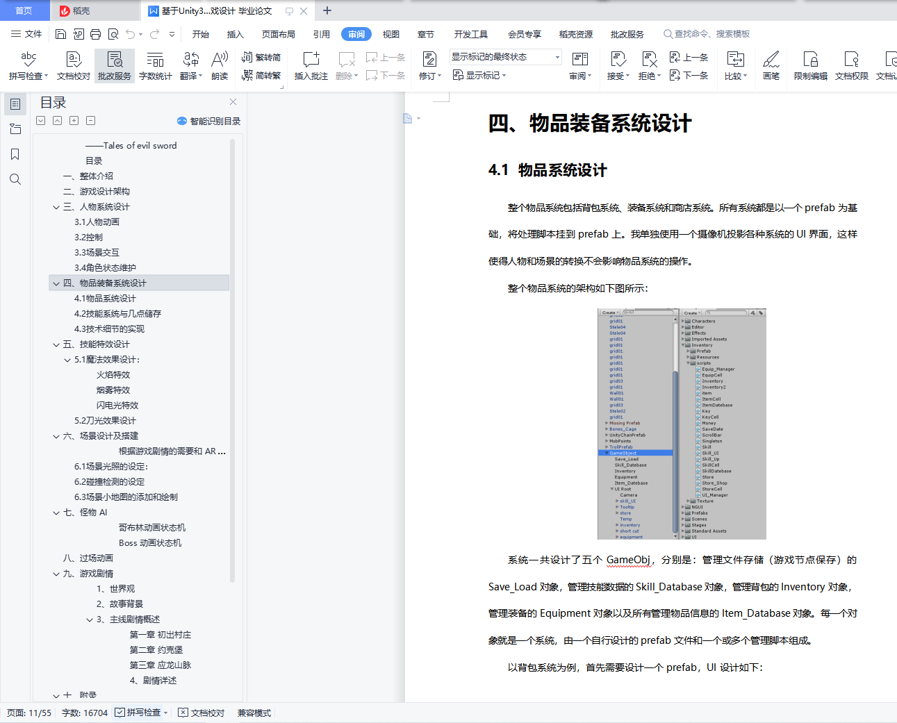 目录一、整体介绍 4二、游戏设计架构 5三、人物系统设计 63.1人物动画 63.2控制 73.3场景交互 83.4角色状态维护 10四、物品装备系统设计 114.1物品系统设计 114.2技能系统与几点储存 144.3技术细节的实现 15五、技能特效设计 195.1魔法效果设计: 195.2刀光效果设计 22六、场景设计及搭建 246.1场景光照的设定: 256.2碰撞检测的设定 266.3场景小地图的添加和绘制 27七、怪物 AI 32八、过场动画 34九、游戏剧情 36十、组员及分工 40十一、附录 41游戏对话剧情: 41一、整体介绍本作是一款西式魔幻风格的动作角色扮演游戏(ARPG),主要以传说系列、伊苏系列等经典 RPG 游戏的感觉和理念而创作。游戏故事主要讲述的是一名魔剑士少女提拉米苏在偶然得知自己的身世后,为了寻找杀害双亲的凶手,在泰雷诺亚大陆上不断冒险、不断成长的故事。游戏采用 Unity3D 引擎制作,以有趣的人物剧情和爽快的动作打击感为主要卖点, 并包含了丰富的物品、技能系统,酷炫的场景,能带给玩家丰富的游戏体验。