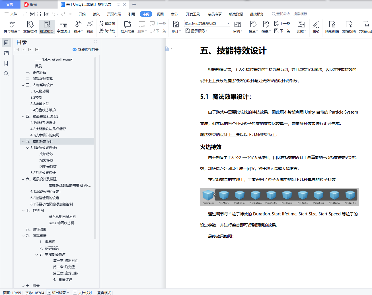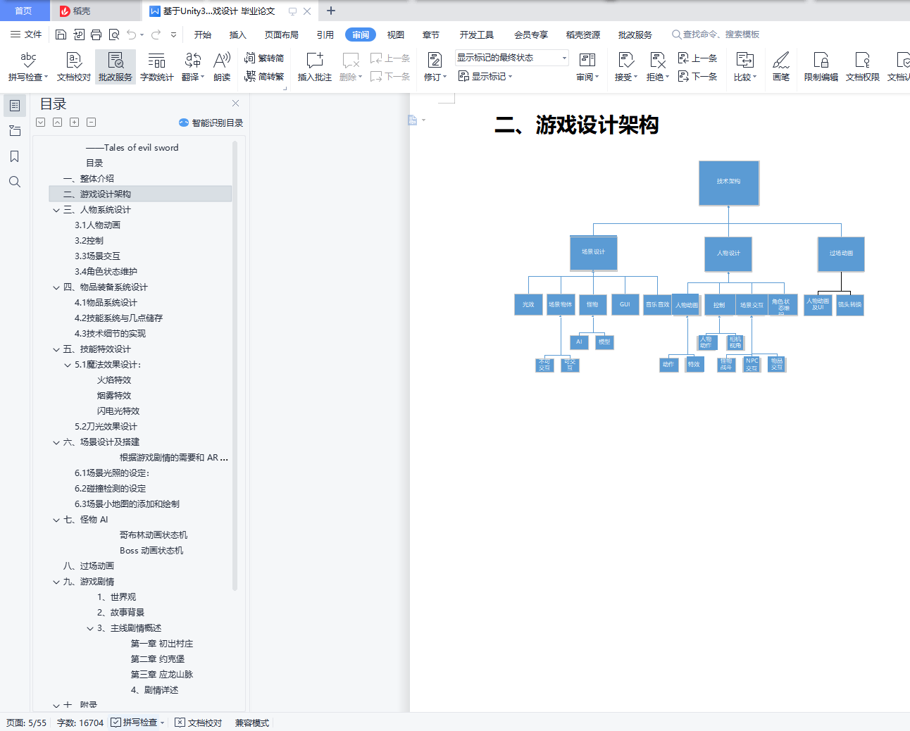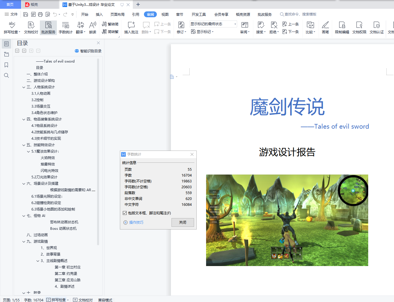 目录一、整体介绍 4二、游戏设计架构 5三、人物系统设计 63.1人物动画 63.2控制 73.3场景交互 83.4角色状态维护 10四、物品装备系统设计 114.1物品系统设计 114.2技能系统与几点储存 144.3技术细节的实现 15五、技能特效设计 195.1魔法效果设计: 195.2刀光效果设计 22六、场景设计及搭建 246.1场景光照的设定: 256.2碰撞检测的设定 266.3场景小地图的添加和绘制 27七、怪物 AI 32八、过场动画 34九、游戏剧情 36十、组员及分工 40十一、附录 41游戏对话剧情: 41一、整体介绍本作是一款西式魔幻风格的动作角色扮演游戏(ARPG),主要以传说系列、伊苏系列等经典 RPG 游戏的感觉和理念而创作。游戏故事主要讲述的是一名魔剑士少女提拉米苏在偶然得知自己的身世后,为了寻找杀害双亲的凶手,在泰雷诺亚大陆上不断冒险、不断成长的故事。游戏采用 Unity3D 引擎制作,以有趣的人物剧情和爽快的动作打击感为主要卖点, 并包含了丰富的物品、技能系统,酷炫的场景,能带给玩家丰富的游戏体验。