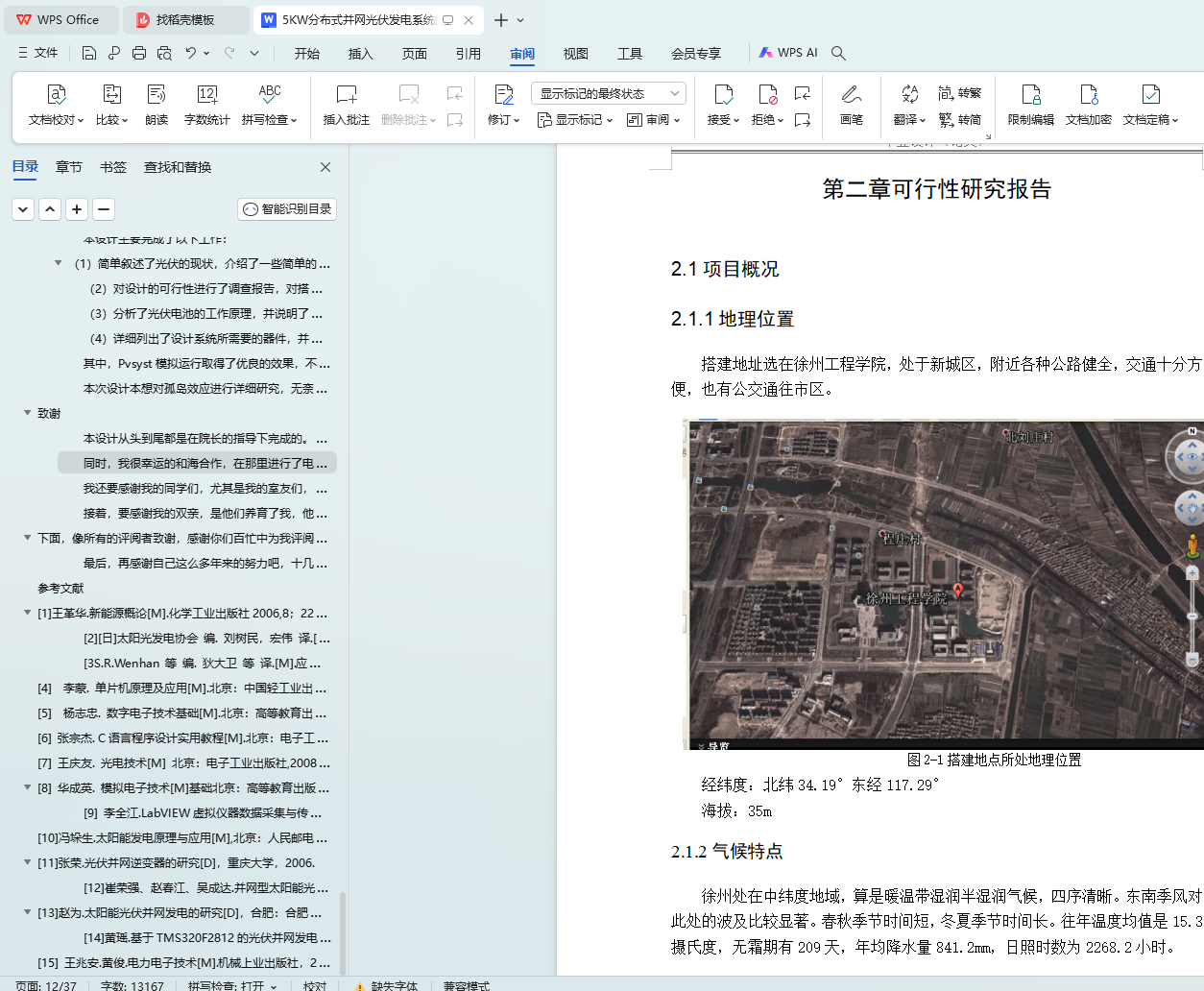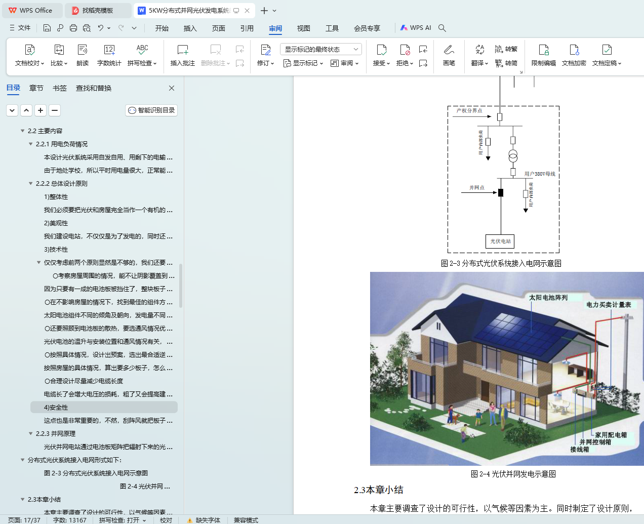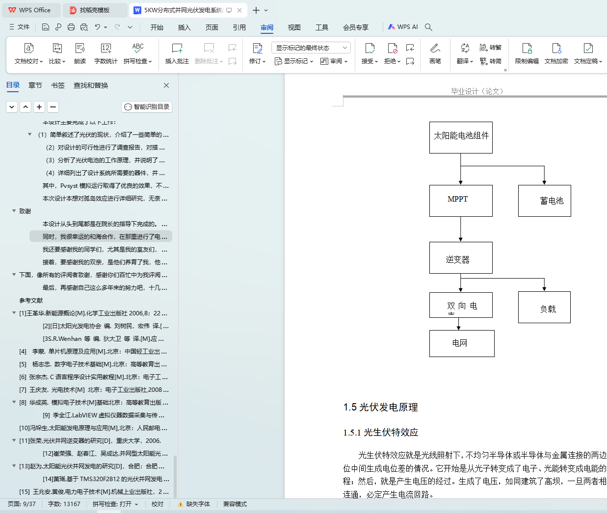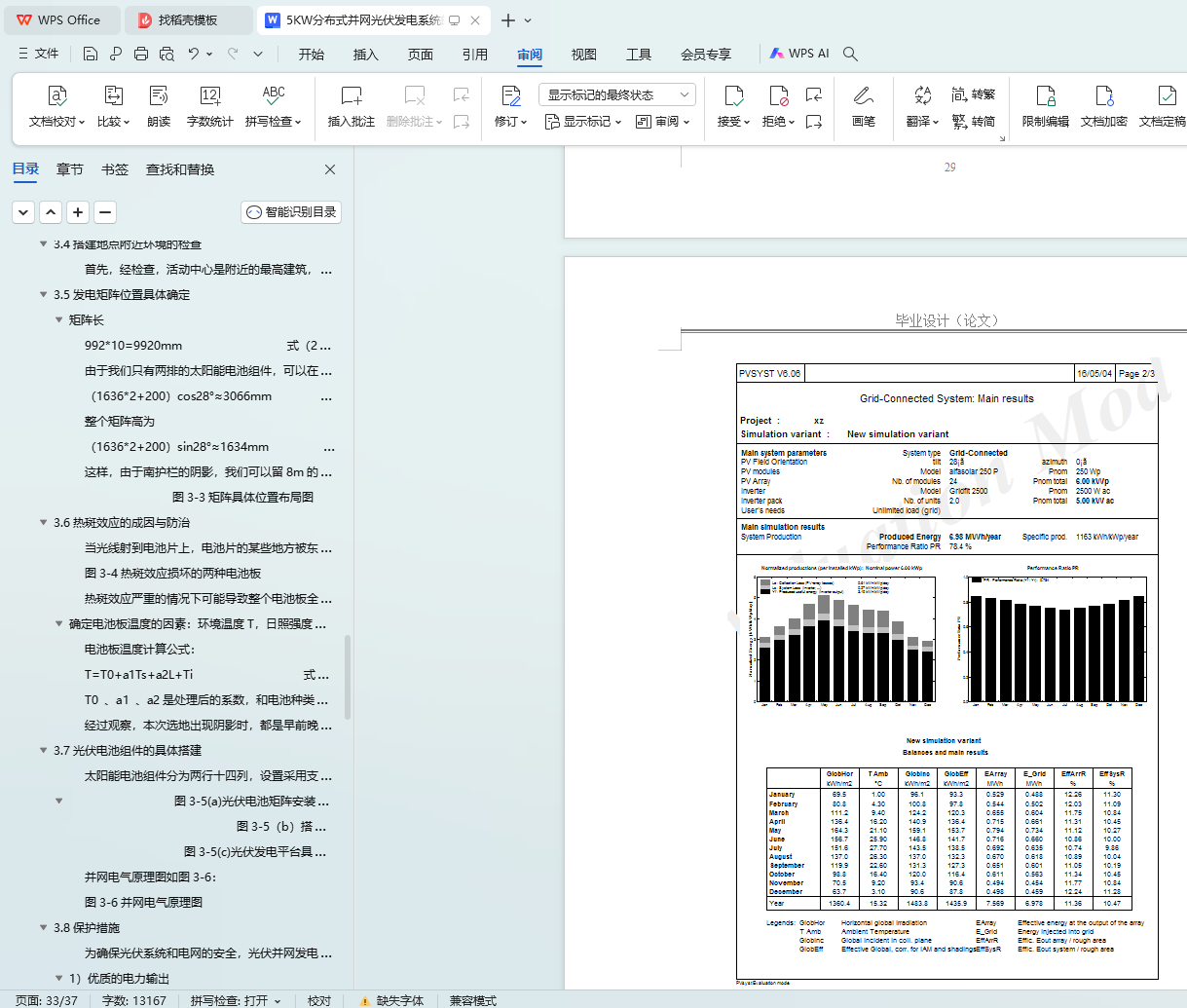 论文以完成5KW分布式并网光伏系统的设计为主,同时选定了具体所需要的器件。(1)首先简单叙述了光伏行业的背景以及国内外的发展状况。由于能源危机的日益严峻,寻找绿色能源已经成为解决能源危机的唯一方法。在这样的环境下,太阳能必定会得到巨大的发展。(2)然后对本次设计的可行性进行了调查报告,调查了地理、气候、用电等等的各方面因素,并且简述了并网的原理。(3)接着设计并模拟出5KW分布式并网光伏发电系统,顺利完成并网发电。研究了太阳仰角与方位角对阴影的影响以及热斑效应,并制定了各种保护措施。最终选出了搭建地点,设计出搭建方案。(4)最后对系统的主要设备进行了选定,并列举了出来,最终通过PVsyst模拟运行出设计结果。