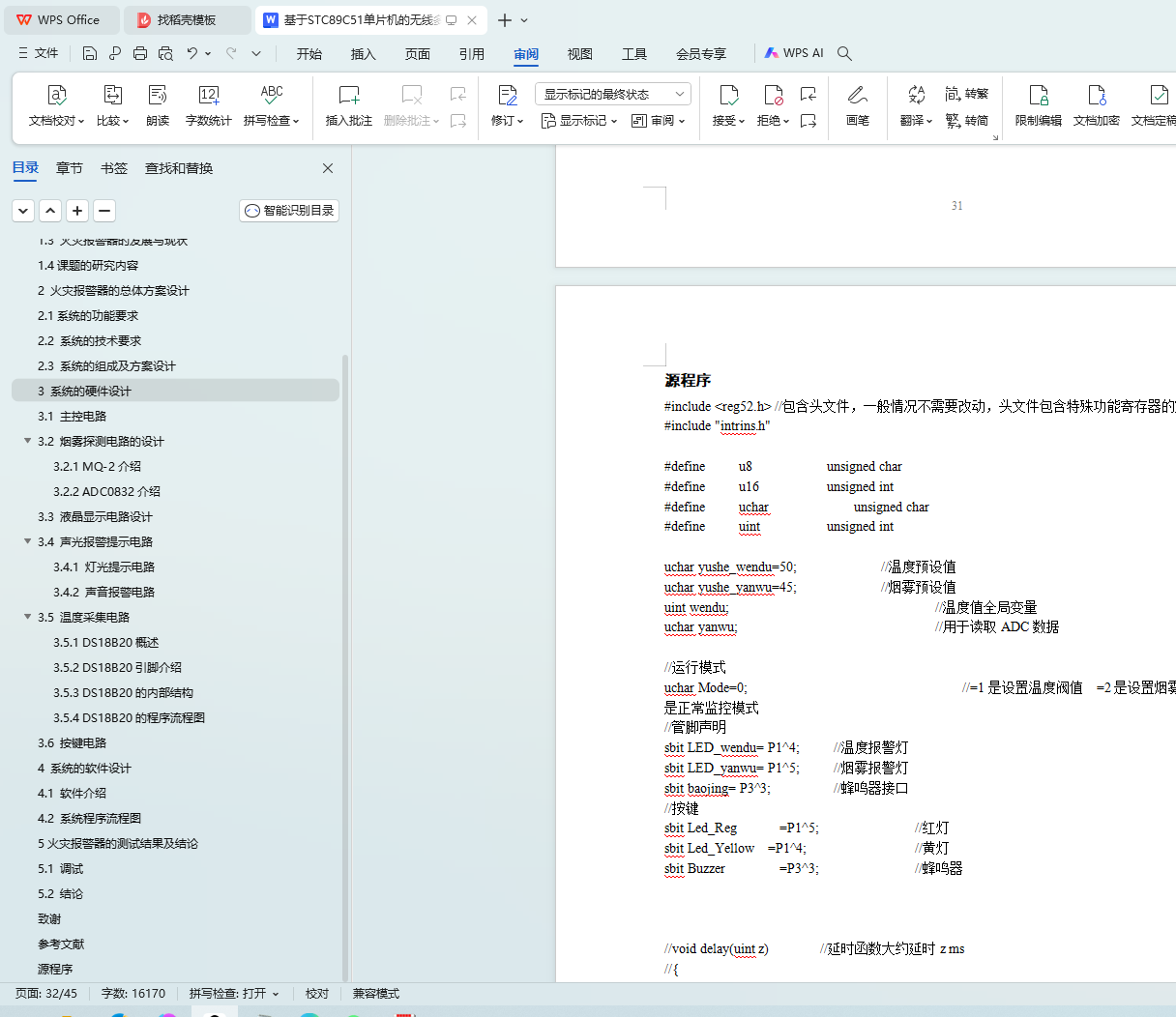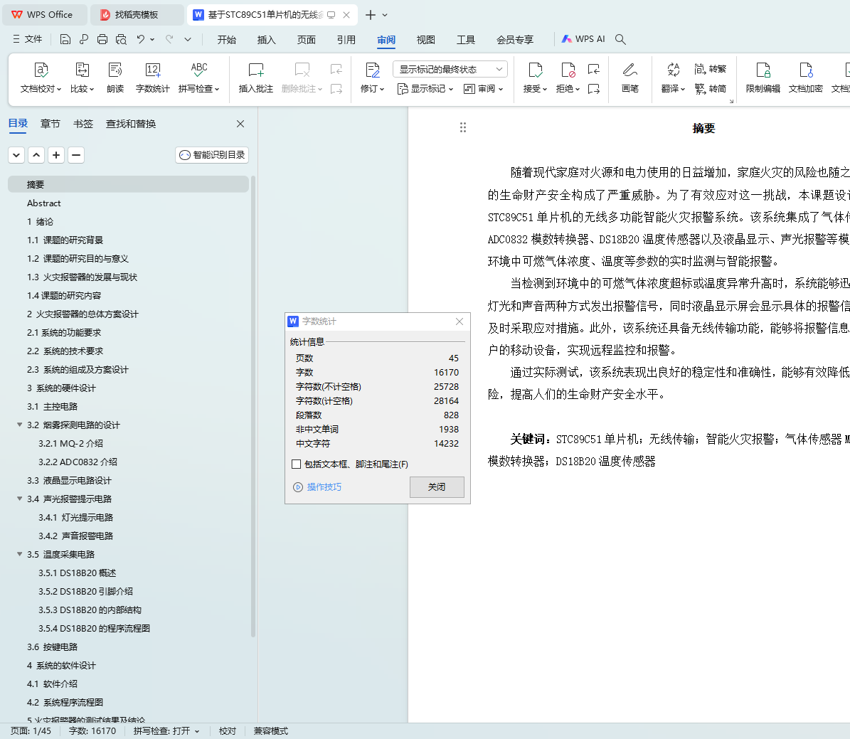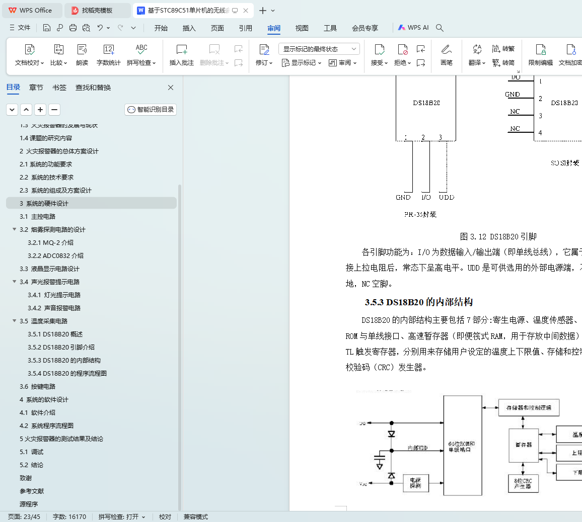 关键词:STC89C51单片机;无线传输;智能火灾报警;气体传感器MQ-2;ADC0832模数转换器;DS18B20温度传感器